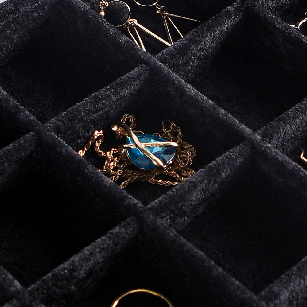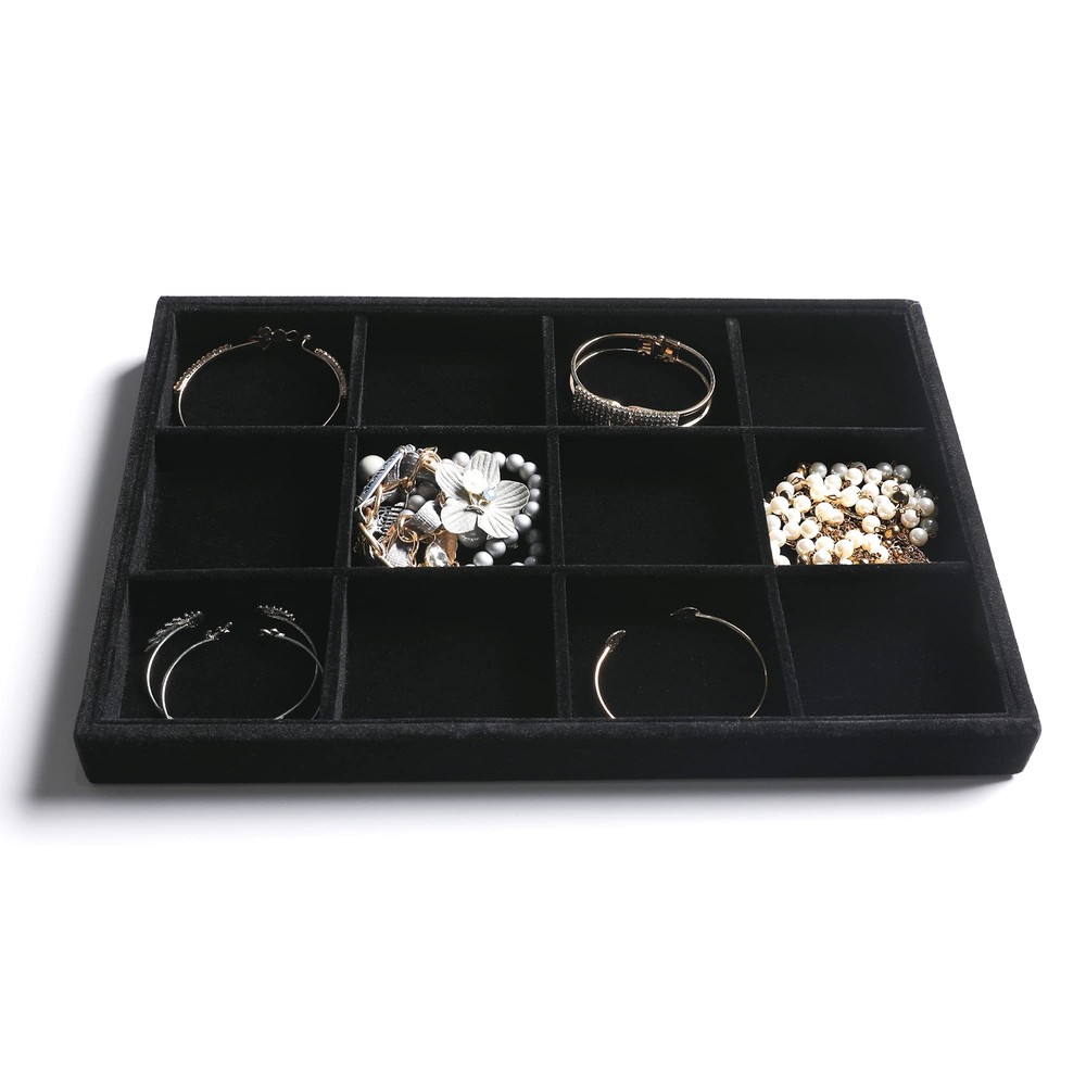 SET OF 2: The set includes 2 trays,12 Compartment Tray(1 pc) and 24 Compartment Tray(1 pc),Each tray measures 12.5x8.5x1.2,Convenient and roomy enough for you to store and wear your different jewelry. HIGH QUALITY VELVET MATERIAL: Our products are full covered with high-quality velvet,which feels smooth, looks elegant and soft enough to protect your jewelry from scratches and damage. STACKABLE AND ADJUSTABLE: Our jewelry trays can be stacked, easy to put on the dressing table or drawer, the dividers of the 12 grid and 24 grid trays are easy to remove to fit for your different size jewelry, Easy to organize and save space. SUITABLE FOR MULTIPLE SCENARIOS:You can put it on the dressing table or drawer to organize your personal jewelry like earrings, necklaces, bracelets, rings, brooches, pins, watches and so on., and it is also ideal for displaying a variety of beautiful jewelry in the jewelry store or trade shows. BEST GIFT:Such a practical and elegant jewelry tray is definitely a ideal gift for Anniversary,Mother’s Day,Birthday, Thanksgiving, Christmas to your girlfriend, wife, daughter, mother or any other important female in your life.