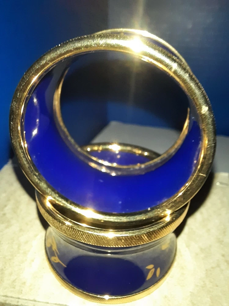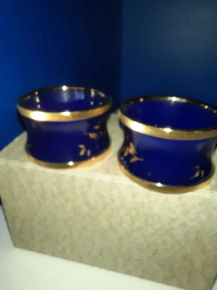 This pair of napkin rings are cobalt blue enameling over metal (battersea type). There are no scratches or dents on them and make a beautiful table setting for a couple who enjoys nice things. Thanks for looking.