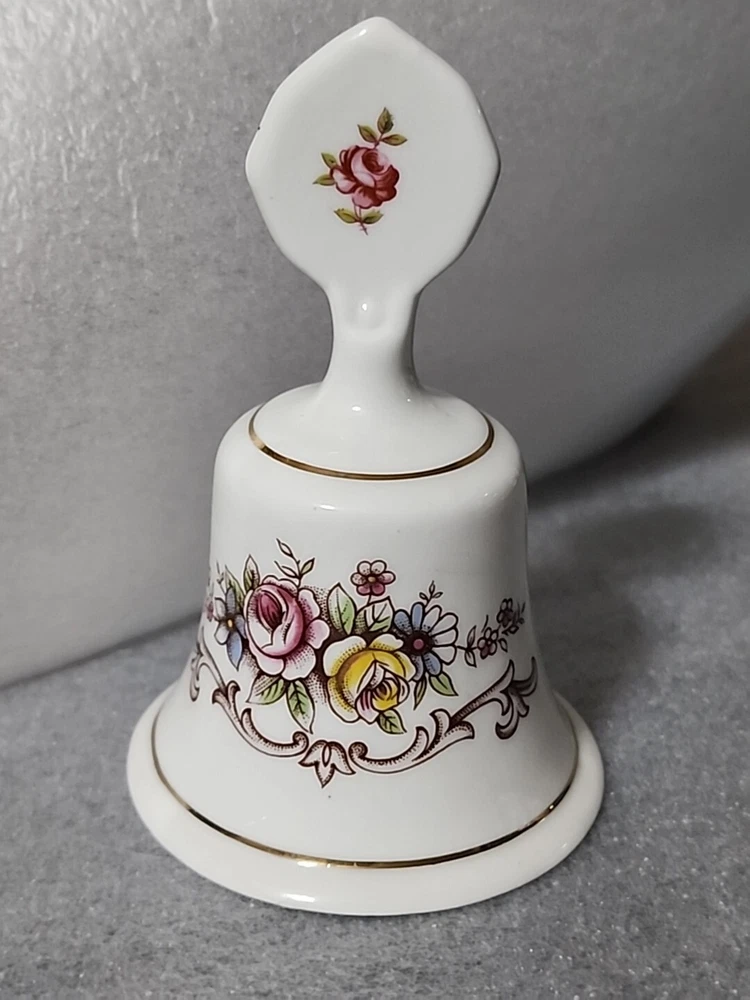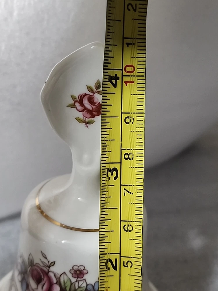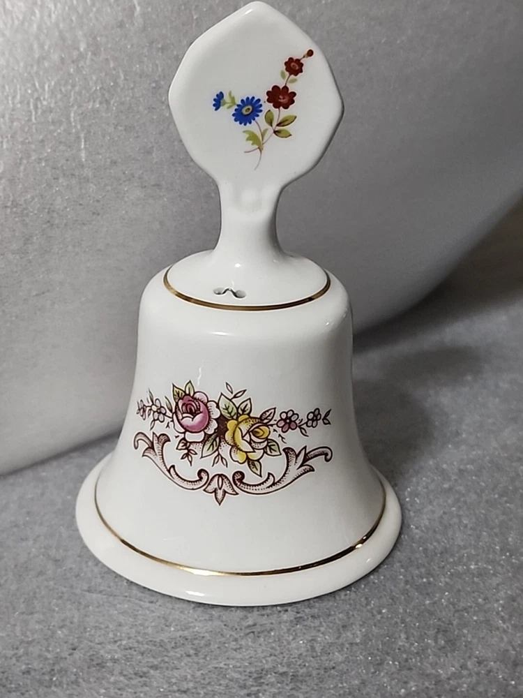Bell is Pre-owned. Has a pretty soft tone floral design. Green blue pink and yellow. Has gold trim , clapper is metal. Has stamp inside. Please view photos and other listings thank you