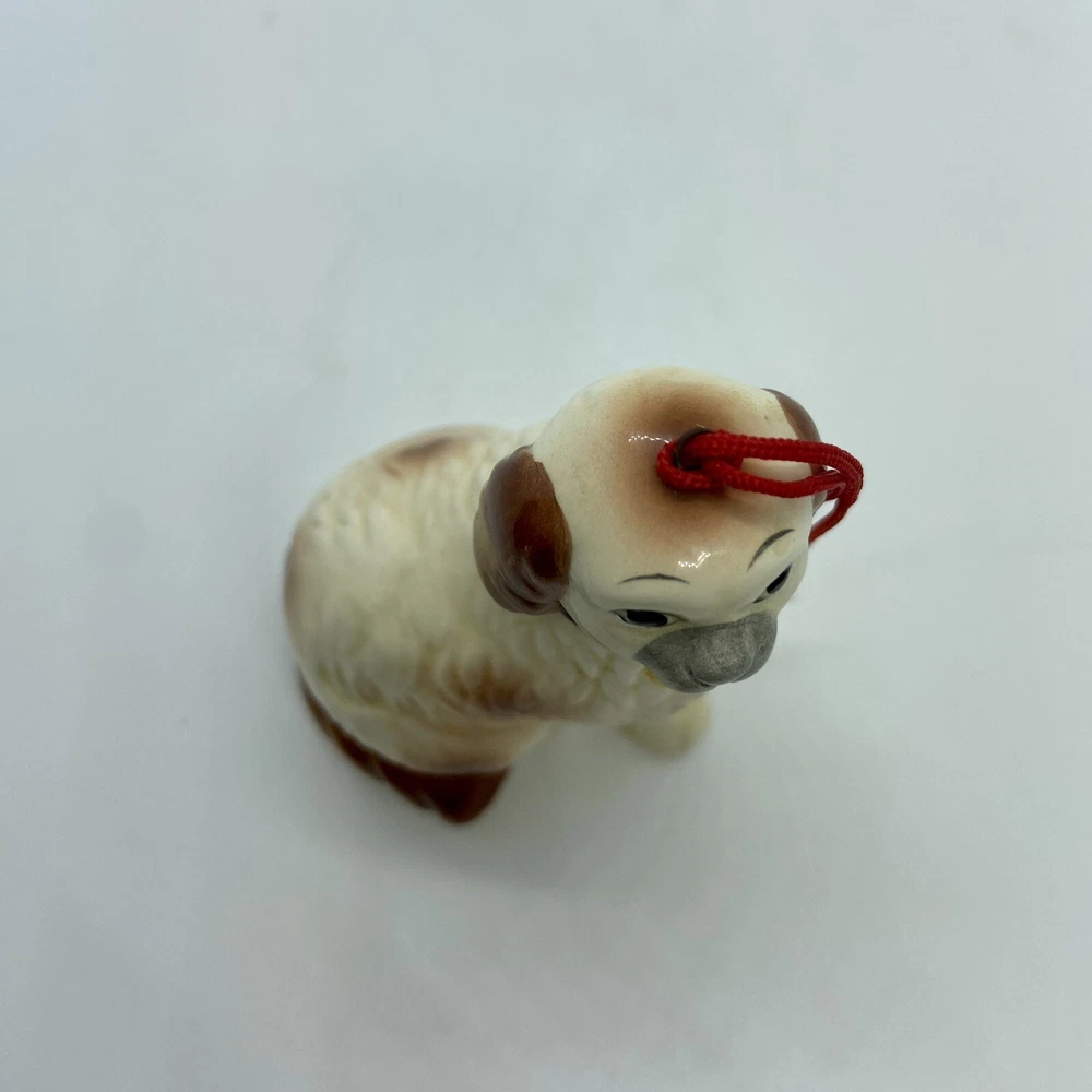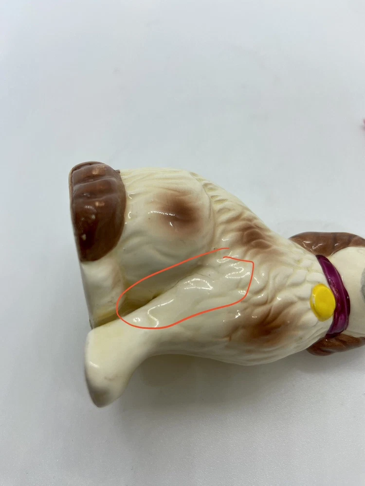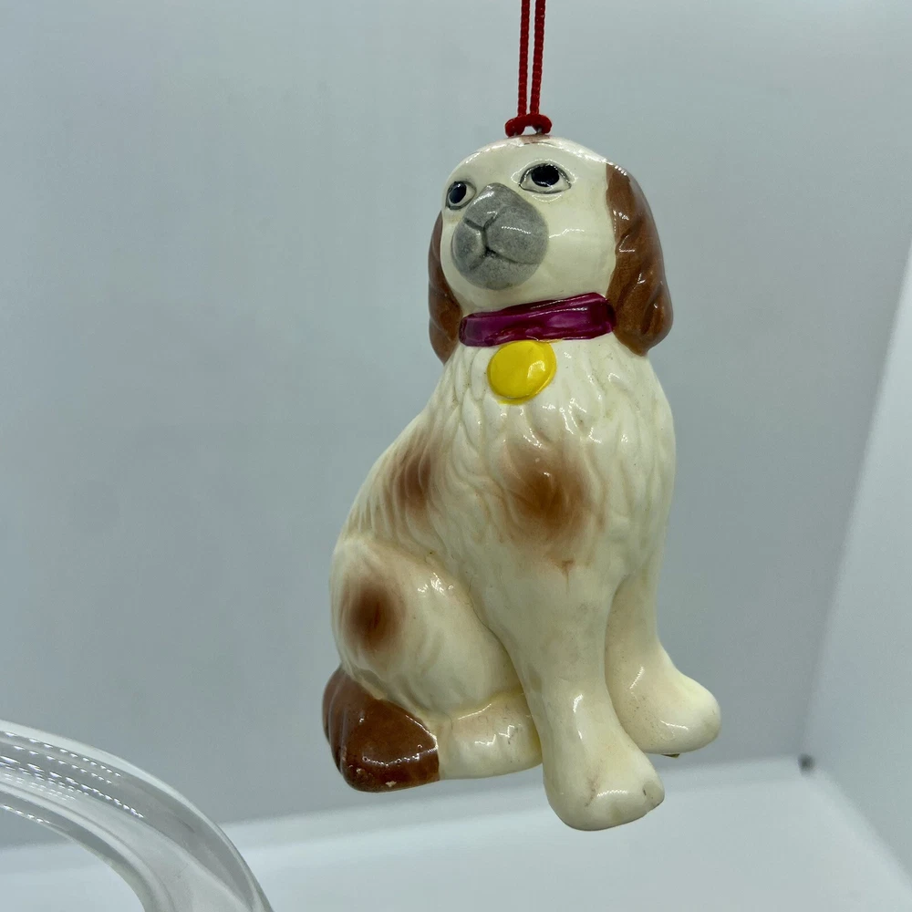 Staffordshire Style Dog Christmas Ornament Cavalier King Charles White and Rust. In good pre owned condition. A hairline crack is pictured. See photos for details.