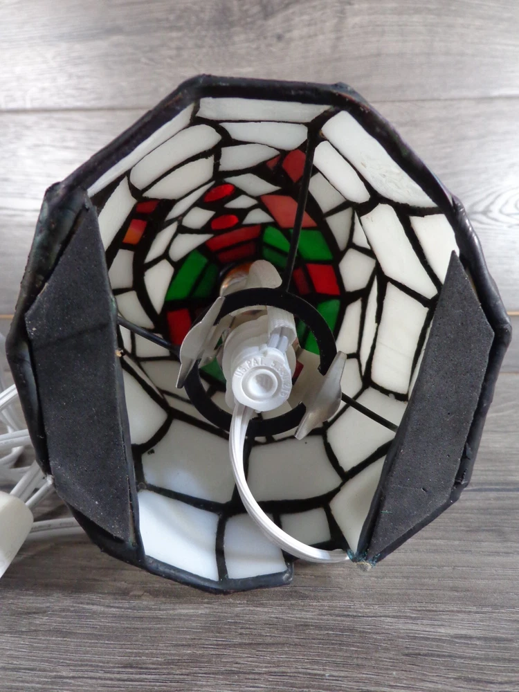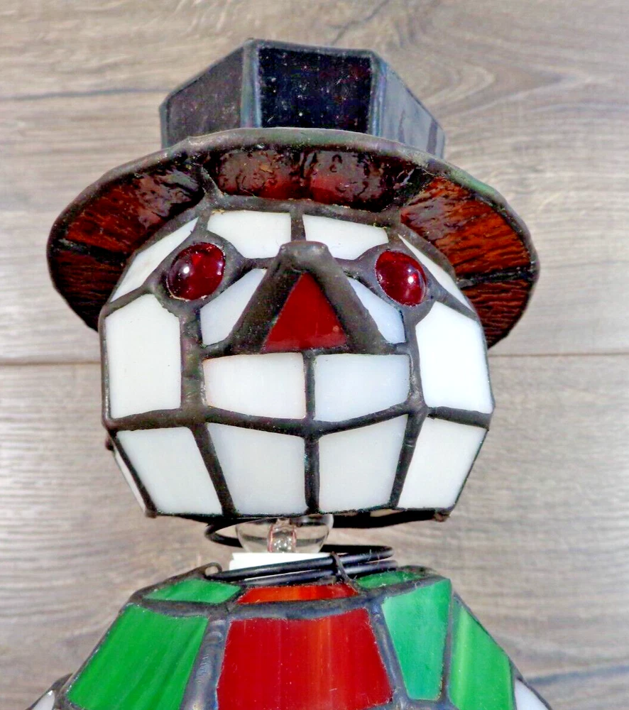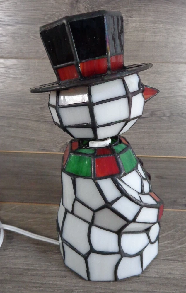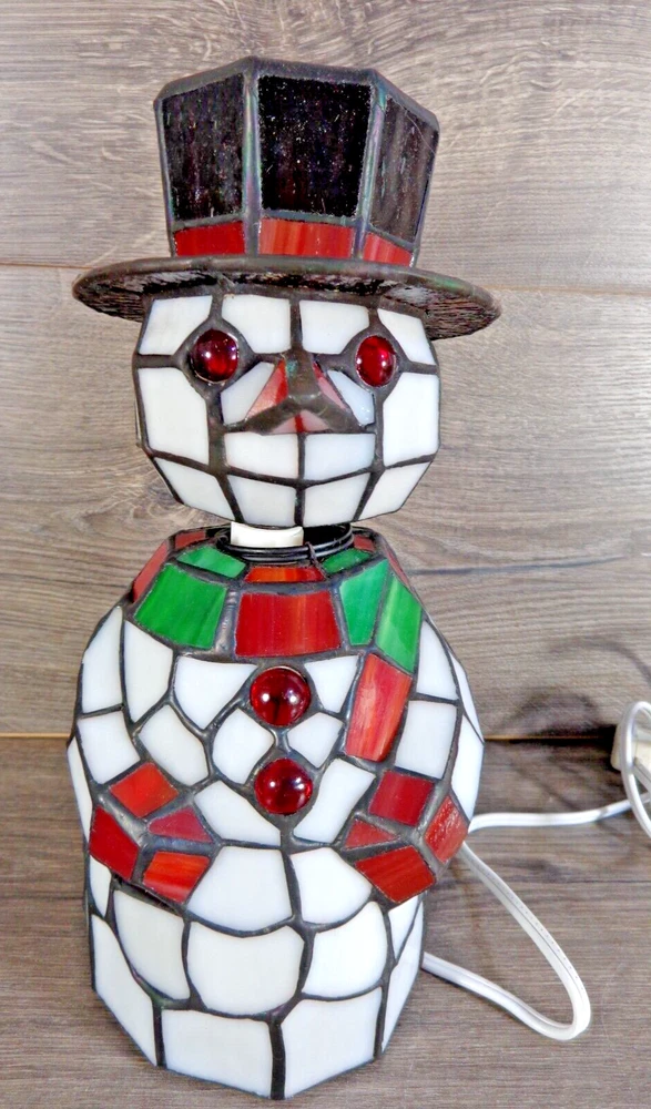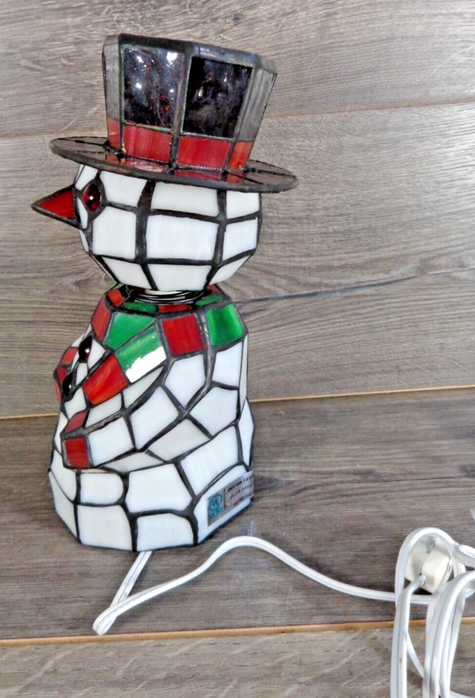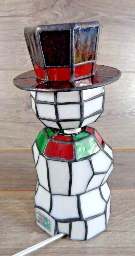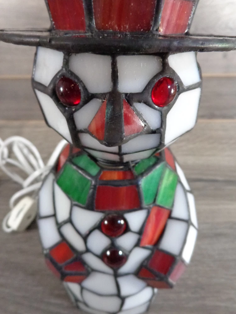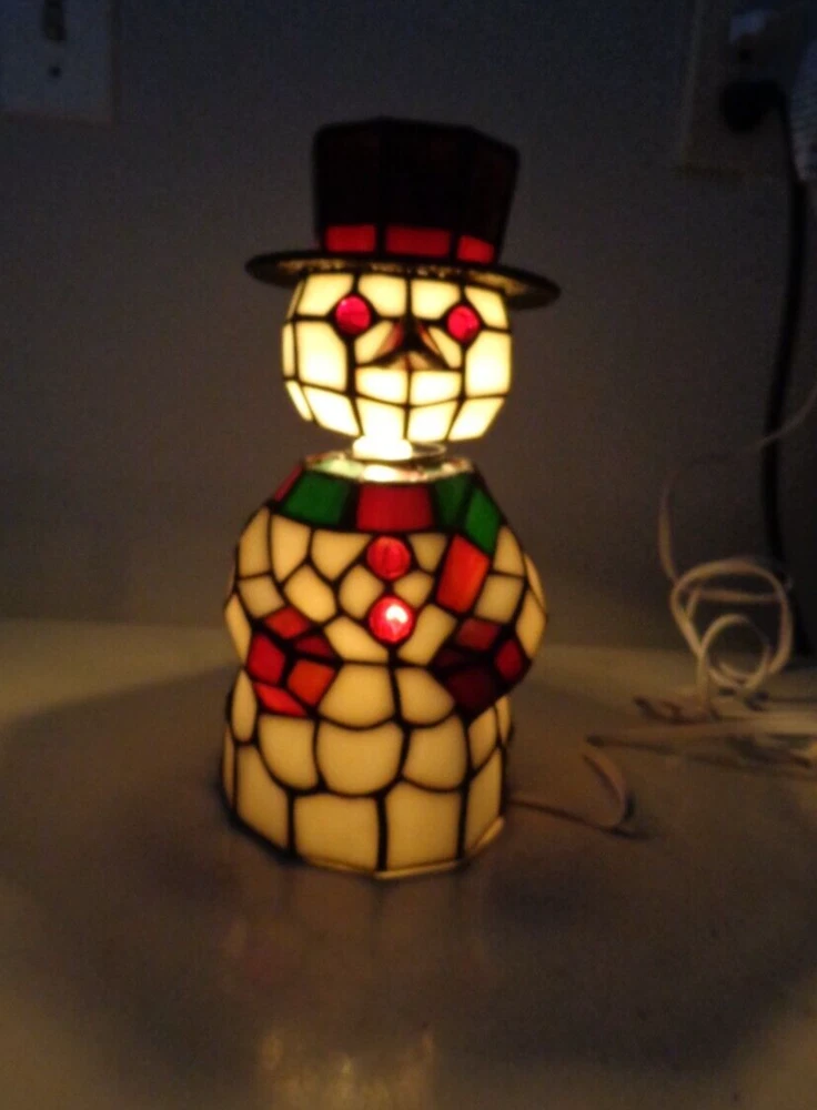 Nice stained glass snowman bobble head accent lamp. Measures approximately 10" tall. In great working condition. All glass intact and in very good condition. Uses 2 nightlight bulbs - included. Please feel free to contact me with any questions.