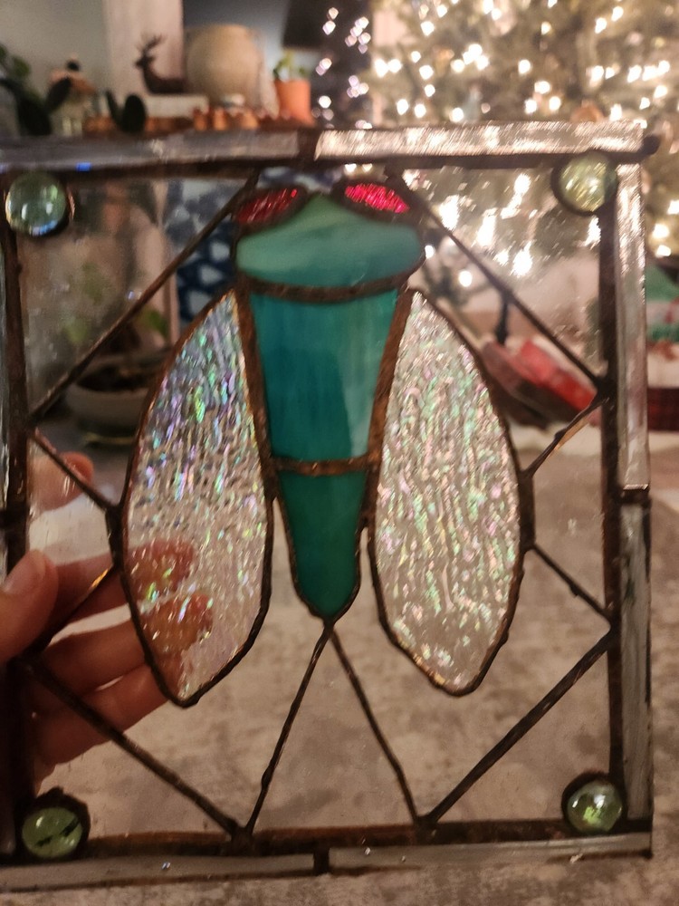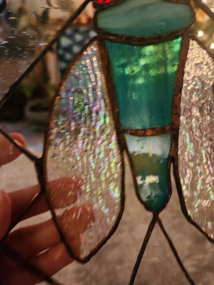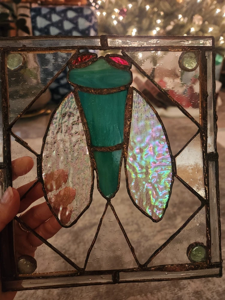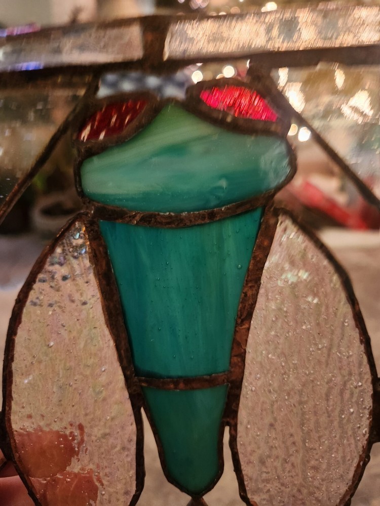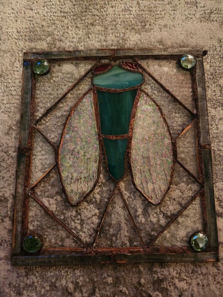 Handmade Stained Glass Cicada Suncatcher With Irridescent Wings & Copper Solder