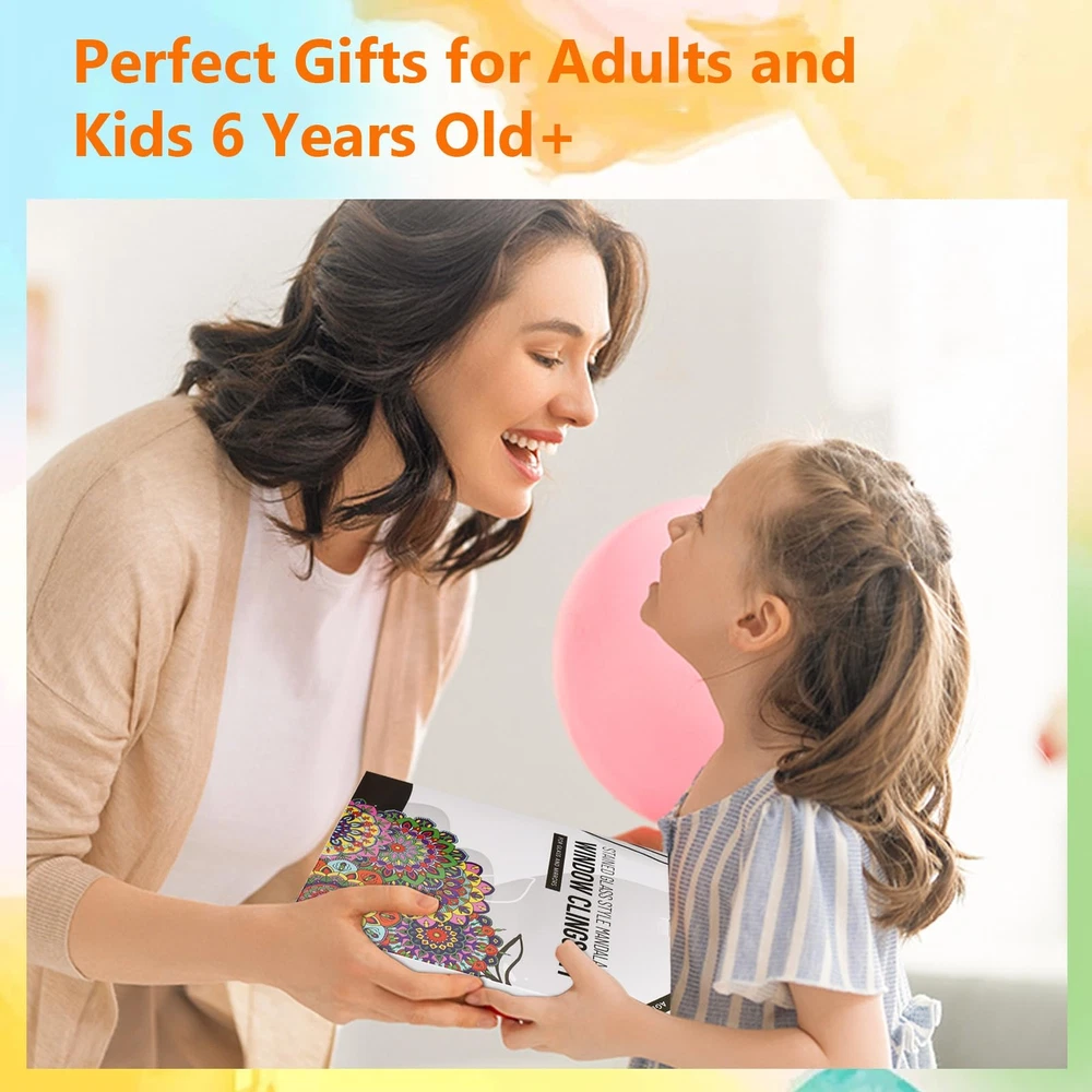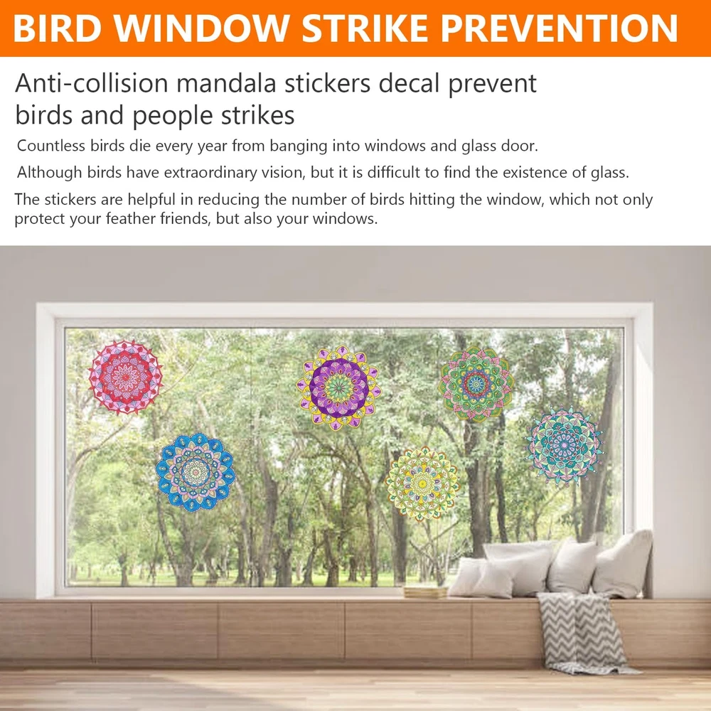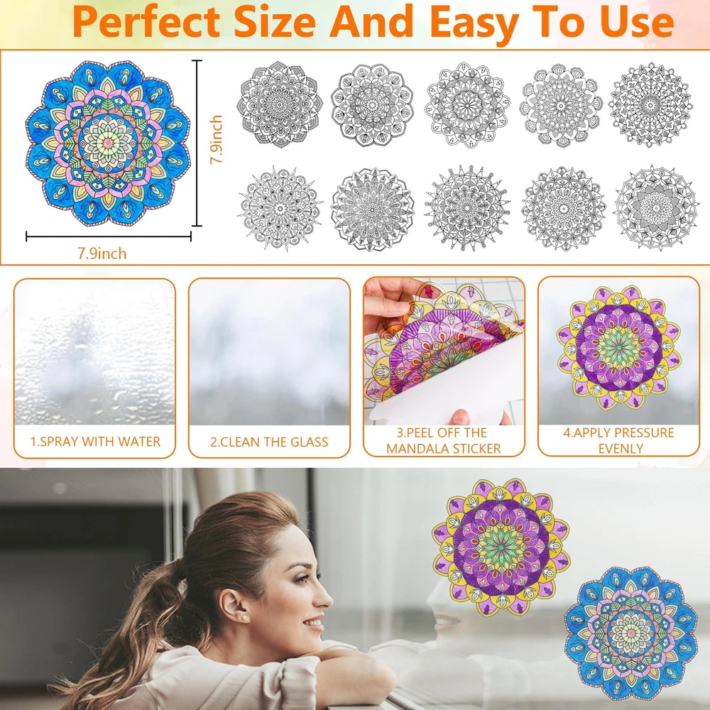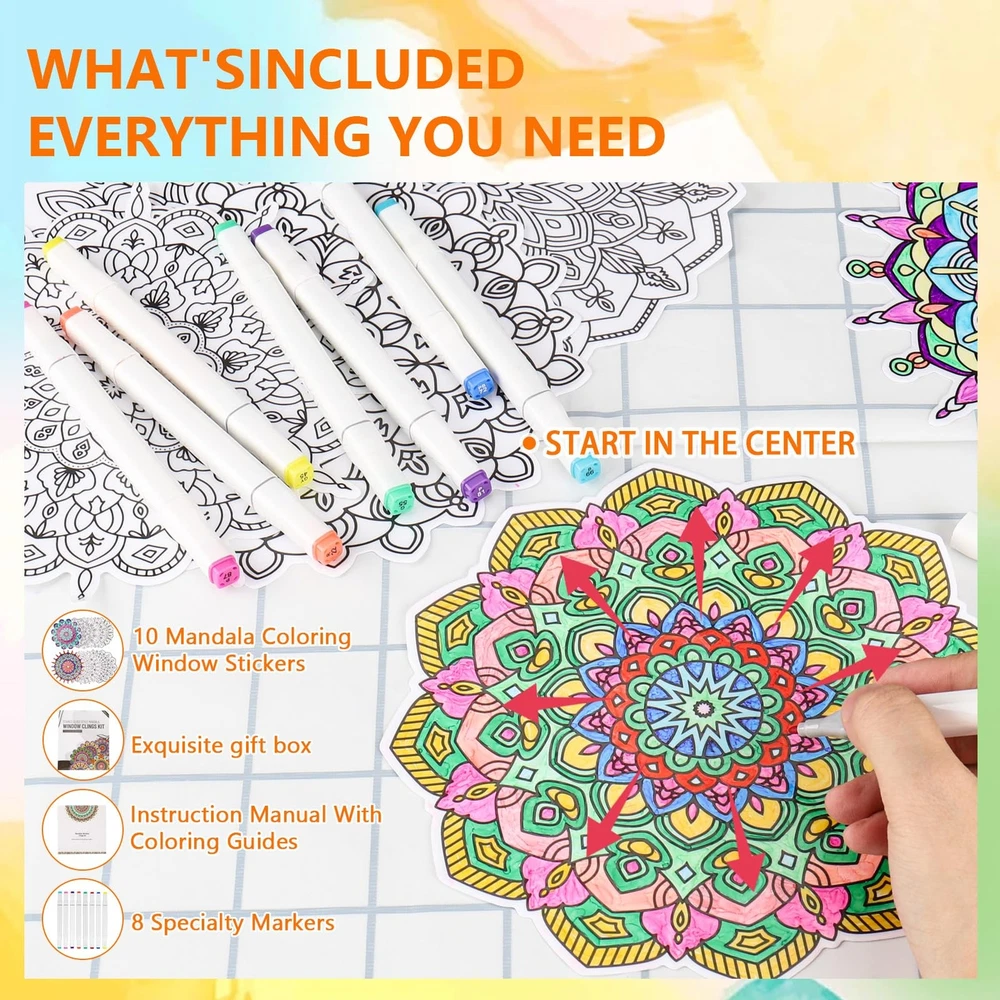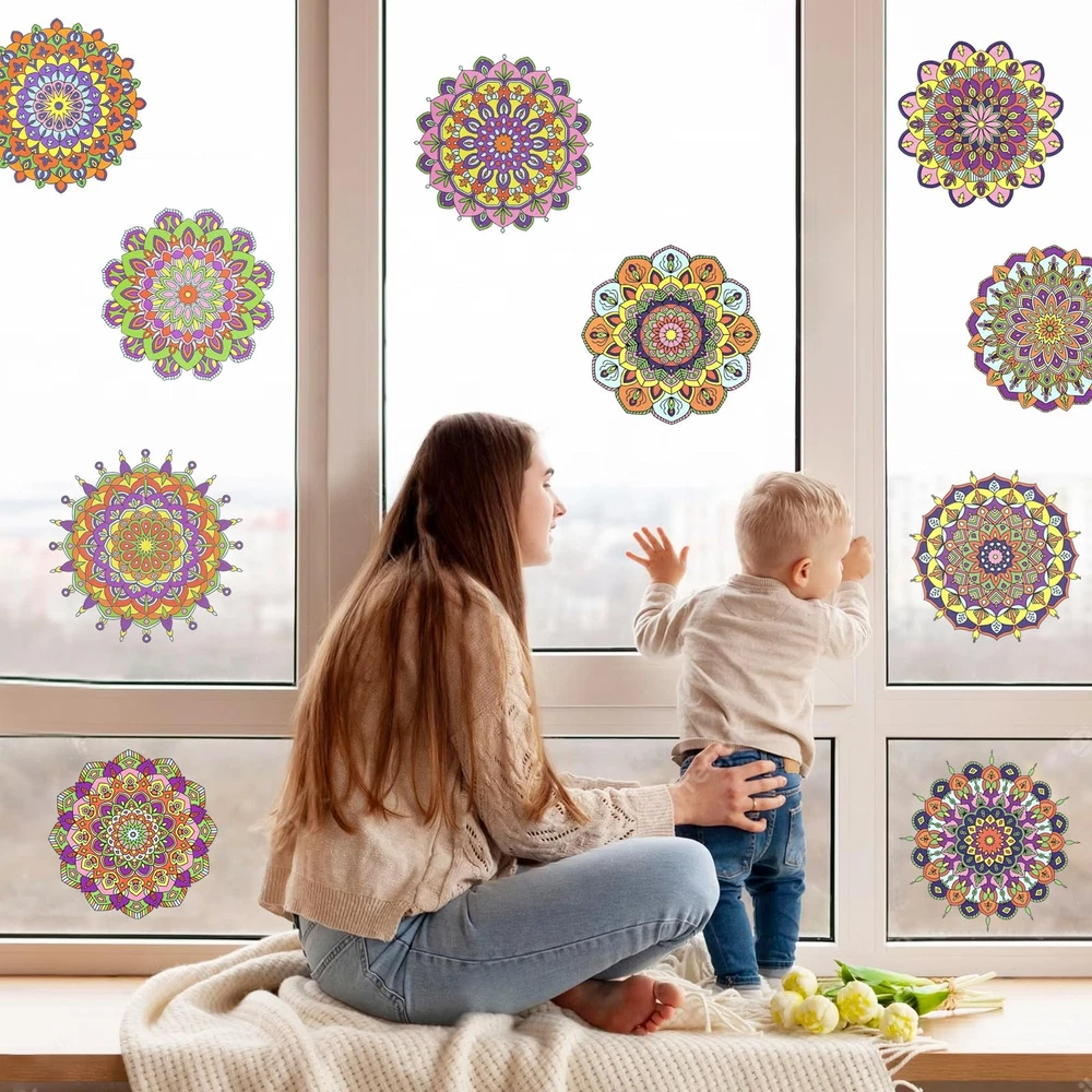 Mandala Anti-Collision Decal -Window Decal to Protect Wild Birds from Glass Collisions Countless birds die every year from banging into windows and glass door. Although birds have extraordinary vision, but it is difficult to find the existence of glass. The stickers are helpful in reducing the number of birds hitting the window, which not only protect your feather friends, but also your windows. 🌞 MANDALA Window Clings: Brighten your windows with these decorative Indian style mandala's and add a bohemian theme to your room. 🌞 GLASS SAFETY : These beautiful colorful stained-glass effect window clings are great for window safety, stopped adults and children walking patio doors or birds flying into windows. 🌞 SIZE : Each Mandala is 7.9” round, with 10 Mandala Coloring designs per pack. Each design is contour cut around vibrant translucent colors. 🌞 STAINED GLASS : Having a luminous presence of stained glass, when the sun shines through our window cling mandalas, they bring streams of colored light into any room. 🌞 EASY APPLICATION :Static cling means no adhesive, just a fine spray of water to apply the clings to your windows. 🌞Adult and Kids Coloring Window Stickers with 10 fun, Simple, Easy and Relaxing Patterns Mandalas Coloring Pages with marker pen. 【Mandala Coloring Kit】You will get 10pcs 7.9-inch uncolored mandala window stickers, a coloring guide, 8 special marker pens. 【EASY CLEAN & NO MESS】Watch as the blank canvas turns into a colorful work of art! You can use some blending coloring techniques to add a more gradual contrast between each color and blank space. Or, simply fill out each space with the colors of your choice. Each mandala will come out unique and colorful!Decorate them on your favorite windows, glass, refrigerators, mirrors, or give them to your favorite people or friends as gifts. 【SAVE BIRDS】:Our window clings for bird strikes work as a bird strike deterrent,stop birds from hitting your slider glass doors.Mandala Circle Window Clings - Anti-Collision Window Decals to Save Birds from Window Collisions. 【RELIEF YOUR STRESS】:Develops intelligence, trains concentration, and can be used to heal anxiety disorders.Sit back and unwind while use your imagination to creat something beautiful. Our mandala window clings kit not only help you reduce stress and anxiety, but you can also make it with your family and friends and share a happy time. Not only that, when you DIY the mandala window cling art kit, it can improved motor skills, vision, sleep and focus. 【Explore Crafting Pleasure】:Stained Glass Mandala Art Kit - DIY Window Clings with Markers, 10 Suncatchers - Perfect Hobby for Adults, Kids, Teens & Seniors - Ideal Gift for Beginners, Women & Elderly. 【EASY CLEAN & NO MESS】These window cling stickers can be applied to glass doors,patio door,sliding glass door,make sure the glass surface is smooth and clean.Window stickers are made from static cling means no adhesive,just a fine spray of water to apply which means no lasting damage to your windows and these window decals remove easily to adjust placement
