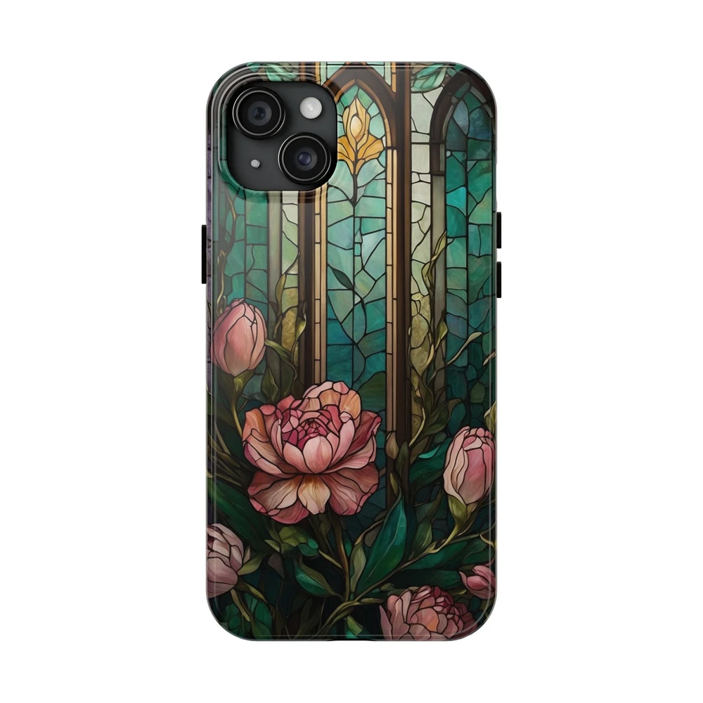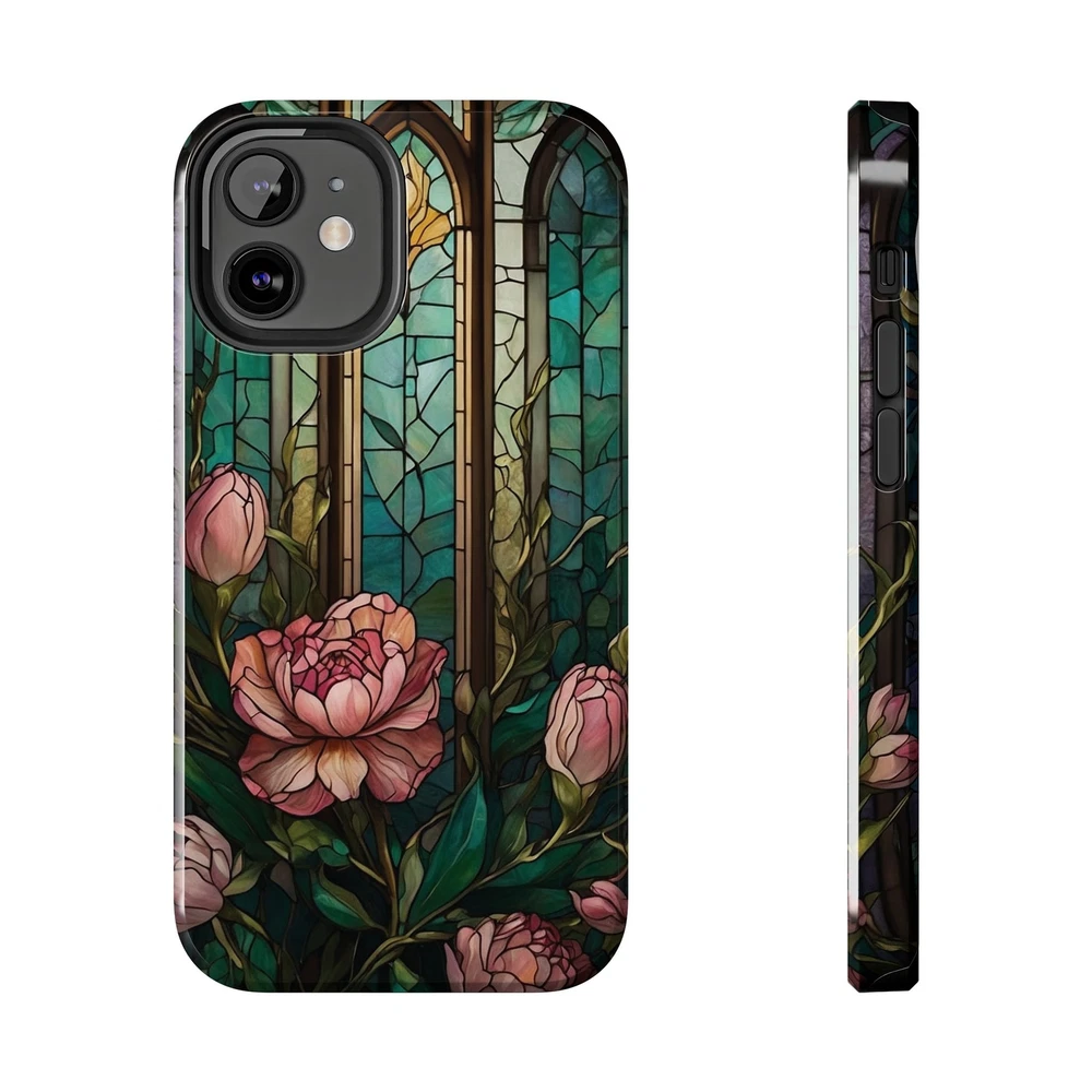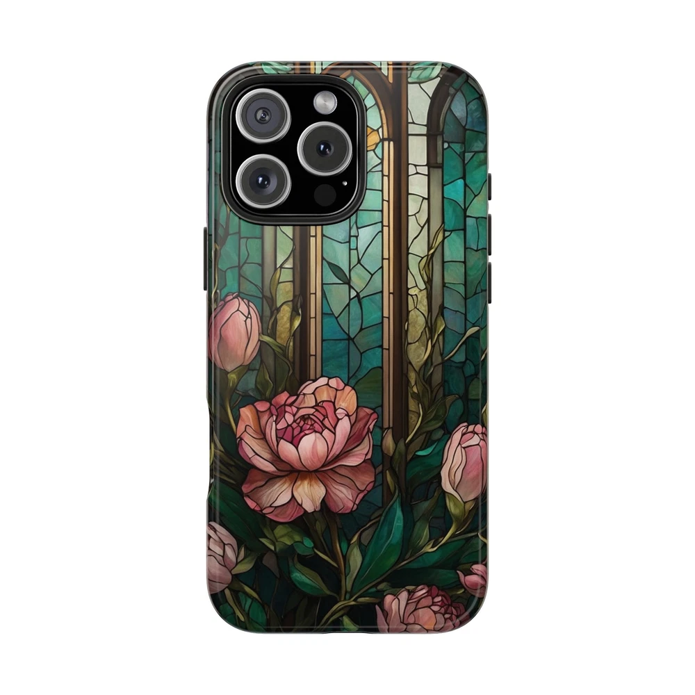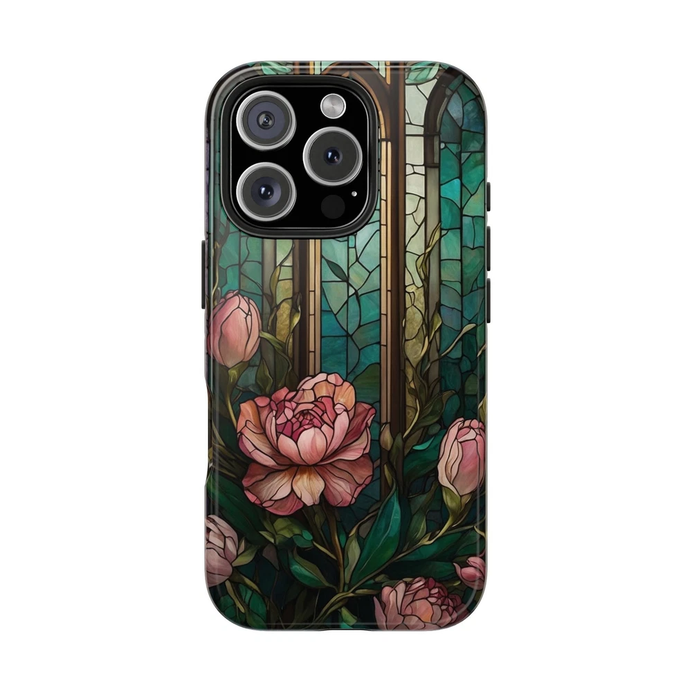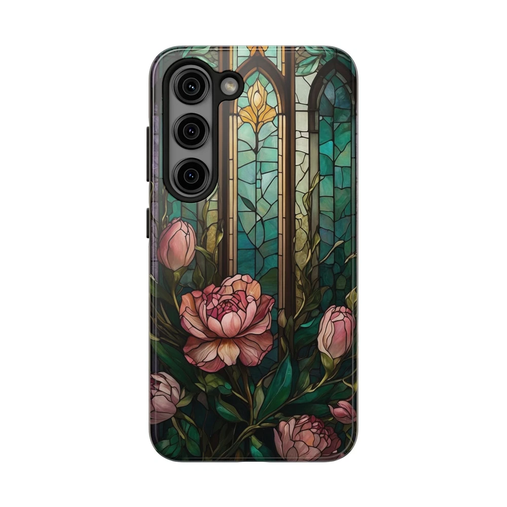 This Phone Case features a stained glass design with soft pink roses and intricate arches, creating a serene and majestic look. Perfect for those who appreciate elegant and spiritual aesthetics. Ideal for gifting on birthdays, Mother's Day, or as a thoughtful thank you gesture. Product features - Extremely strong and impact resistant Lexan plastic material - Lay-flat bezel for screen protection - Flexible rubber liner for shock absorption - Glossy finish with UV protection for long-lasting color - Supports wireless charging Care instructions - Clean with damp cotton or microfiber cloth. Add a drop of dish soap to the cloth if needed.