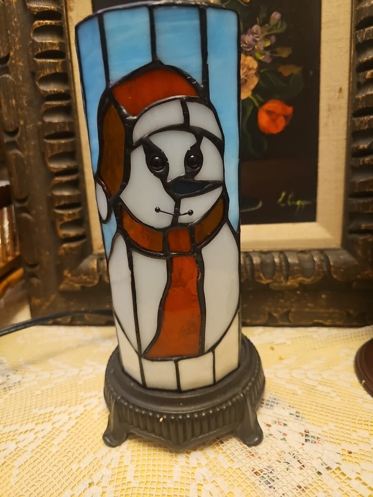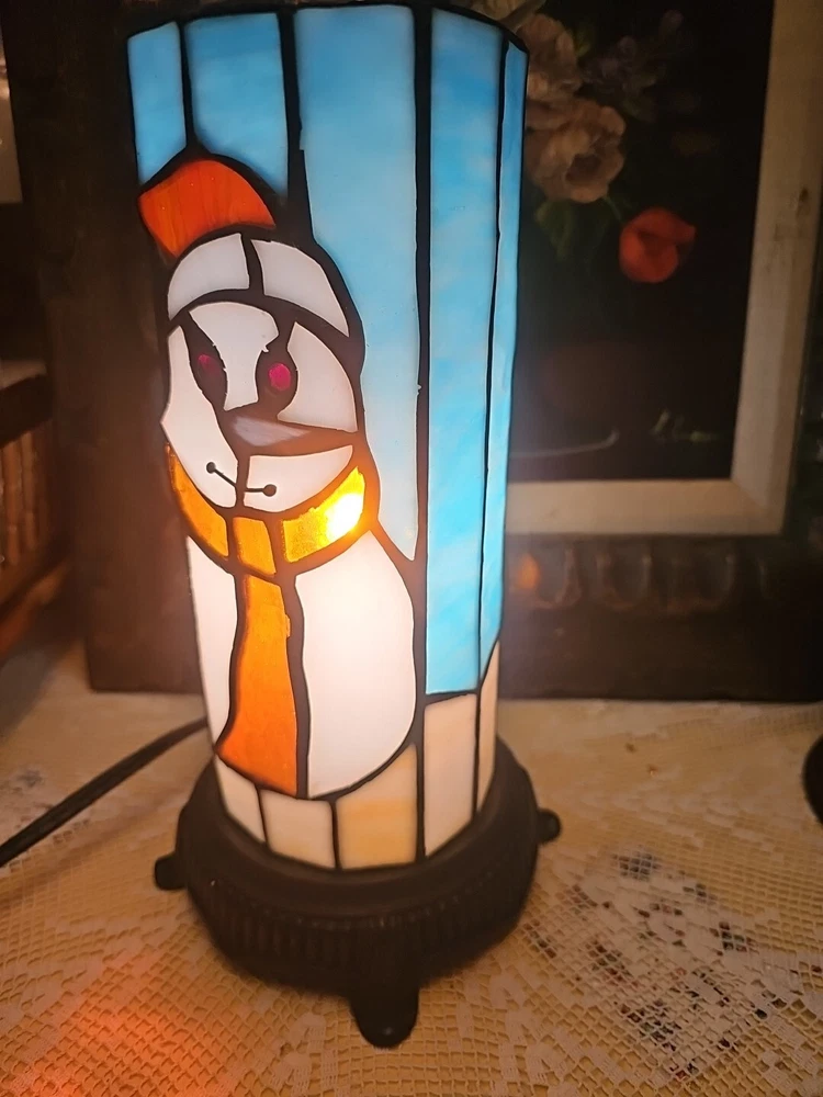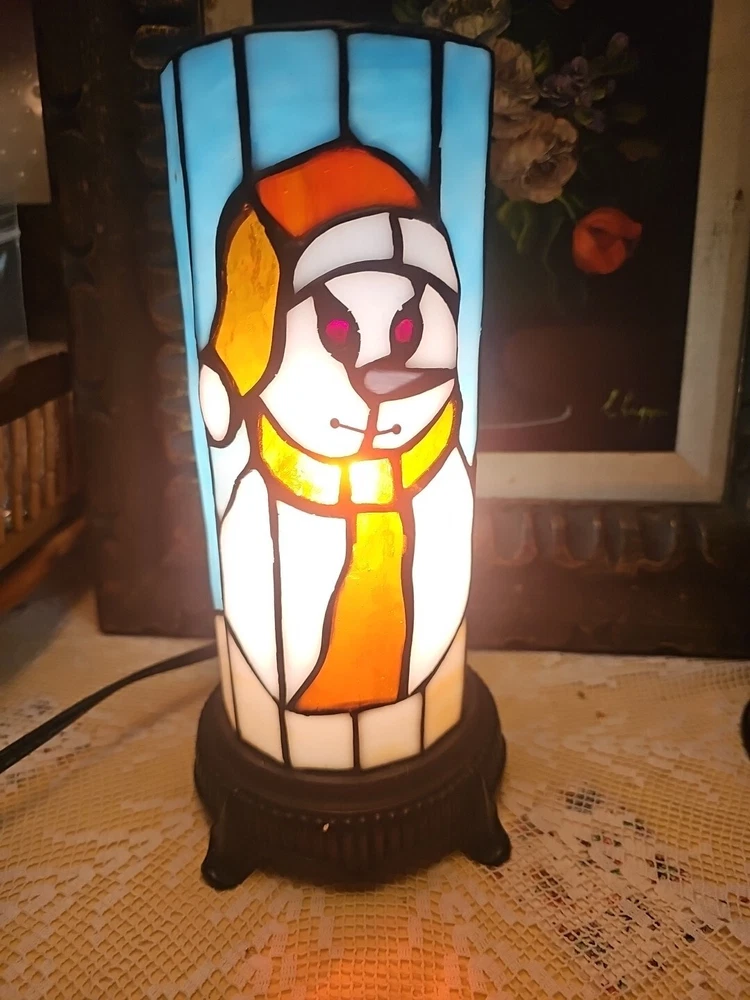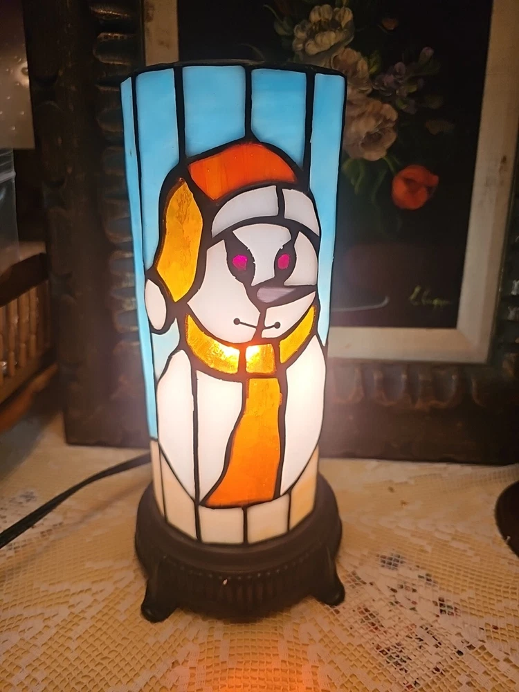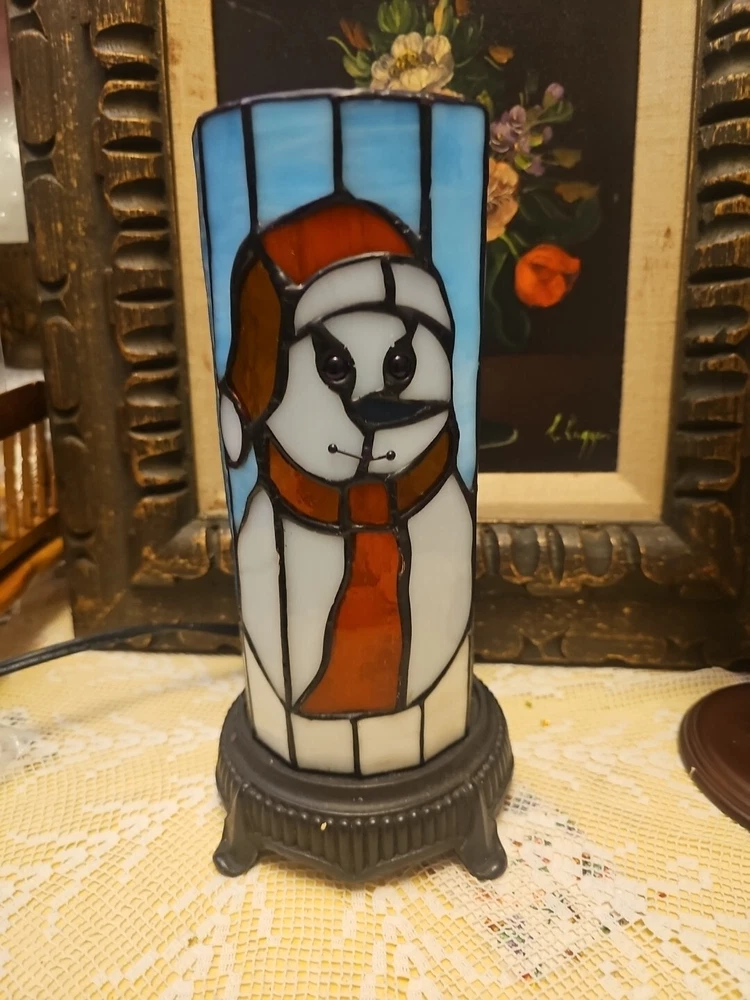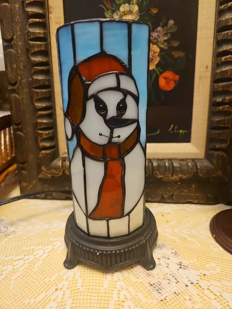 Stained Glass Snowman Column Accent Lamp 10" Christmas Holiday Red Eyes. Condition is Used. Shipped with USPS Ground Advantage.
