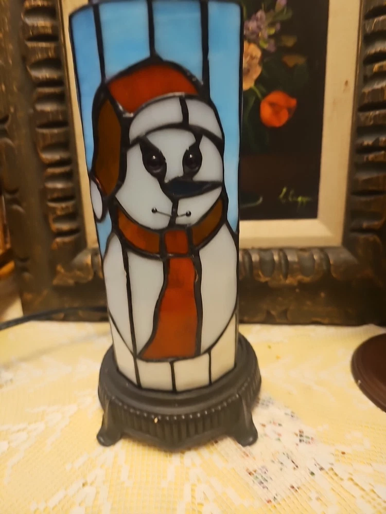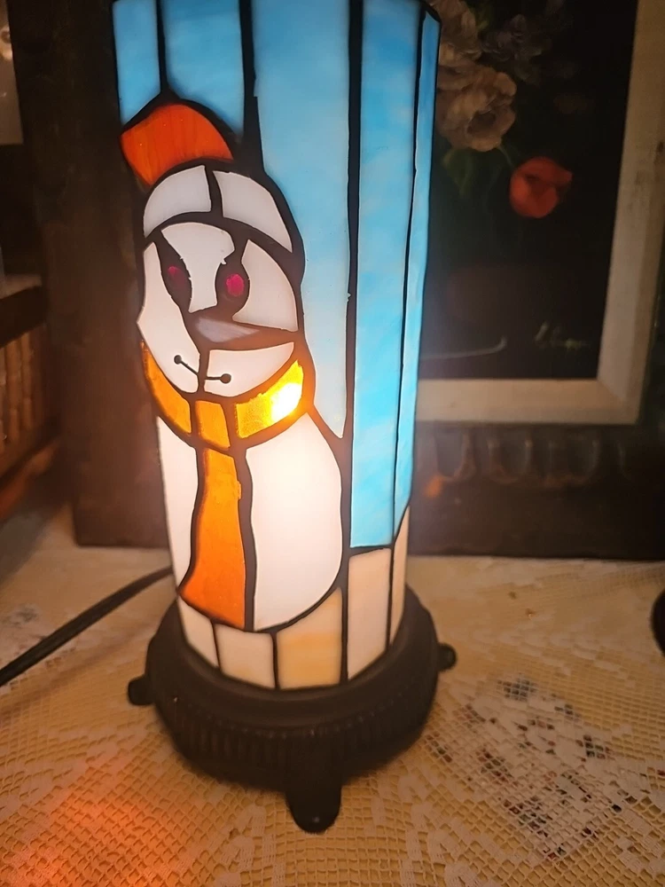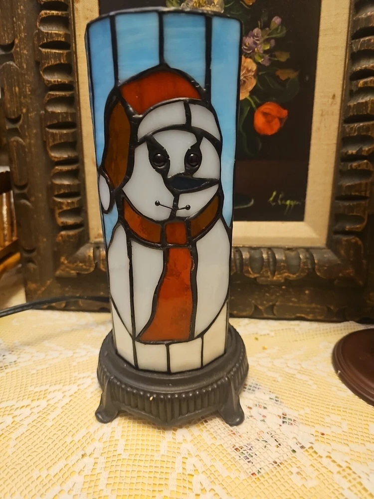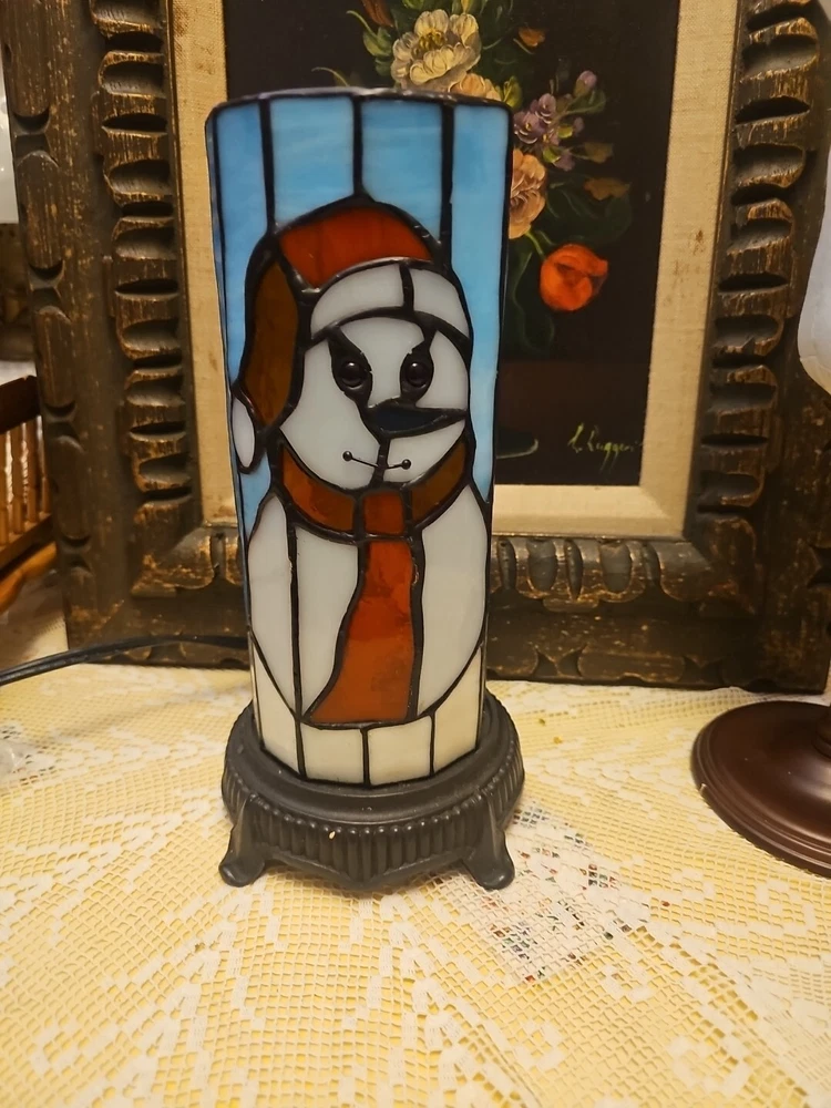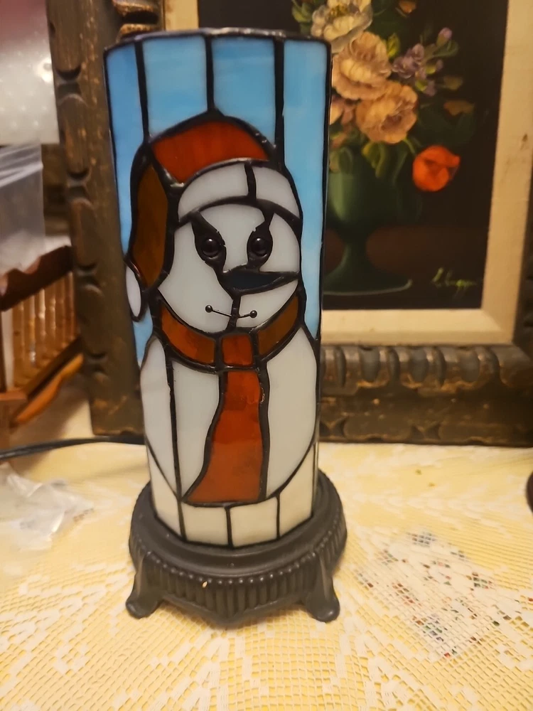 Stained Glass Snowman Column Accent Lamp 10" Christmas Holiday Red Eyes. Condition is Used. Shipped with USPS Ground Advantage.