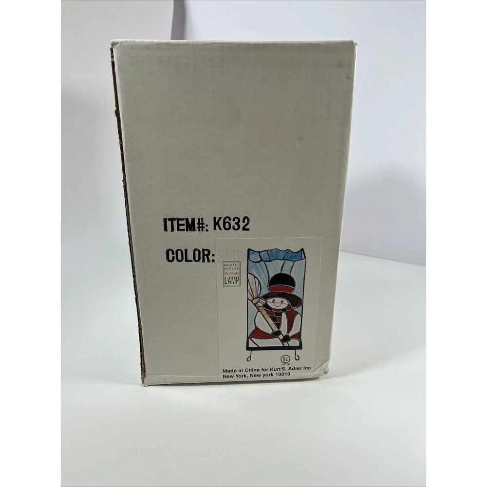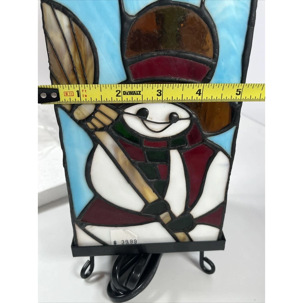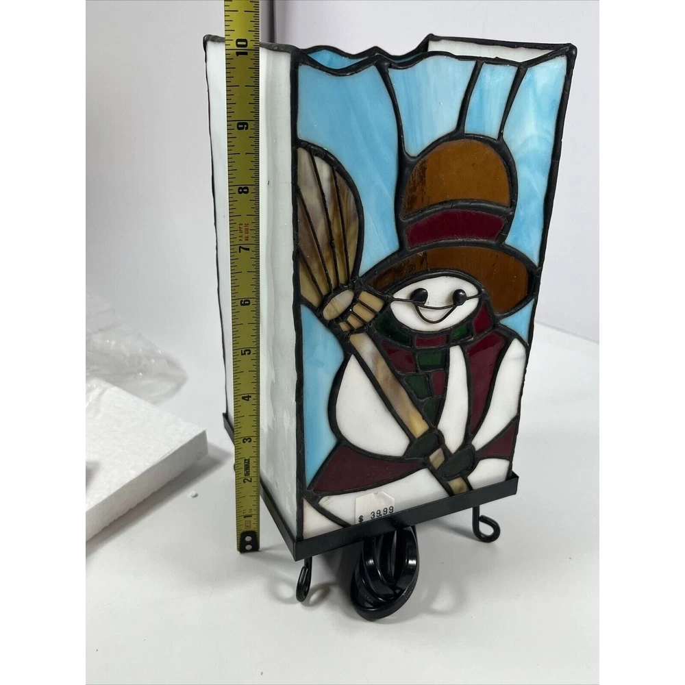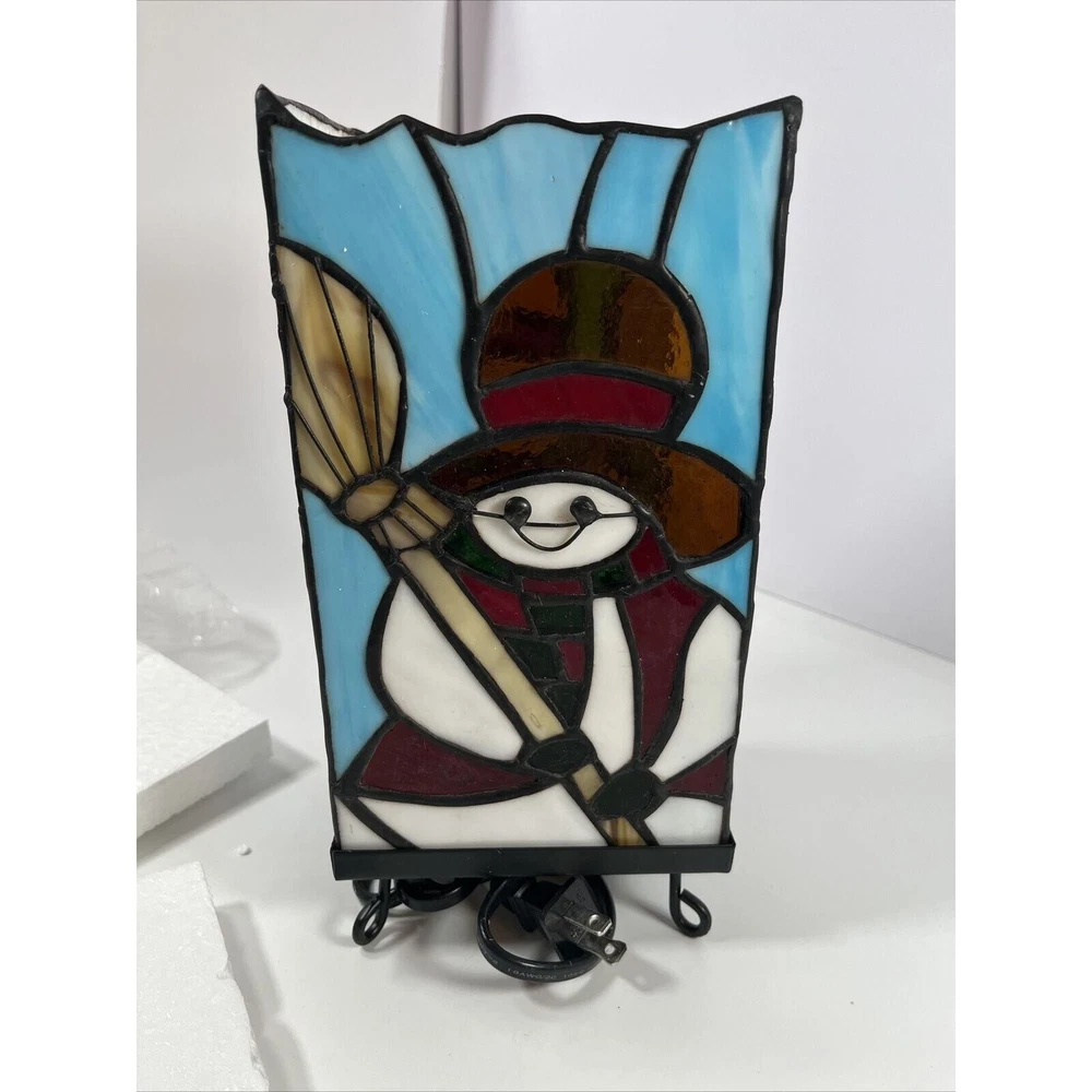 This unique accent lamp is the perfect addition to your holiday decor. Featuring a beautiful snowman design made of stained glass and metal, this lamp is sure to brighten up any room with its multicolor lighting technology. Measuring 4.5 inches in length, 5 inches in width, and 10 inches in height, this medium-sized lamp is corded electric and comes with a black cord color. The lamp is an original design from Kurt Adler, a reputable manufacturer in the industry. It has a stained finish and a column-shaped shade, giving it a vintage Americana style. This seasonal-themed lamp is perfect for both unisex adults and collectors alike. Beautiful lamp with a fun design! Opened for the first time for these photos. One side of the lamp has a crack within the hat piece of brown glass. See photos!