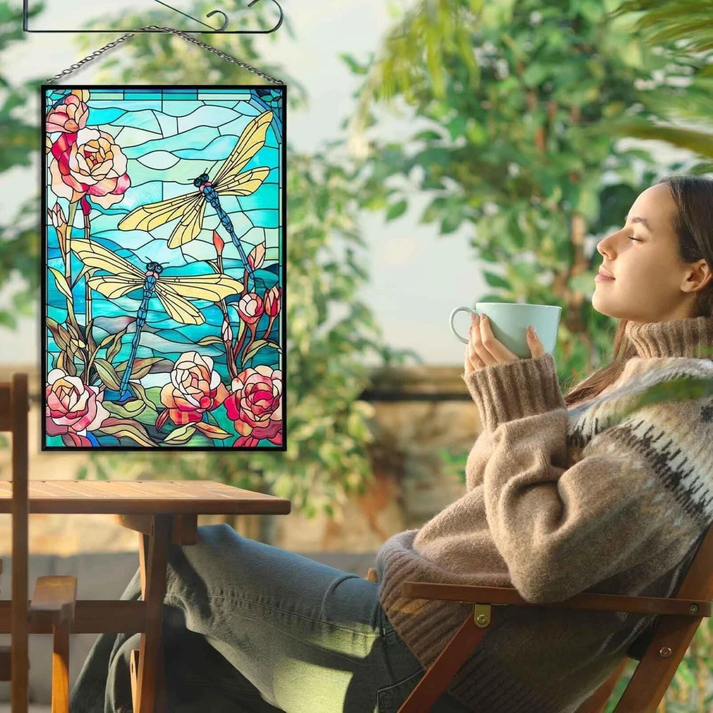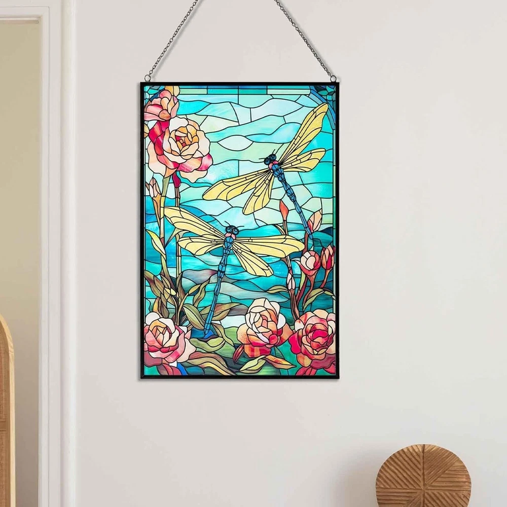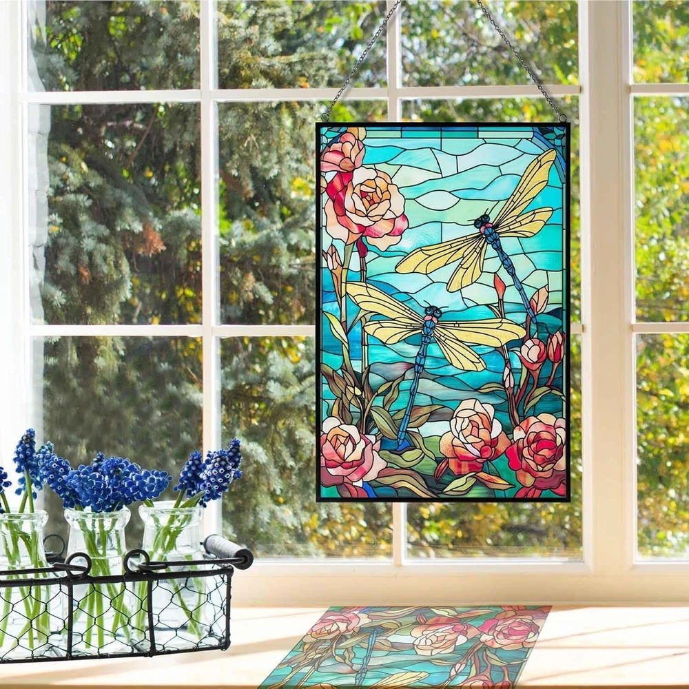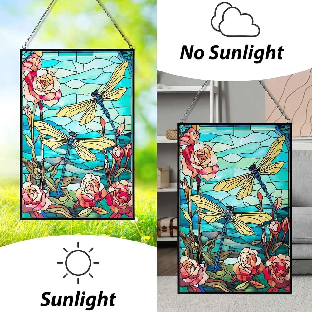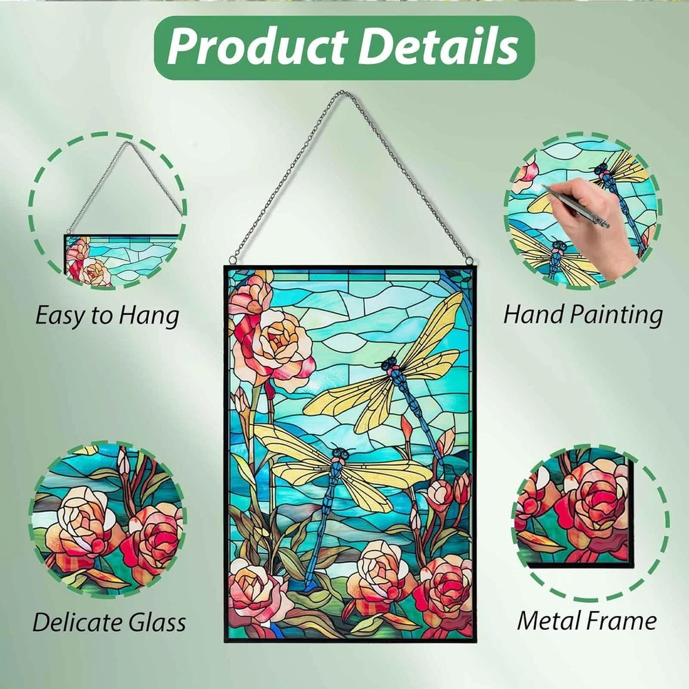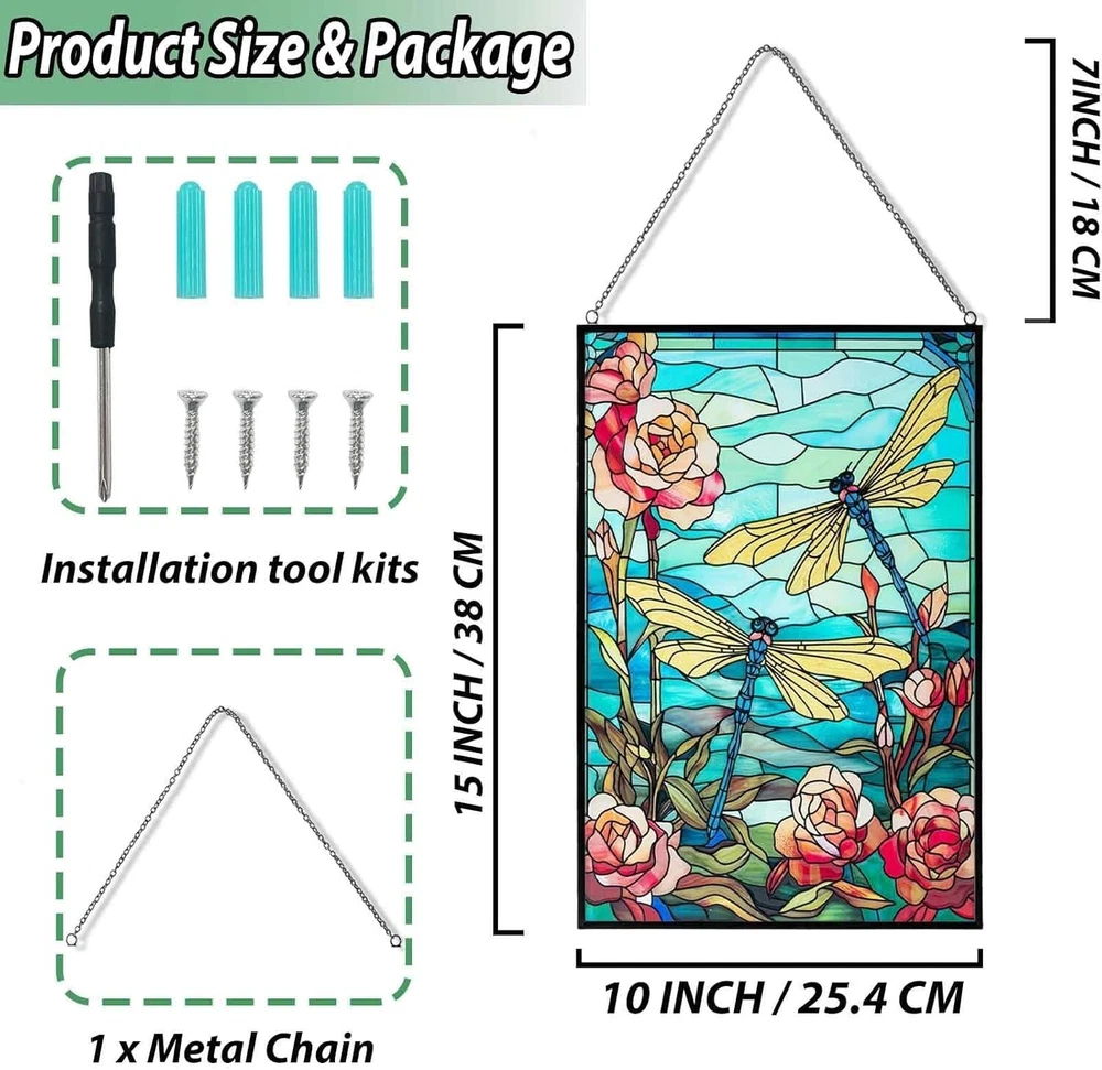 Stained Glass Window Hanging Dragonfly Suncatchers for Windows Hanging Hand New Color:Yellow Dragonfly With Morning Glory Flowers Hand-made Glass Hanging: The stain glass window hanging is made of the beautiful stained corrugated glass with unique texture.This piece of glass by hand has experienced four stages: hand cutting - cleaning - screen printing - color painting. The stained glass window panel is highly durable and maintain its elegant beauty, never fade over time. Originally Designed: The dragonfly sun catcher is our original design. To convey more beauty and emotions, we draw inspiration from nature. As dragonflies represent love, happiness, and growth in many cultures, we add deep meaning to our suncatcher for window by combining these symbolic meanings with the radiance of sunlight. Easy To Hang: No assembly required. The stained glass suncatcher is W10"xH15" coming with a metal chain, screws and screwdriver. The overall height is 20.8'' plus the metal chain. No need to drill holes or glue, you just stick it on the window, wall and doors. The window suncatcher can quickly to enhance the beauty of your home and office. Widely Use: The stained glass suncatcher will show different colors in different lighting conditions. When the sunlight comes through, it will become more gorgeous and looks colorful. whether the living room, bedroom and kitchen, or your garden, This stained glass window panel can be hung in windows, walls, tree branches or anywhere. Ideal Gift: The window sun catcher is durable, elegant and generous. Perfect gift on birthdays, Mother's Day, Valentine's Day, Christmas, Thanksgiving, housewarming celebrations, weddings, and any other special occasions. The stained glass suncatchs are not only as a stained glass window decor, but also represents a kind of sentiment. Return Policy: We offer a 30 day return policy from the receiving date. Please contact us for a Free Return Label. Please use our return label so it will go back to our supplier and we can do a refund or replacement afterwards. Feedback: Your satisfaction is very important to us! If you have any problem with your order, please contact us and we will do our very best to make you satisfied. As long as you are happy with your purchase, please leave a positive feedback for us. We will always leave you a positive feedback in return. If you have any problem with your purchase, please do not leave a negative feedback. Please Contact us ... and your issue will be solved quickly and positively We are a small family-owned business trying to make a living, not a huge company that does not care ... We will ALWAYS do our best for you!