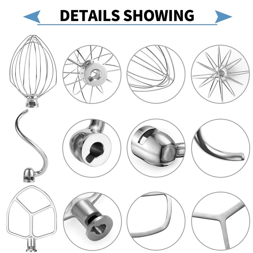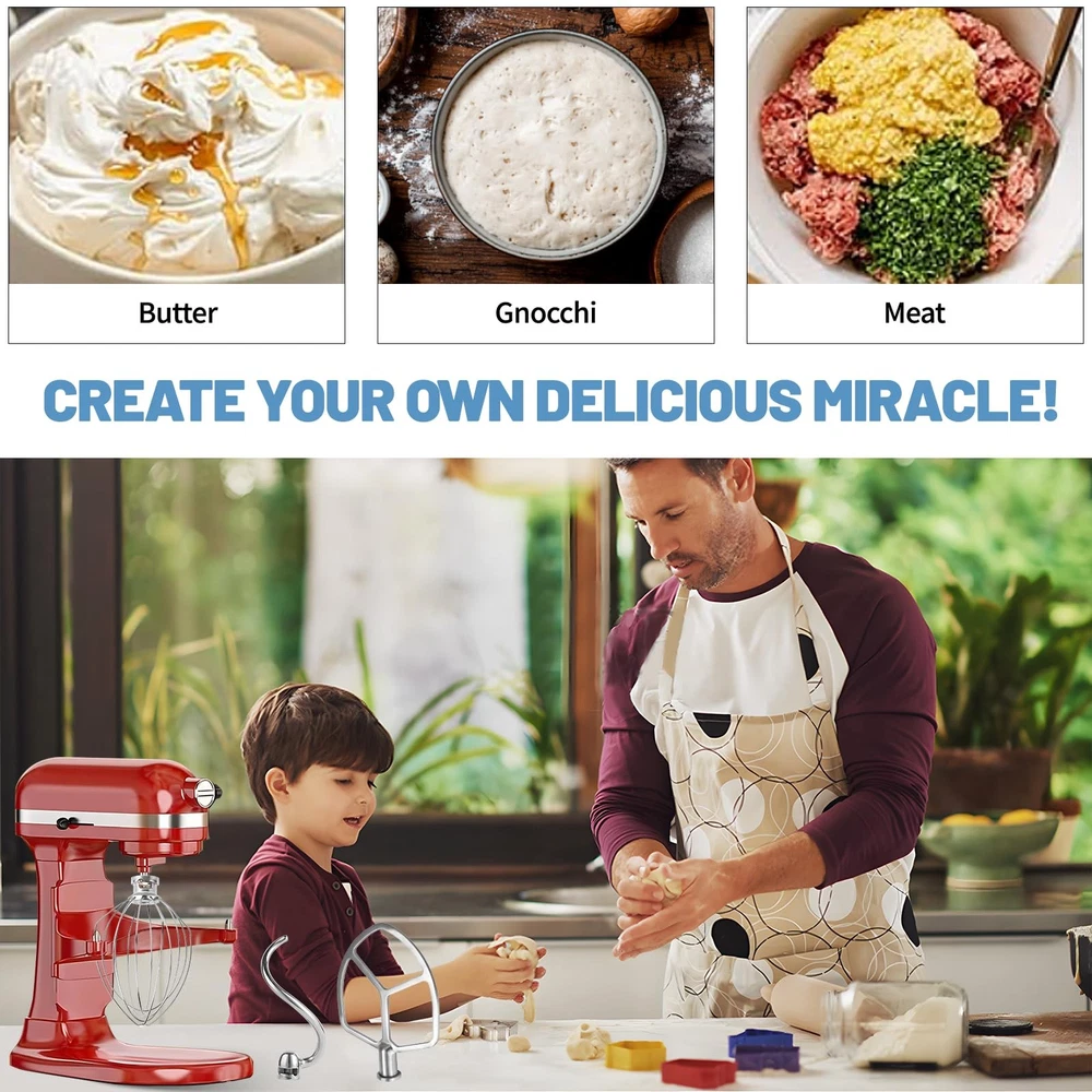 Upgrade your KitchenAid 5-6QT bowl lift stand mixer with this premium 3-piece attachment set. The kit includes a versatile flat beater for general mixing tasks, a professional-grade 6-wire whisk for incorporating air into batters and whipping creams, and a heavy-duty dough hook for kneading bread doughs. Each attachment is crafted from high-quality stainless steel, ensuring durability and resistance to rust. The thoughtful design provides optimal bowl coverage for thorough mixing results every time. These attachments are dishwasher safe for easy cleanup after your baking sessions. Compatible with KitchenAid 5-6QT bowl lift stand mixers, these accessories will help you tackle any recipe with confidence. The robust construction and precise engineering make them reliable tools for both occasional bakers and cooking enthusiasts who use their mixer frequently. Transform your stand mixer into an even more versatile kitchen companion with these essential attachments. Widely used:Fits Professional 5 Plus Series, Pro 500 Series, Professional HD Series, Professional 600 Series and Pro 600 Series, such as KV25G0X, KV25G8X, KV25H0X, RKG25HOX, KV25M, KP2671X, KP26M1X, KP26M8X, KP26M9X, KP26M9PC, KP26N9X, KP2671X, KL26M1X, KL26M8X, KD2661X, KT2651X, KT2651X, KB26G1X, RKSM6573ER, RKSM6573ER, RKSM6573CU, 5KSM6583, 5KSM6585G.Note: Please check the model number before purchase COMPLETE SET: Includes three essential attachments - 6-wire whisk for aerating, dough hook for kneading, and flat beater for mixing PREMIUM MATERIAL: Constructed from high-quality stainless steel for superior durability and rust resistance during regular use High working efficiency: It can make a large amount of mixture that needs to add air in a short time, saving labor and time Reliable after-sales service: We are committed to providing excellent customer service. If you have any questions or concerns, please feel free to contact us and we will be happy to serve you. This kitchen blender accessory is the perfect gift for family and friends who love to cook