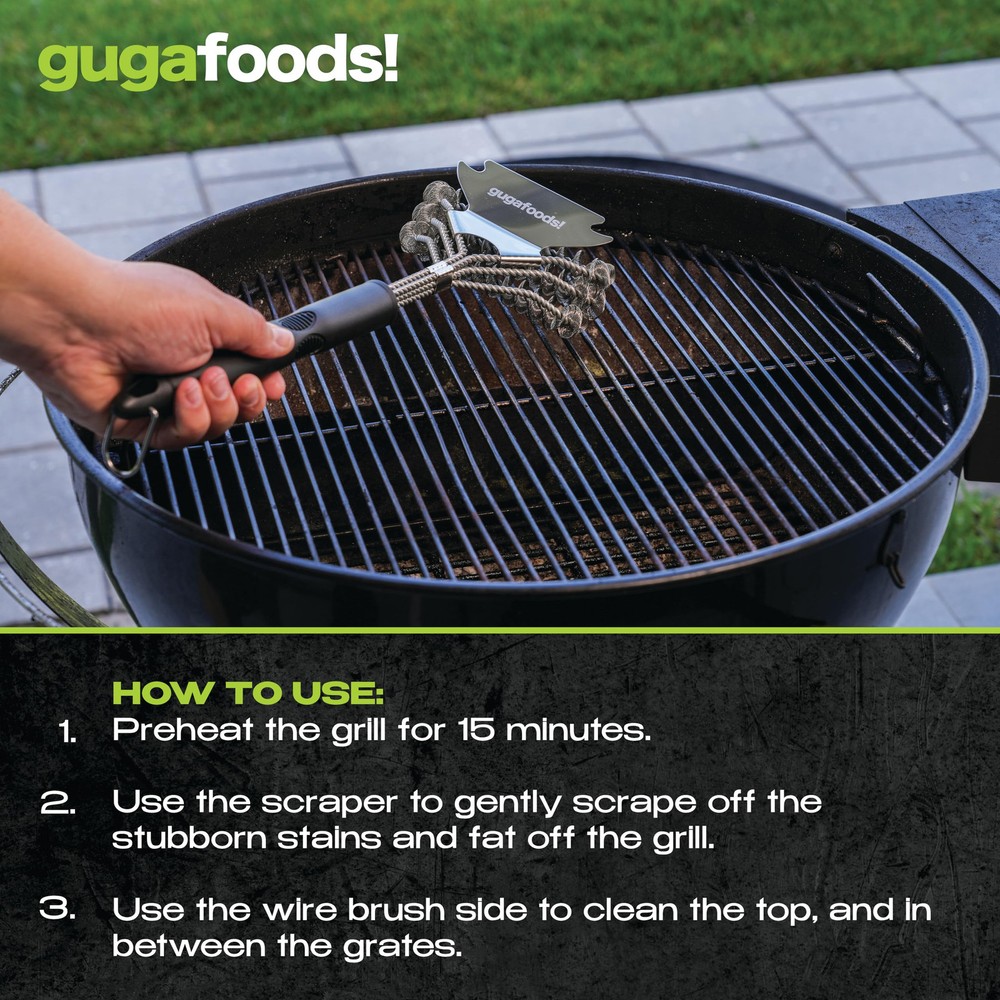 Elevate your grilling with Grill Brush, featuring durable stainless-steel bristles and a sturdy polypropylene handle. Crafted for top-notch quality and safety, it ensures efficient cleaning without the risk of metal bristles. Constructed from food-safe materials, it's both reliable and effective. Preheat your grill, scrape off stains with the scraper, and clean between grates with the wire brush for worry-free cooking every time. GRILL BRUSH Elevate your grilling experience with Grill Brush, featuring a durable stainless-steel brush & scraper with a strong polypropylene plastic handle. This premium grill brush is designed for those seeking top-notch quality and performance. Guga Grill Brush provides increased surface area for quicker and more efficient cleaning of grills. 2-in-1 Design This versatile grill tool features both a wire brush and scraper, allowing you to tackle tough grime and residue with ease. Effortlessly remove stubborn debris and grease for a pristine bbq cooking surface. The wire brush is designed to reach all areas of your grill. BRISTLE FREE SAFETY Embrace worry-free grilling with our bristle-free safety feature, crafted with a spiraled stainless steel wire design that eliminates the risk of metal bristles breaking down in with your meals, to have a secure and enjoyable cooking experience. STAINLESS STEEL Crafted with a stainless-steel brush & scrapper for a durable yet lightweight design that is built to last. It's rust-resistant and durable, providing reliable performance for countless grilling sessions and withstands outdoor elements. Equipped with a built-in hook, our grill brush is designed for easy storage when not in use. Hang it on your grill or kitchen utensil rack for quick access whenever you need it. ENHANCE YOUR GRILLING EXPERIENCE Keep your grill grates clean and maintain optimal performance with our bristle-free grill brush & scraper. Perfect for use on all grill types, from gas and to and more. For best performance Preheat the grill for 15 minutes, use the scraper to gently scrape off the stubborn stains and fat off the grill. Use the wire brush side to clean the top, and in between the grates.
