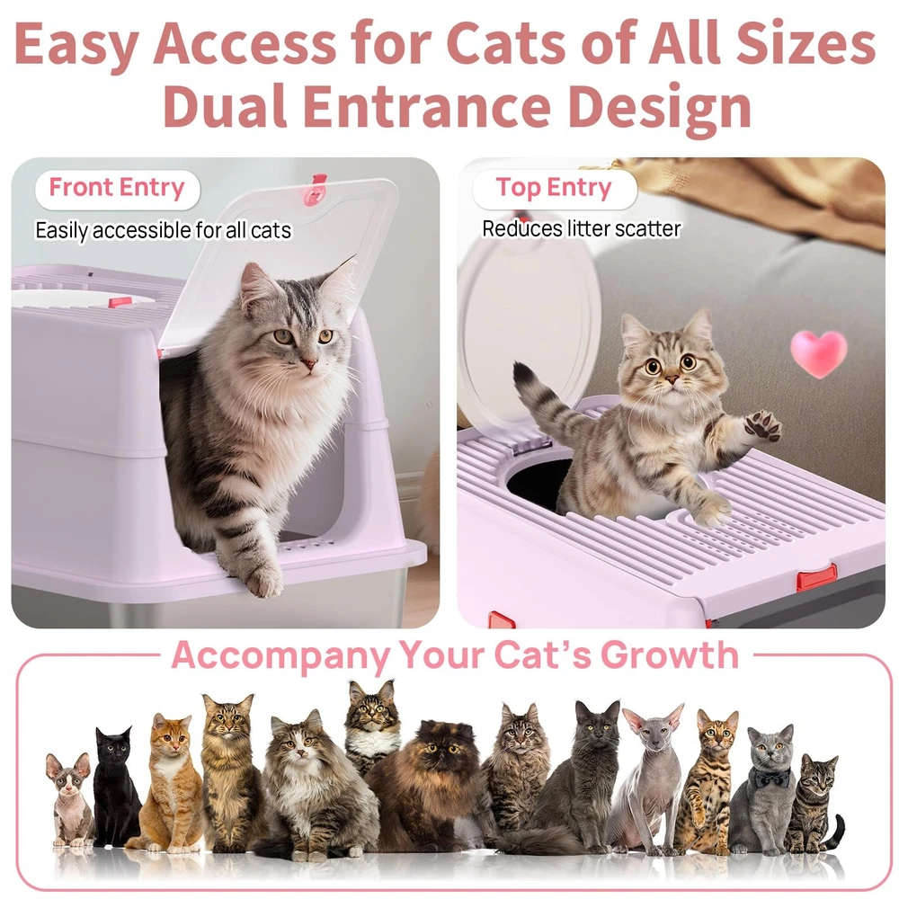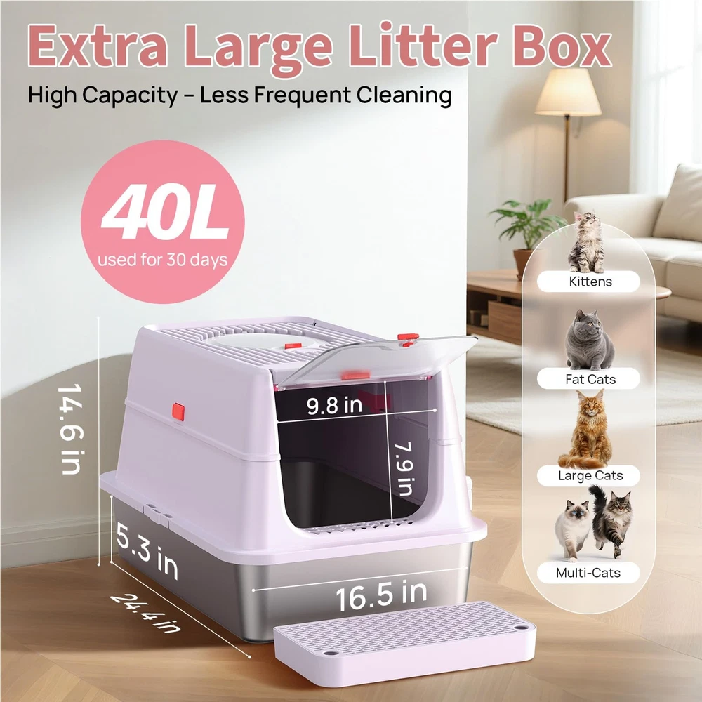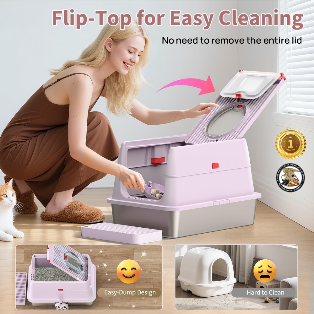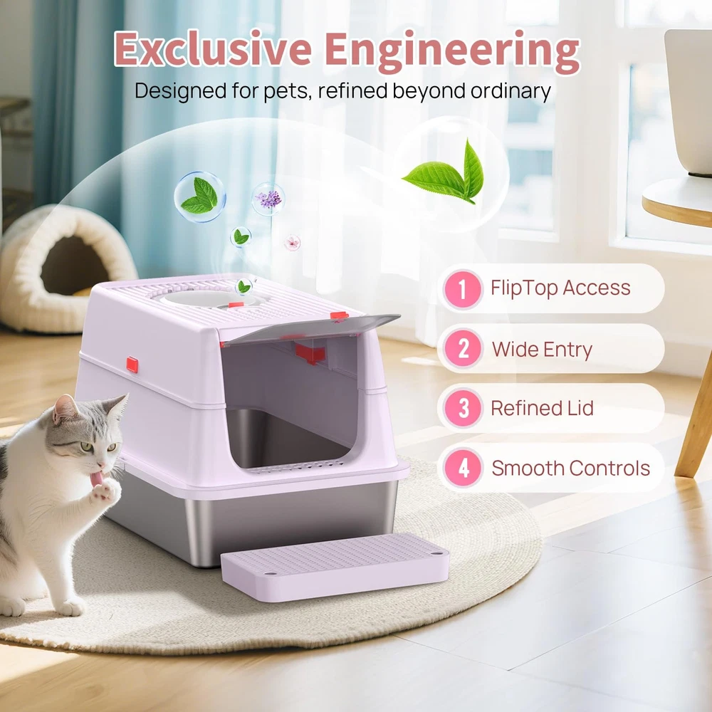 Unique Flip Top Design – Effortless Cleaning: Tired of struggling with clunky lids during cleanup? Our upgraded enclosed stainless steel litter box features a 180° flip-top lid, so you can easily scoop without removing the entire cover. No more awkward angles or hard-to-reach corners—just press the button, lift, and clean. Premium SUS304 Stainless Steel – Odor-Free & Residue-Free: Crafted from durable SUS304 stainless steel, this metal cat litter box is built to last and resist rust. Unlike plastic pans, the ultra-smooth, non-stick surface prevents litter from clumping or sticking, ensuring no messy residue. It won’t absorb odors or stain—making cleanup fast and hygienic. 3-in-1 Convertible Design – Tailored for Every Cat: Our stainless steel cat litter box features a smart 3-part detachable design that transforms into three modes: open pan, semi-enclosed, or fully enclosed stainless steel litter box with lid. Whether your cat loves privacy or open space, this metal litter box adapts to their habits. The secure snap-on system keeps components firmly in place. Spacious XL Size for All Cats: Measuring 23.6" x 15.7" x 14.5", this large stainless steel litter box (65L capacity) offers ample room for even the largest cats. The xl stainless steel litter box design reduces multi-cat conflict, while the 6"-deep steel litter box pan holds up to 38L of litter for minimal maintenance. Perfect xl cat litter box for households needing extra space. No More Mess or Dog Disruptions: The enclosed cat litter box stainless steel design contains litter and urine, protecting floors. Choose front/top entry to suit your cat’s preference, with a low-step door ideal for seniors. High walls offer privacy and deter dogs—making this litter box stainless steel a clean, secure solution. Unique Flip-Top Design for Effortless Cleaning: Tired of struggling with bulky lids during cleaning? Our upgraded stainless steel enclosed litter box features a 180° flip-top lid, so you can easily scoop without removing the whole lid. No more awkward angles or hard-to-reach corners. Just press the button, lift, and clean it Odor-Free & Residue-Free Stainless Steel Litter Box: Crafted from durable and premium SUS304 stainless steel, this metal cat litter box is built to last and resist rust. Unlike plastic litter pans, its ultra-smooth, non-stick surface prevents clumps from sticking, leaving no messy residue. It won’t absorb odors or stains, making cleanup fast and hygienic 3-in-1 Convertible Design: This innovative stainless steel litter box transforms between open, semi-enclosed, and fully enclosed modes to suit your cat's preferences. The one-touch button-lock system makes assembly/disassembly a breeze - just press to secure or release, no tools needed! This versatile box adapts to your cat's changing needs, whether they crave privacy (shy cats) or open space (kittens/seniors) Spacious XL Size for All Cats: Measuring 23.6"L x 15.7"W x 14.5"H, this extra-large stainless steel litter box features cat-friendly details, a wide-entry door (9"W x 7.9"H) for big cats, low 4.3" base with included mat for Munchkins/kittens/seniors, and 6"-deep pan (holds 40L litter) to reduce maintenance frequency. Ideal for multi-cat households needing extra space No More Mess or Dog Disturbances: Our enclosed stainless steel cat litter box effectively contains litter scatter and urine splashes, protecting your floors. Choose between front or top entry to suit your cat's preference, featuring a senior-friendly low-step design. The high walls provide privacy while deterring curious dogs - creating a cleaner, more secure solution for your home Pretty in Purple: Tired of ugly litter boxes ruining your home decor? Our lavender stainless steel litter box combines pet-proof durability with designer aesthetics, blending effortlessly into your living space. this soothing hue maintains its elegant look while resisting stains. Designed to discreetly blend into your living space, it’s the harmony of form and function