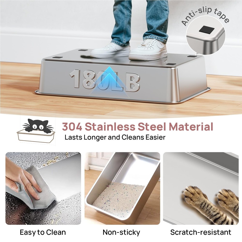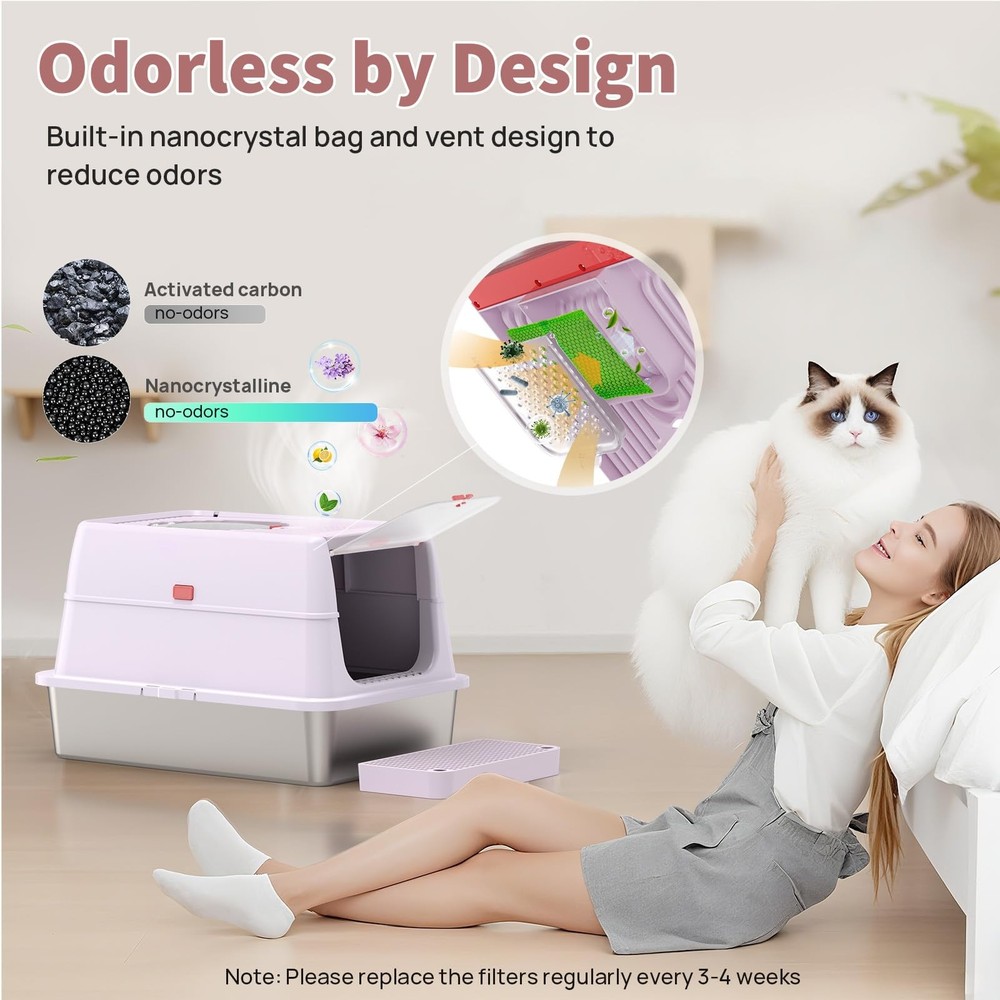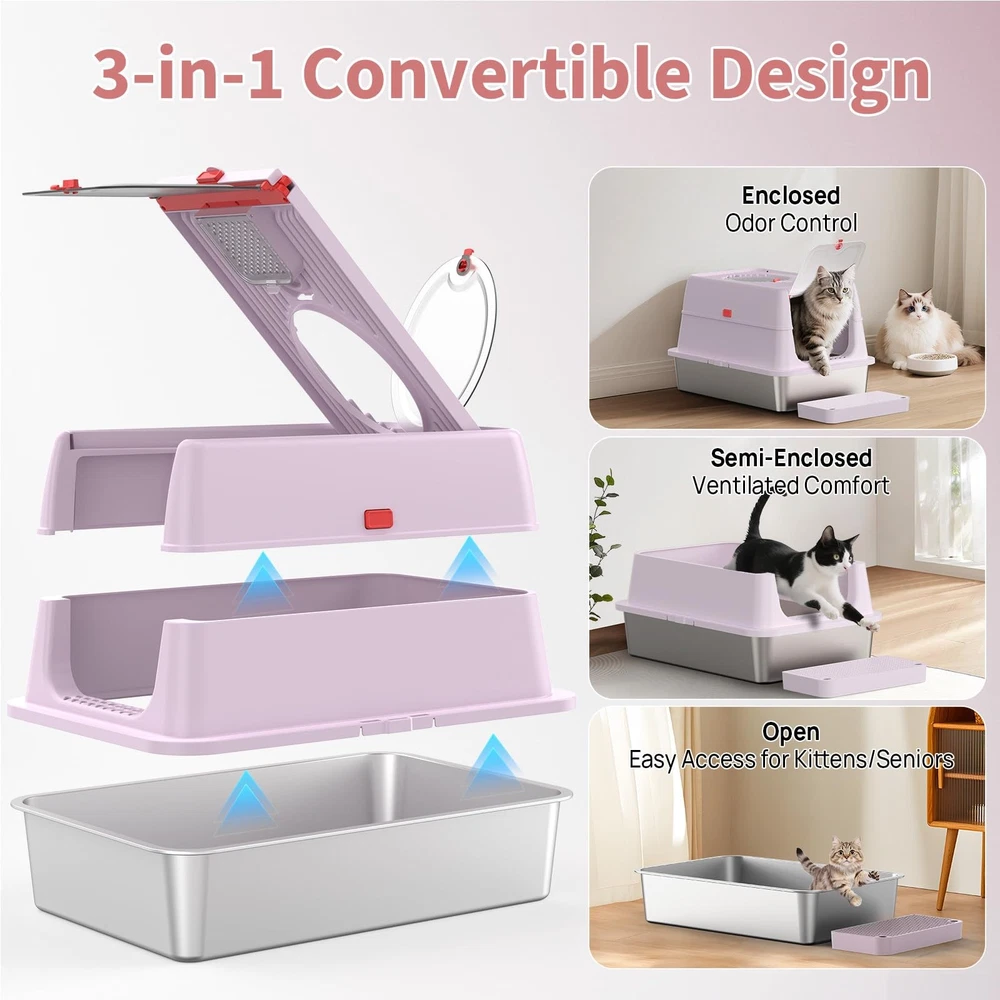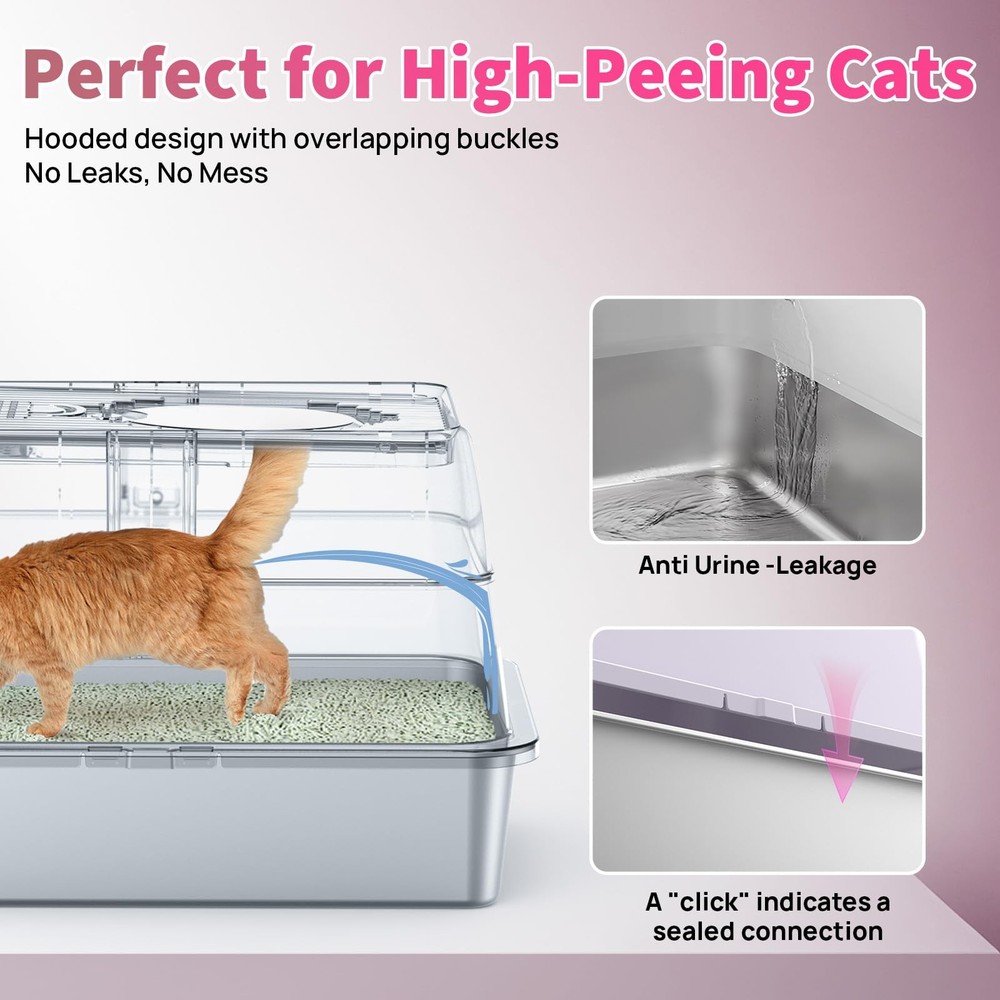 Unique Flip Top Design – Effortless Cleaning: Tired of struggling with clunky lids during cleanup? Our upgraded enclosed stainless steel litter box features a 180° flip-top lid, so you can easily scoop without removing the entire cover. No more awkward angles or hard-to-reach corners—just press the button, lift, and clean. Premium SUS304 Stainless Steel – Odor-Free & Residue-Free: Crafted from durable SUS304 stainless steel, this metal cat litter box is built to last and resist rust. Unlike plastic pans, the ultra-smooth, non-stick surface prevents litter from clumping or sticking, ensuring no messy residue. It won’t absorb odors or stain—making cleanup fast and hygienic. 3-in-1 Convertible Design – Tailored for Every Cat: Our stainless steel cat litter box features a smart 3-part detachable design that transforms into three modes: open pan, semi-enclosed, or fully enclosed stainless steel litter box with lid. Whether your cat loves privacy or open space, this metal litter box adapts to their habits. The secure snap-on system keeps components firmly in place. Spacious XL Size for All Cats: Measuring 23.6" x 15.7" x 14.5", this large stainless steel litter box (65L capacity) offers ample room for even the largest cats. The xl stainless steel litter box design reduces multi-cat conflict, while the 6"-deep steel litter box pan holds up to 38L of litter for minimal maintenance. Perfect xl cat litter box for households needing extra space. No More Mess or Dog Disruptions: The enclosed cat litter box stainless steel design contains litter and urine, protecting floors. Choose front/top entry to suit your cat’s preference, with a low-step door ideal for seniors. High walls offer privacy and deter dogs—making this litter box stainless steel a clean, secure solution. Unique Flip-Top Design for Effortless Cleaning: Tired of struggling with bulky lids during cleaning? Our upgraded stainless steel enclosed litter box features a 180° flip-top lid, so you can easily scoop without removing the whole lid. No more awkward angles or hard-to-reach corners. Just press the button, lift, and clean it Odor-Free & Residue-Free Stainless Steel Litter Box: Crafted from durable and premium SUS304 stainless steel, this metal cat litter box is built to last and resist rust. Unlike plastic litter pans, its ultra-smooth, non-stick surface prevents clumps from sticking, leaving no messy residue. It won’t absorb odors or stains, making cleanup fast and hygienic 3-in-1 Convertible Design: This innovative stainless steel litter box transforms between open, semi-enclosed, and fully enclosed modes to suit your cat's preferences. The one-touch button-lock system makes assembly/disassembly a breeze - just press to secure or release, no tools needed! This versatile box adapts to your cat's changing needs, whether they crave privacy (shy cats) or open space (kittens/seniors) Spacious XL Size for All Cats: Measuring 23.6"L x 15.7"W x 14.5"H, this extra-large stainless steel litter box features cat-friendly details, a wide-entry door (9"W x 7.9"H) for big cats, low 4.3" base with included mat for Munchkins/kittens/seniors, and 6"-deep pan (holds 40L litter) to reduce maintenance frequency. Ideal for multi-cat households needing extra space No More Mess or Dog Disturbances: Our enclosed stainless steel cat litter box effectively contains litter scatter and urine splashes, protecting your floors. Choose between front or top entry to suit your cat's preference, featuring a senior-friendly low-step design. The high walls provide privacy while deterring curious dogs - creating a cleaner, more secure solution for your home Pretty in Purple: Tired of ugly litter boxes ruining your home decor? Our lavender stainless steel litter box combines pet-proof durability with designer aesthetics, blending effortlessly into your living space. this soothing hue maintains its elegant look while resisting stains. Designed to discreetly blend into your living space, it’s the harmony of form and function