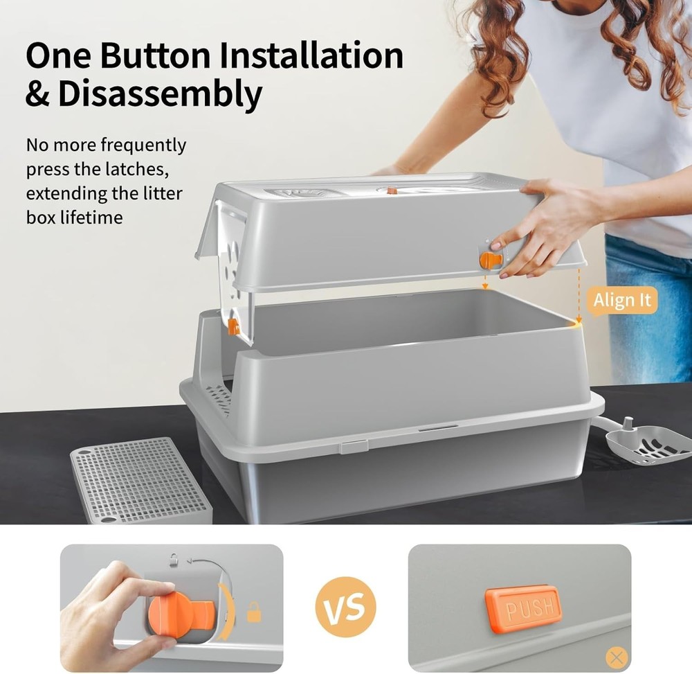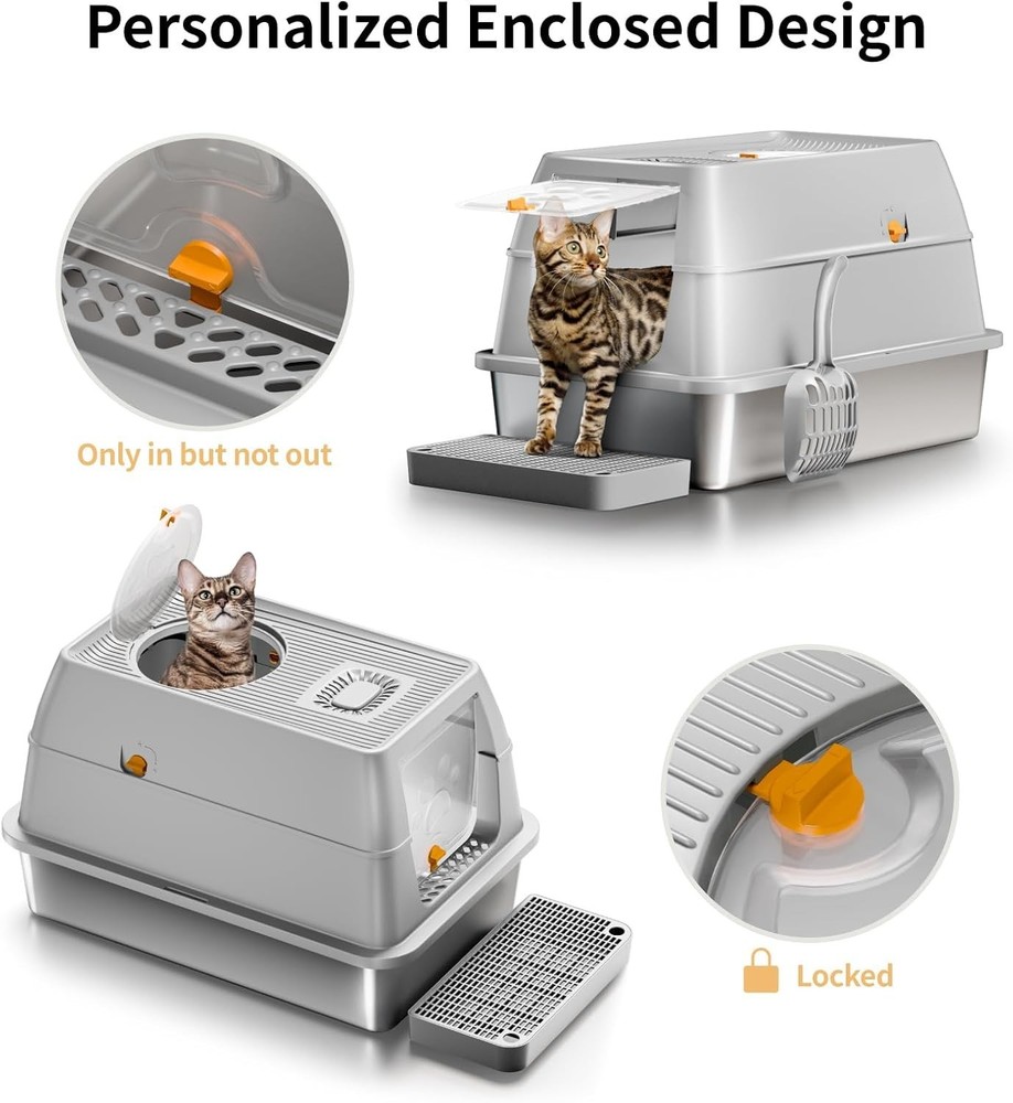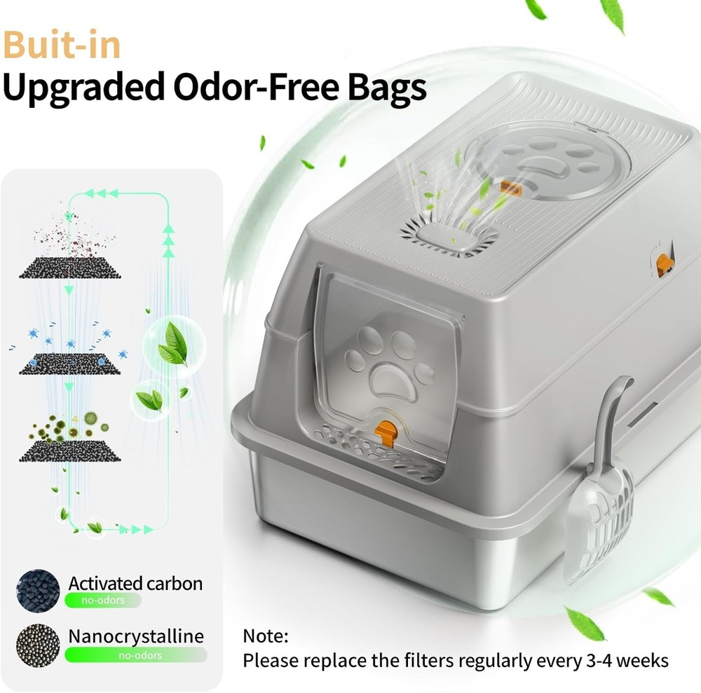 【Extra Larger Capacity】The XL covered cat litter box size with 23.62" x 15.74" x 15.74", which can hold 20L litter for big cats to use up to 30days, the high-wall provides enough privacy space, it is perfect for big cats and multi-cats family. 【Odor-Free】 enclosed cat litter box features carbon filters to absorb odor effectively, ensuring an fresh and comfortable space for cats. We suggest to replace the carbon bags regularly every 3-4 weeks, pls go to the brand store to purchase. 【Anti-Leakage Urine】 stainless steel top entry cat litter box with high sides removable lid, its unparalleled containment effectively preventing urine leakage and odors from spreading out. also you can choose two modes (semi-enclosed or enclosed) based on your pets preference. 【Easy to Clean & Durable】upgraded cat litter box made of SUS stainless steel, which is non-stick and easy cleaning by simply wiping litter pan, also degree with ABS removable top lid, it is sturdy and durable with service life 3-5 years, perfect choice for long term use. 【Integrated Enclosed & Dual Entry Mode】The covered litter box designed with easy assembly modular system, which support enclosed litter box and semi-enclosed configurations to satisfy pets needs. the cats can in through the front door and out from the top lid or in and out from top lid, preventing the litter tracking and reduce messy. 【One-Stop Solution】enclosed litter box equipped with removable top lid, litter scoop with holder, carbon filters and a footboard, which make it breeze to keep clean and odor-free space. extra large stainless steel cat litter box grows with your cat, we offer 12-month warranty covering any defects, scratches or logistics dents when you select us.