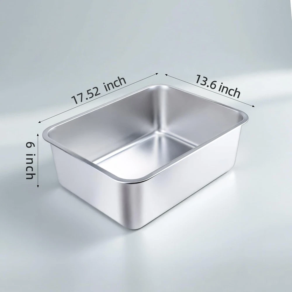 Stainless Steel Cat Litter - The Ultimate Solution for Pet Owners Upgrade your pet's litter experience with our premium stainless steel cat litter . Designed for both cats and small animals like rabbits, this high-sided litter pan combines durability, functionality, and style to meet the needs of even the most discerning pet owners. Say goodbye to plastic litter boxes that retain smells and hello to a sleek, easy-to-clean solution that keeps your home fresh and odor-. With its non-stick surface, splash-proof design, and odor-resistant properties, this litter is the perfect choice for a cleaner, more comfortable, and stylish home. Stainless Steel Cat Litter : Our stainless steel cat litter is crafted from high-quality, rust-proof stainless steel, ensuring durability and long-lasting use. Unlike plastic litter boxes, it resists scratches and dents, providing a clean and fresh environment for your pets. The smooth, non-stick surface makes cleaning effortless. High-Sided Design for Maximum Containment: Featuring 6-inch high sides, this litter effectively prevents litter scatter and urine splashes, keeping your floors clean. The spacious interior accommodates cats of all sizes, from kittens to large adult cats, ensuring comfort and privacy during use. Easy to Clean & Odor-: The non-stick surface allows waste to slide off easily, making cleaning quick and hassle-. Stainless steel naturally resists odors, ensuring a fresh and clean space for your pet. Simply wipe or rinse with water for a spotless finish. Safe & Comfortable Design: Designed with smooth, rounded edges and a reinforced rim, this litter ensures safety for both pets and owners. The ergonomic design makes it easy to carry and clean, while the sturdy construction provides stability even when filled with heavy litter. Versatile & Multi-Purpose Use: Perfect for cats, kittens, rabbits, and other small pets, this stainless steel litter is more than just a . Its durable design also makes it ideal for use as a pet bathing tub, storage container, or feeding station, offering exceptional value and versatility for pet owners.