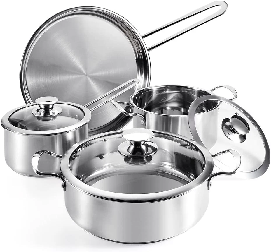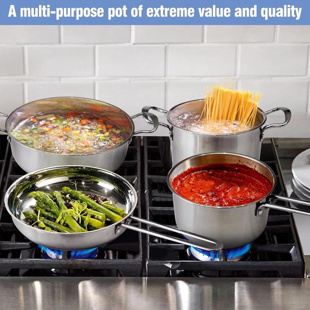 Stainless Steel Cookware Set 7 Piece Nonstick Kitchen Induction Cookware Silver Cookware Set includes: 2 Qt Pot w/ Lid, 2.6 Qt Pot w/ Lid, 3.7 Qt Pot w/ Lid,2.2 Qt fry pan.The practical cookware will suit any kitchen décor while providing professional cooking performance for every meal, large or small. High-Quality Materials: The pots and pans feature a 3-ply premium quality stainless steel base with a thick aluminum core for fast and even heat distribution and maximum durability.even heat distribution. Easy Clean & Scratch Resistant:The is dishwasher safe and can be cleaned using scorching, or steel wool pads since it is scratch-resistant won’t scuff or wear down from the use of metal utensils. Seal In Flavors :Utilize the professional-grade tempered glass lids to help retain heat and seal healthier, more flavorful meals. The covers with steam vents fit perfectly within the smoothly tapered rims. High-Quality Materials UPC 7445012669686 Type Does not apply Item model number -7 Closure Material Glass Item Volume 10.8 Quarts Color Silver Included Components Lid Material Stainless Steel Country of Origin China Is Dishwasher Safe Yes Item Weight 8.49 pounds Is Oven Safe Yes Handle Material Stainless,Stainless Steel,Steel Size 7PCS-Silver Utensil Compatibility Metal Manufacturer -7 Special Feature Gas Stovetop Compatible Package Dimensions 17.4 x 11.42 x 7.8 inches Compatibility Options dishwasher safe,gas,induction/electric Number of Pieces 1 Shipping Fast shipping is very important for us. Our standard US shipping service is FREE. Your order will be shipped within 5 business days upon full payment received. Your order will be delivered within 3-5 business days after the handling time. We are not responsible for undeliverable addresses. Returns and payment We offer a 30 days return policy from checkout winning date. FeedBack Your feedback very important to us, after you get your package and you are satisfied with our service please leave us positive feedback If you have any problem with your order / any questions please before leave any type of feedback For any questions, using eBay contact system Please visit our eBay store to check out other items for sale! Thank you for shopping at our store.