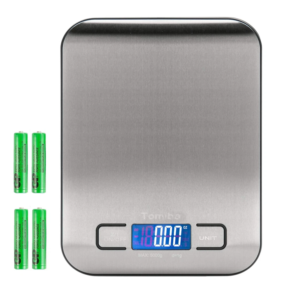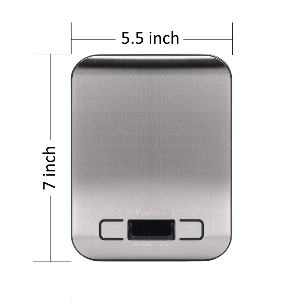 Stainless Steel Platform, 5kg/11lb capacity, 0.05oz/1g division, Perfect for baking, cooking, and postage TARE Function can reset the current weight on the scales to zero, quick unit conversion, Volume Measurement Supported, Easy-to-read display features Large Digital Numbers with optional back-light Space-Saving Design: Thin profile allows for easy storage and lightweight portability, batteries included Auto Shut-Off: The scales switch off after 2 minutes of inactivity if you forget to turn them off or your hands are all gooey with food Meet CE/ROHS certification, 2 x AAA batteries included Product Description Troubleshooting: -'EEEE': Overload, remove the object from the scale to avoid damage. -'Lo': Low voltage. Please install new batteries. -'UnSE': Calibration error, please turn off and turn the scale back on to retry measurement. Package Contents: 1 x Digital Kitchen Scale 2 x AAA batteries 1 x User Manual TOMIBA Digital Kitchen Scale Easily measure your garnishes and ingredients by grams, milliliters, pounds, and ounces with the quick unit conversion button. The digital scale features a handy auto-tare function so you can easily measure ingredients in a dish. The scale is designed with a smooth stainless steel platform for easy cleaning and maintenance. Weight Capacity:176 oz | 5000 g | 11 lbs Units:g | ml | oz | lb'oz Division Value: 0.05 oz | 1 g Auto-Off Function Tare Function Precise Measurement TOMIBA is a professional engaged in electronic weighing, tableware, kitchen utensils and other household products design, development, production and sales enterprises. TOMIBA have own product R & D Design Center, and in-depth cooperation with the Design Studio form Italian and USA, offering more than 20 new designs each year. With professional team, modern design, superior quality, standard management.