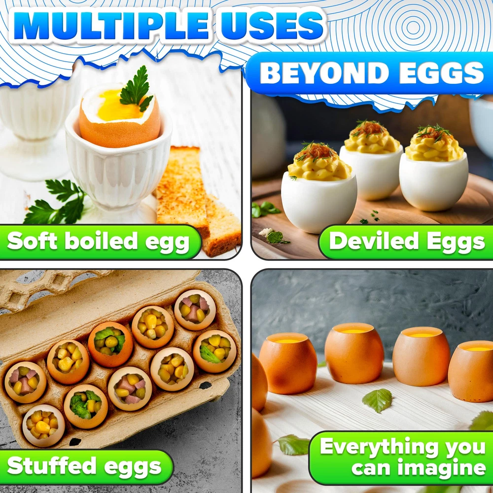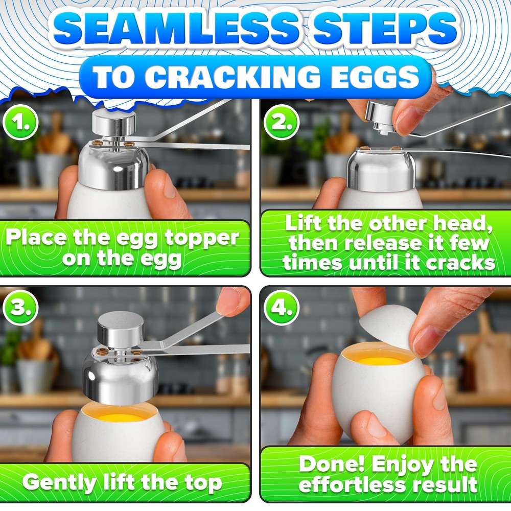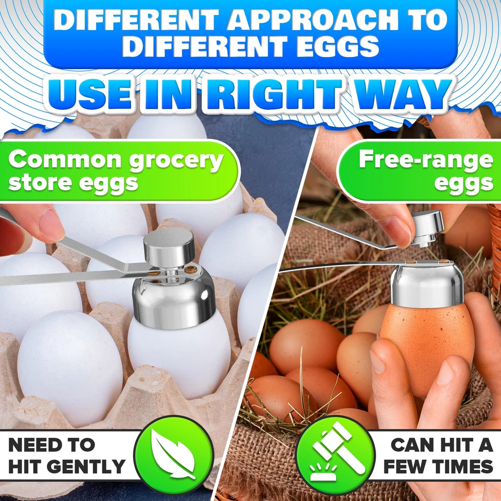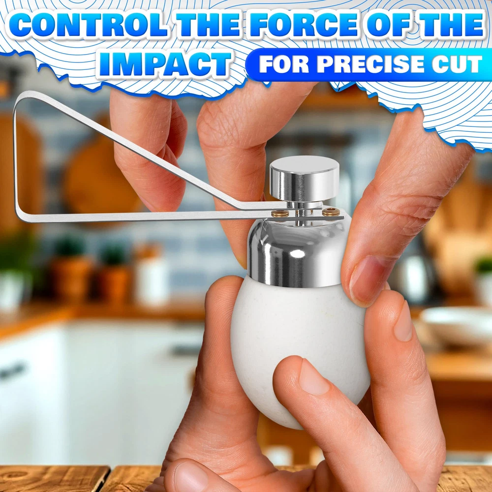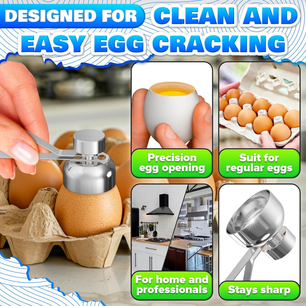 HIGH QUALITY MATERIAL: This egg cracker tool for raw eggs is made from high-quality stainless steel, making it sturdy, durable, and resistant to wear and tear. Its lightweight design makes it a convenient and practical addition to your kitchen tools for everyday use. UNIQUE DESIGN OF EGG SHELL REMOVER: Featuring a unique and innovative design, this egg shell remover hard boiled egg peeler makes cutting the top of raw eggs effortless and mess-free. This smart egg cutter works just as well for hard boiled eggs and its compact size makes it easy to store with your other kitchen tools. EASY TO USE EGG SCISSORS SHELL CUTTER: Cracking eggshells has never been easier with this egg top cutter shell cutter egg coddler. Simply pull the small knob up and hold it, then let go 2-3 times to create a shockwave that easily cuts the eggshell. SAVE TIME HARD BOILED EGG CUTTER: With its creative double egg scrambler in shell design, this tool saves you time and effort when making egg custard, pudding, little cakes, and even green plant artwork for your family. No more boring peeling and cracking with an egg breaker cracker holder. WIDE APPLICATIONS OF PEELING EGG TOOL: Not just for peeling eggs, this egg topper cutter for soft boiled eggs can also be used as a nutcracker, egg slicer, soft-boiled egg cracker, or butter cutter slicer for both hard and raw eggs. This egg separator stainless steel makes an excellent gift for your foodie friends who love experimenting with egg-based dishes.