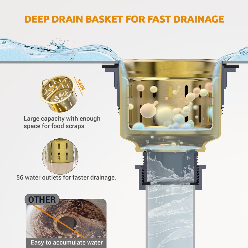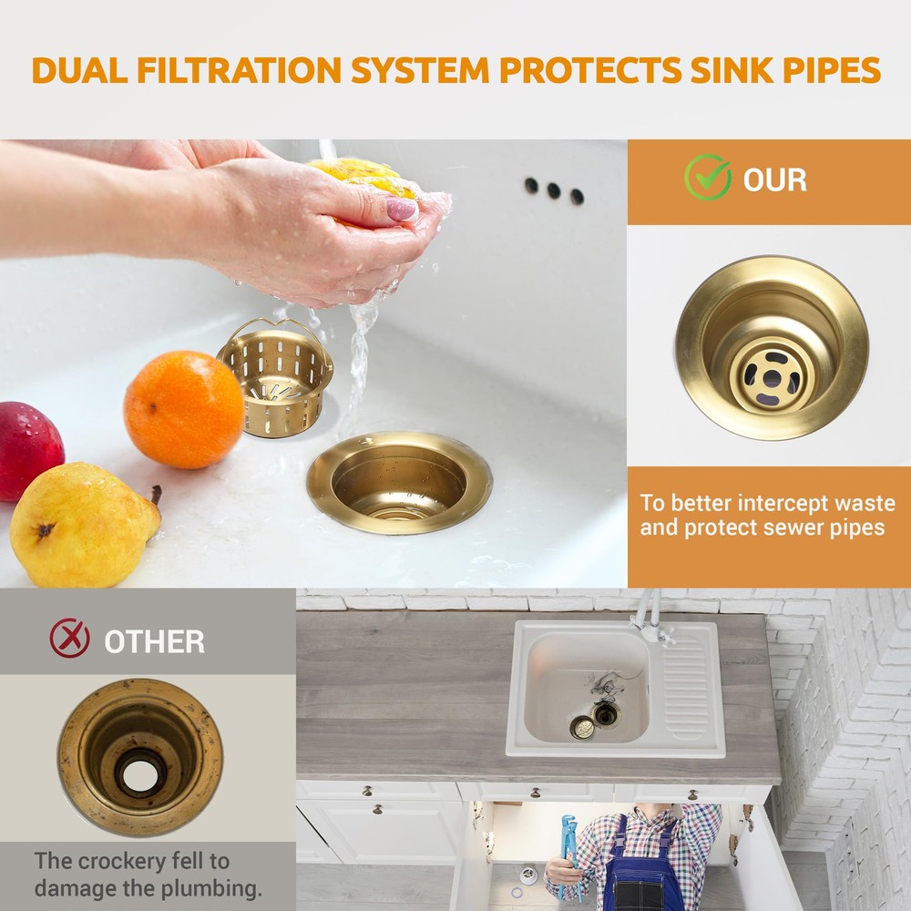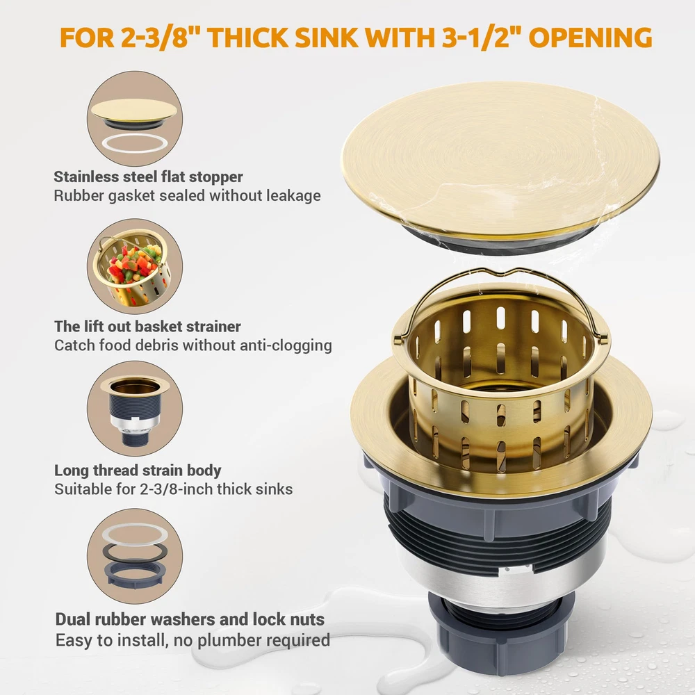 DURABLE STAINLESS STEEL: The gold kitchen sink drain is made of premium 304 stainless steel for durability and resistant to rust and corrosion to provide reliable filtration for years to come (NOTE: It can not be connected to the garbage disposal.) UNIVERSAL FIT: The kitchen sink strainer has a 3.5 inch opening that is compatible with most kitchen sinks. The kitchen sink drain assembly is 2-3/8 inches thick to fit a wide range of materials such as stainless steel, ceramic, marble and other sinks EFFICIENT DOUBLE FILTRATION: Stainless steel sink strainer with removable deep strainer basket has 56 drain holes to quickly intercept food debris and jewellery and prevent clogging. The bottom divider prevents knives forks from falling down the drain WITH HANDY SEALING LID: The kitchen sink drain kit comes with a flat lid with a sealing ring for great seal that prevents leaks and stores water for easy cleaning of items. Also, the sealing lid prevents odour spillage to keep your kitchen smelling fresh EASY TO INSTALL MAINTAIN: The kitchen drain assembly is designed to be easy to install for quick and easy setup into your sink. It's also easy to maintain - simply remove the basket strainer, pour out the debris and rinse with warm water and soap