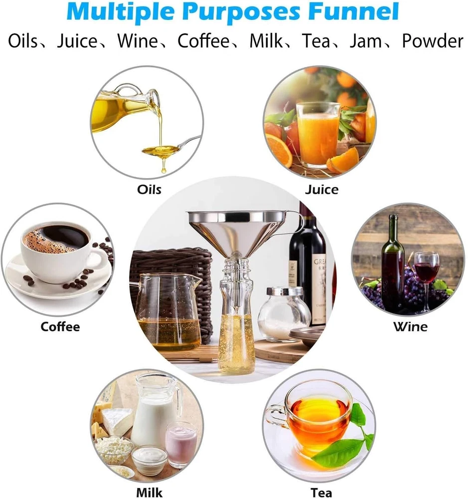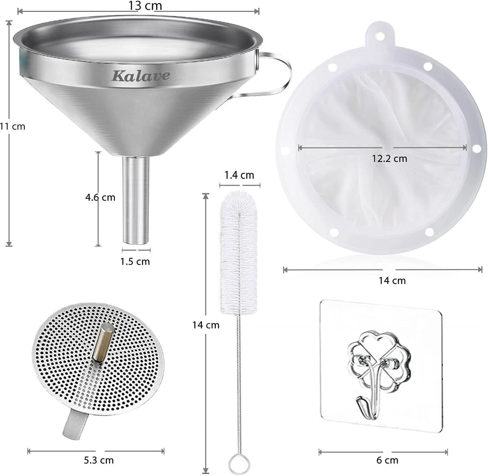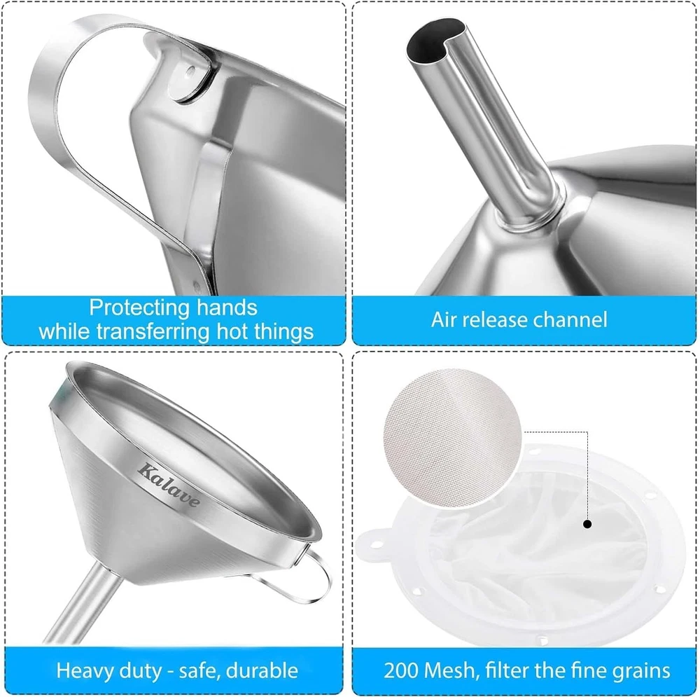 About this item Food-Grade Funnel Set: Kalave metal funnel crafted from 100% food grade high-quality stainless steel, The detachable 200 mesh funnel strainer made of PP frame and 200 fine mesh nylon filters. Funnel set is safe, non-toxic, sturdy and durable. compatible for most bottles, jars and other containers. The premium food-grade stainless steel funnel set resist bending, breaking, corrosion and rusting, and stay safe and beautifully with you for life. A funnel with two removable strainers: The 200 mesh funnel strainer helps you to filter the fine grains. It is perfect for filling bottles or transferring liquid ingredients such as oils, fry oil, sloe gin, wine, juice, milk, goat milk, soy milk, beer. The stainless steel strainer helps you filter hot cooking oil, grease, soup or seeds from homemade juice. You can also separate the strainer and use it as a standard funnel to fill a pepper、spice、salt, jam, particulates, powder. Protecting hands: The kitchen funnel handle is designed for protecting hands while transferring hot things, and it can be used to hang the Food funnel on a hook when not in use, saving storage space and maintaining hygiene. Super Easy to Clean: The funnel and the stainless steel strainer and 200 mesh food filter strainer is completely dishwasher safe.