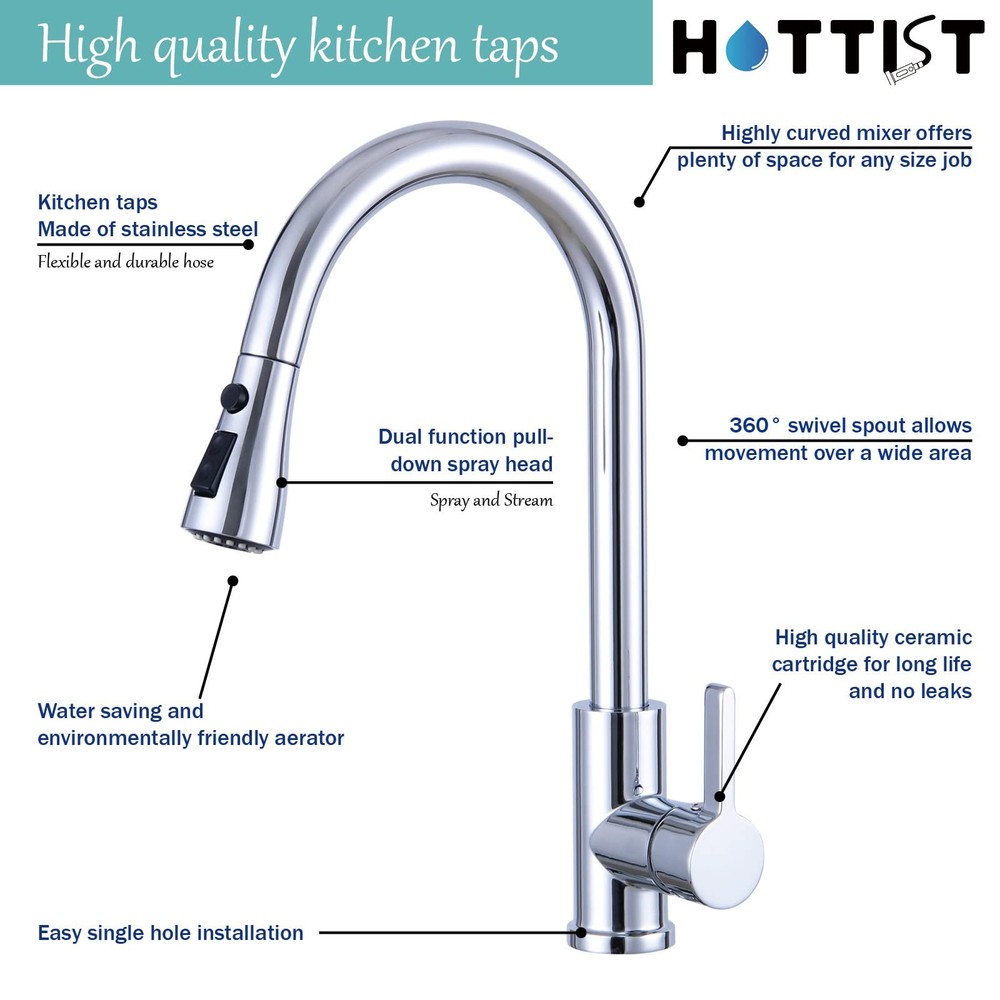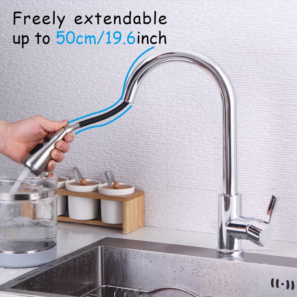 Features: PULL OUT & SWIVELS 360Retractable pull-out hose with handle docking arm creates smooth operation, easy movement and maximizes reachability in and around the sink in daily use. DUAL-FUNCTION SPRAYHEADoffers aerated stream for everyday cleaning and powerful spray for heavy-duty rinsing and easy cleanup. The pause button control the steam out as you need. EASY OPERATIONHigh arc kitchen sink taps, which effectively break the space constraint, provide full-range kitchen sink coverage with an 50cm retractable hose, 360 rotating sprayer and spout. The single handle is easy to operate, allowing you to adjust temperature and water flow easily. Include PEX hoses that can withstand high temperatures, which helps assist leaks and bursts. EASY TO CLEAN & QUICK INSTALLATIONThe mixer tap's nozzle can be removed for regular cleaning and replacement. The surface of the faucet is treated with multi-layer materials that make it easier to maintain. It prevents stains from remaining and can be simply wiped with a rag. Installation takes only about 20 minutes. NO Plumber Required. Detailed instructions are included. Detailed installation video also available. BUY WITH CONFIDENCE TAPS2 years. If you have any problems with your accessories used, you can send us an email at any time. We will provide you with new accessories. Please note: the sprayhead is made of plastic. More convenient to use and avoid burning your hands.