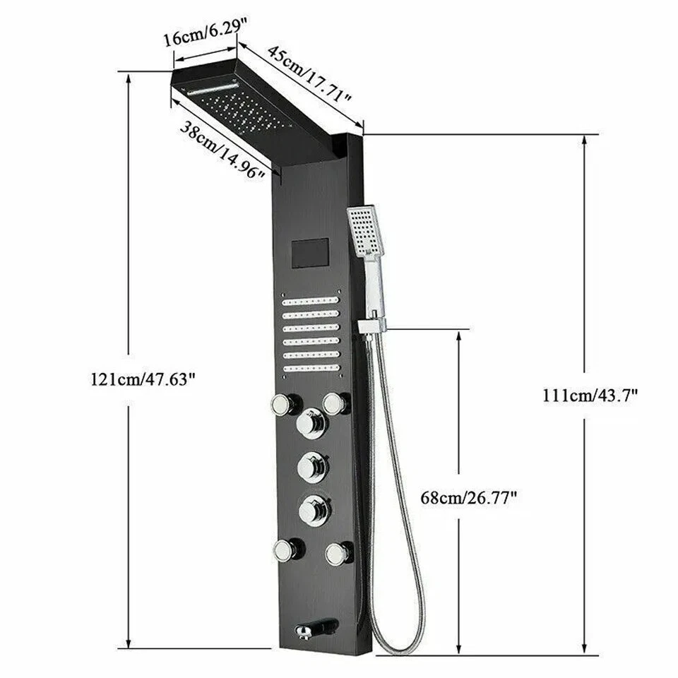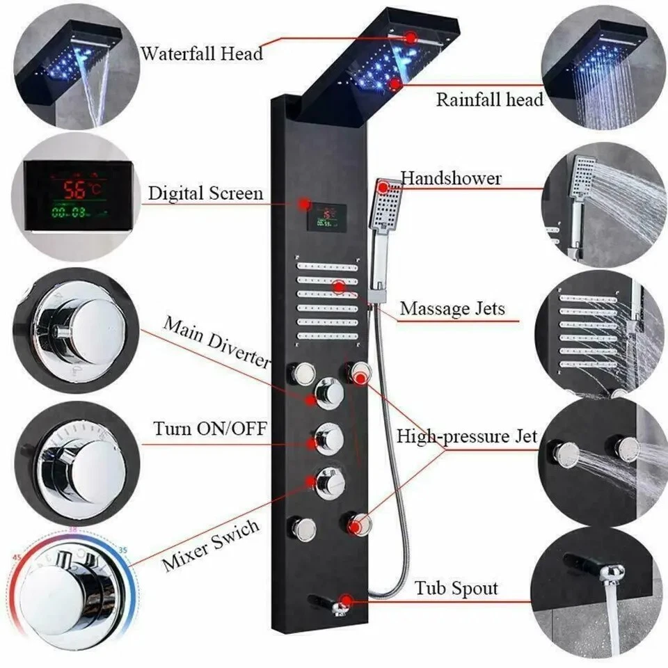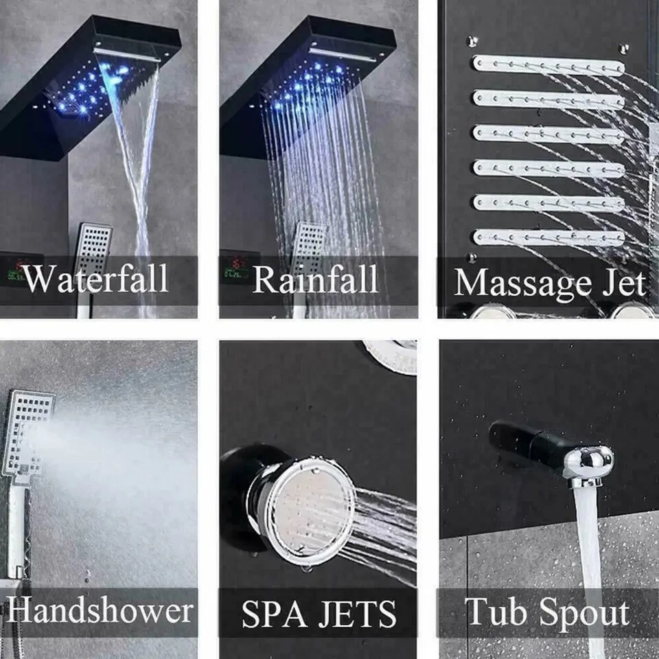 Product description This Shower Panel is constructed with the highest quality SUS304 stainless steel .It has waterfall shower head, rainfall shower head,handheld shower,massage spa sprayer,tub spout 5 ways water outlet. Immerse yourself in a truly relaxing shower experience and enjoy the modern style of this beautifully designed shower panel. Function: LED Shower Faucet Panel Material: SUS304 Stainless Steel Hand Shower Material:ABS Plastic Function: Shower Faucet Material: stainless steel Overall Height:44" Easy to install Finish:Matte Black Functions: 5 Modes (Rainfall ,Waterfall head,Horizontal Massage Spray, Hand Shower, Low Spout) Single switch control. one function at a time. Installation Method: Wall Mounted 59" long stainless steel chrome hand shower hose Water Flow:1.8 GPM Warranty: 5 years Water come out functions: rainfall shower head waterfall shower head massage jets hand shower tub spout Payment Only PayPal is Accepted. Immediately payment is required after the Winning Bid or Buy it Now Shipping Usually shipment can be arranged within 1 working days after receiving payment. We ship according to the address on PayPal. (After you make the payment, PayPal will send us an email automatically, informing us the payment and shipping address.) So please make sure your address on PayPal is the right one.We do not ship to PO.BOX address Mail transit time is best estimated, but not guaranteed. As transit time varies. Buyer is responsible for return shipment. Contact us If you have any questions, please be free to contact with us,we will answer your questions ASAP. We will answer your question via email, please check your email for the answers. Feedback I describe items as well as I can. If I have missed something, please let me know. Please e-mail me before leaving feedback if you are unhappy with your item, so we can work it out. International Buyers – Please Note: Import duties, taxes, and charges are not included in the item price or shipping cost