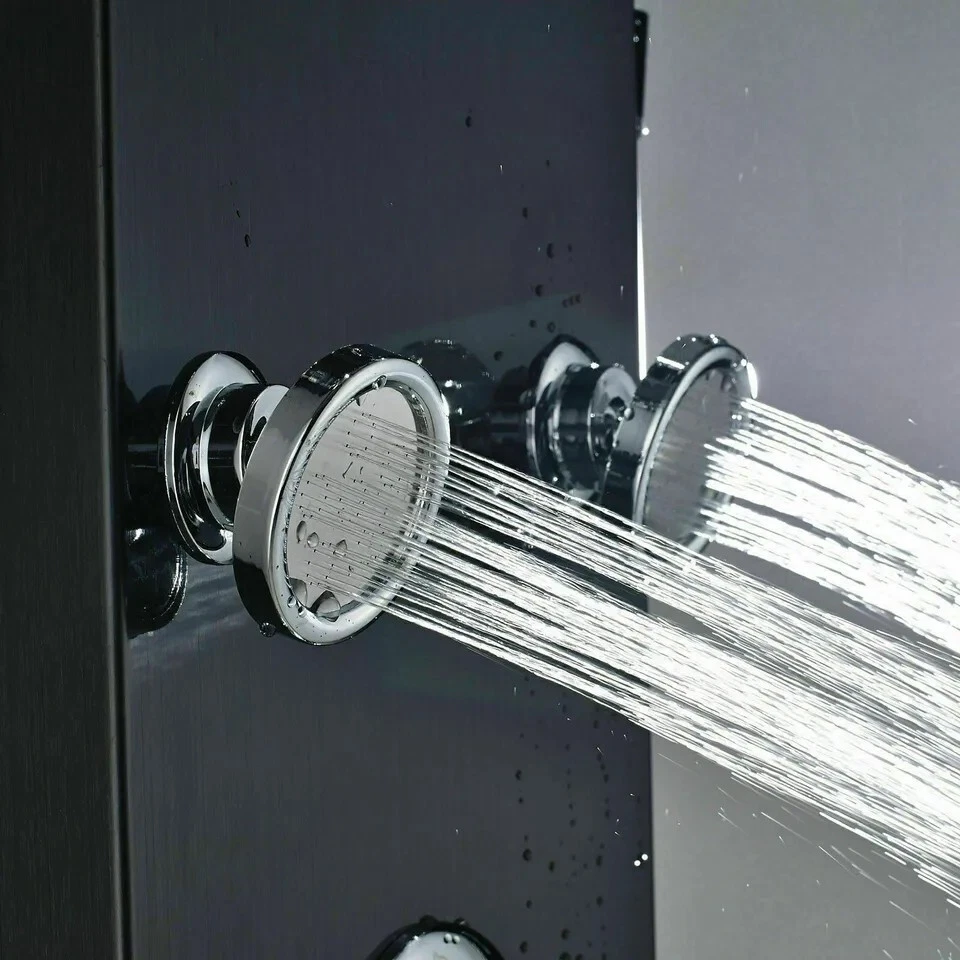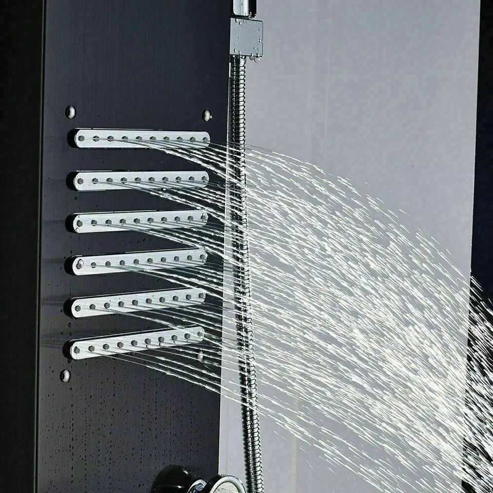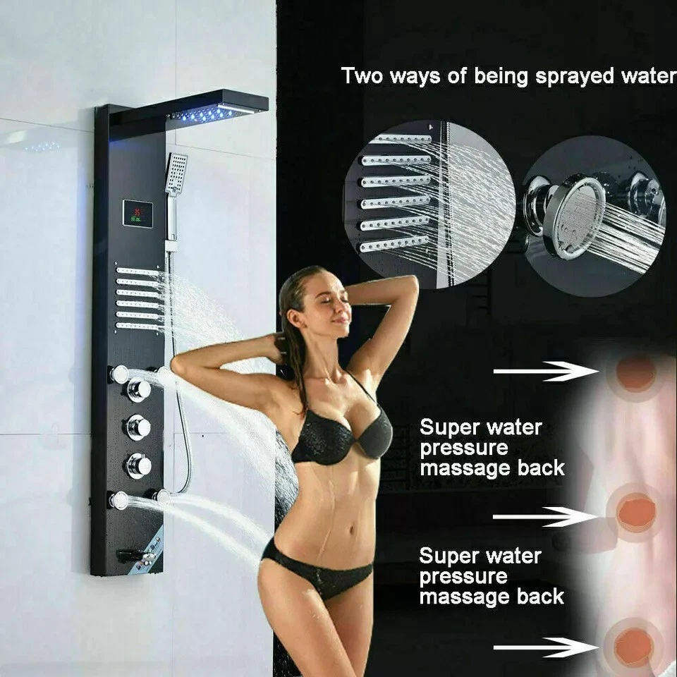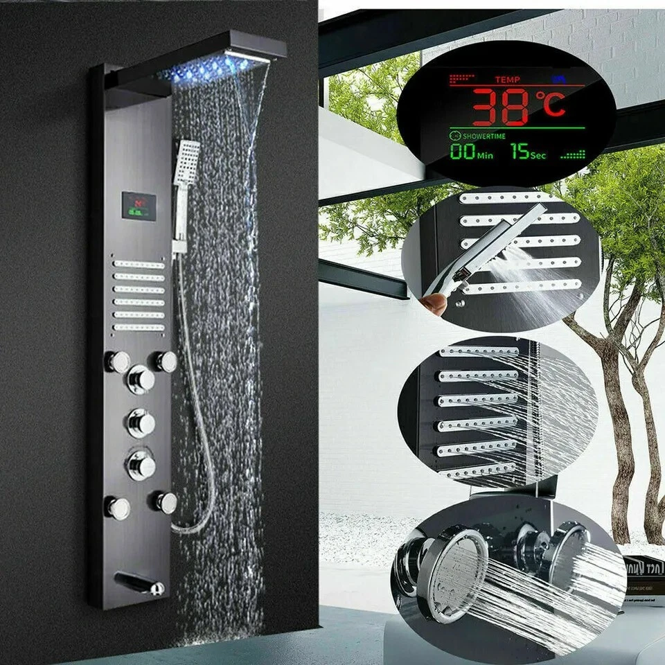 Product description This Shower Panel is constructed with the highest quality SUS304 stainless steel .It has waterfall shower head, rainfall shower head,handheld shower,massage spa sprayer,tub spout 5 ways water outlet. Immerse yourself in a truly relaxing shower experience and enjoy the modern style of this beautifully designed shower panel. Function: LED Shower Faucet Panel Material: SUS304 Stainless Steel Hand Shower Material:ABS Plastic Function: Shower Faucet Material: stainless steel Overall Height:44" Easy to install Finish:Matte Black Functions: 5 Modes (Rainfall ,Waterfall head,Horizontal Massage Spray, Hand Shower, Low Spout) Single switch control. one function at a time. Installation Method: Wall Mounted 59" long stainless steel chrome hand shower hose Water Flow:1.8 GPM Warranty: 5 years Water come out functions: rainfall shower head waterfall shower head massage jets hand shower tub spout Payment Only PayPal is Accepted. Immediately payment is required after the Winning Bid or Buy it Now Shipping Usually shipment can be arranged within 1 working days after receiving payment. We ship according to the address on PayPal. (After you make the payment, PayPal will send us an email automatically, informing us the payment and shipping address.) So please make sure your address on PayPal is the right one.We do not ship to PO.BOX address Mail transit time is best estimated, but not guaranteed. As transit time varies. Buyer is responsible for return shipment. Contact us If you have any questions, please be free to contact with us,we will answer your questions ASAP. We will answer your question via email, please check your email for the answers. Feedback I describe items as well as I can. If I have missed something, please let me know. Please e-mail me before leaving feedback if you are unhappy with your item, so we can work it out. International Buyers – Please Note: Import duties, taxes, and charges are not included in the item price or shipping cost