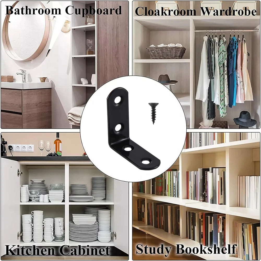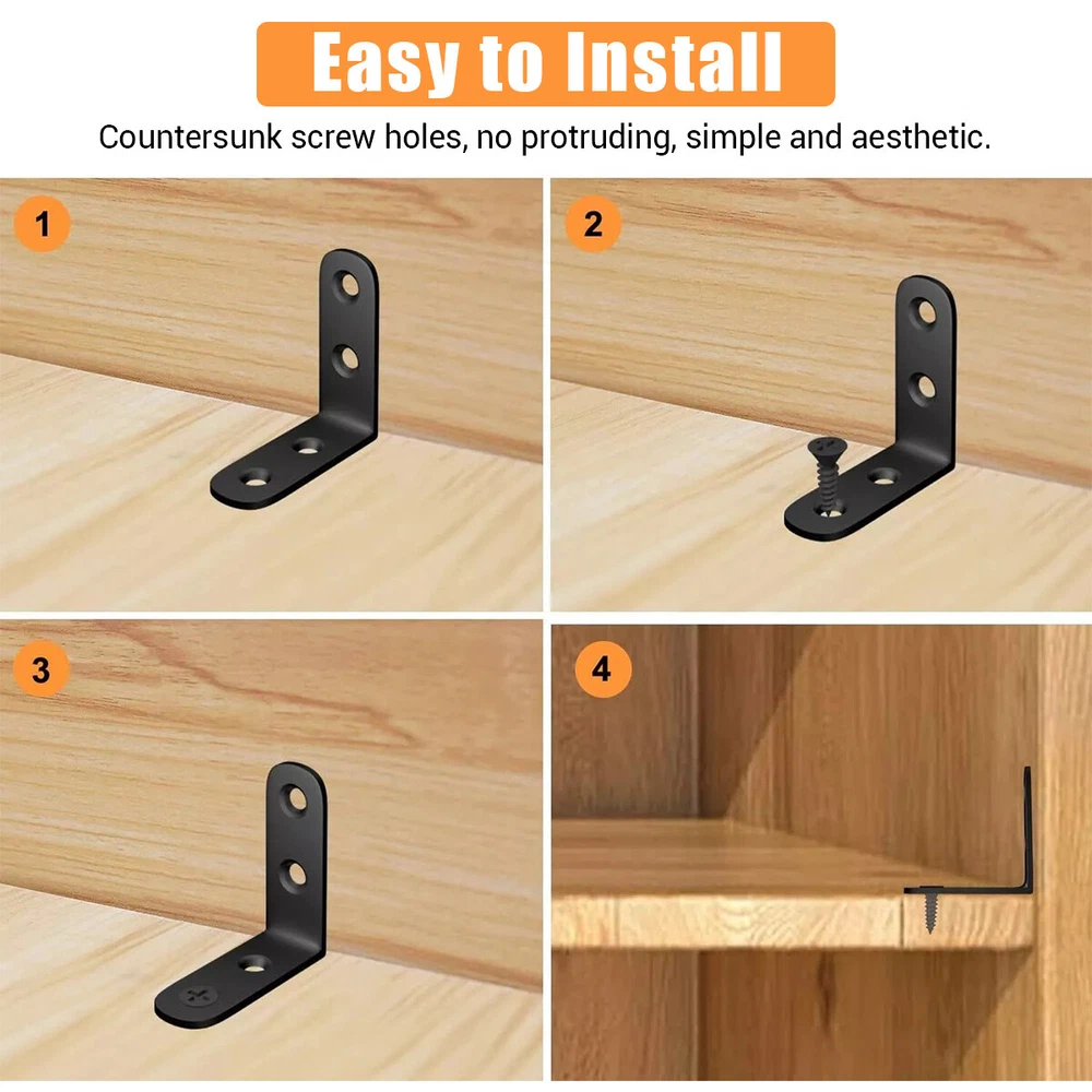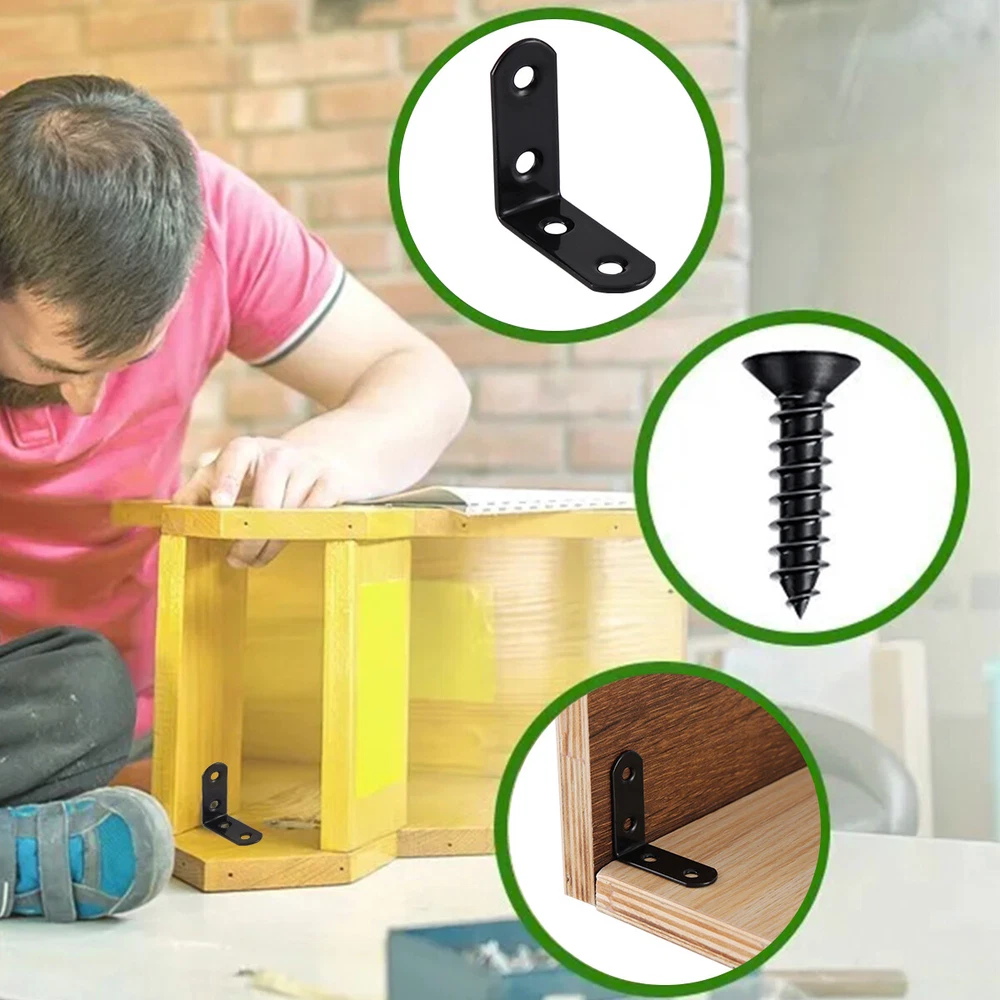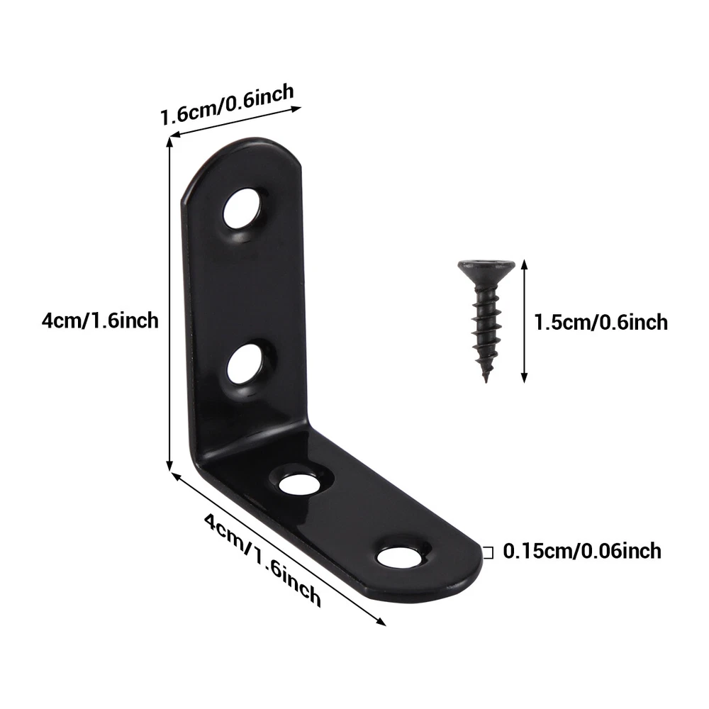 Stainless Steel L-Shaped Bracket Corner Brace 1.5in 90 Degree Angle Corner Lot FEATURES: 【Material】The corner brackets are made of stainless steel with better rust resistance. 【Function】This corner brace is an important fasterner to make furniture stay firm. 【Dimension】40mm/1.57" x 16mm/0.63" x 40mm/1.57" (L x W x H);Thickness: 2mm;Mounting Hole Dia:5mm/0.19" 【Application】Work perfectly for a table, office desk; reinforcing a broom closet door, drawer, angle joints, seams and cracks. 【Sinked Hole Design】The screw hole is designed to sink. After installation, the screw will not protrude, making it more beautiful. SPECIFICATIONS: Type : Corner brackets Material : Stainless steel Color : Black Thickness : 2mm/0.08in Hole Dia. : 5mm/0.19in Hole Quantity : 4 holes M4 Screw Length : 15mm/0.6in Max. Load : 35 lbs for a pair. If you want to use the angle brackets for more heavy duty work, you could use more stainless steel shelf brackets to support the shelves. PACKAGE INCLUDED: 10-500 Pcs 1.5 inch corner brackets Payment Return Warranty Shipping Contact us Payment 1. We accept payment via PayPal. Use PayPal at checkout to pay with credit or debit. 2. Immediate payment is required. Shipping will be arranged within 1 business day once payment is cleared. Return 1. We stand behind our items and offer 60 days warranty. All items are in new and working condition unless specified otherwise elsewhere in the description. 2. All Returns - defective or otherwise - MUST BE PREAUTHORIZED to guarantee refund or exchange. Please contact us to get an authorization and return address. 3. Buyer agrees to pay for the cost of re-shipment for undeliverable or wrong addresses. 4. Buyer is responsible for Return Postage as well as a 20% restocking fee if return/replacement is not a result of our mistake such as wrong item. 5. Replacement or Refund will be made upon receipt of the returned item. Please include tracking number so we can process ASAP. If you do not wish to wait for a replacement, please repurchase the item. 6. ALL REFUNDS will be processed via PayPal. Please double check via PayPal history and transaction for confirmation. PayPal will send it back to whatever you used to pay within 3-5 days. Warranty The warranty shall not apply to the following circumstances: a) Damage caused by undue ware&tear, misuse, improper installation or operation, neglect, accidents. b) Damage caused by natural disaters, flood, fire, lightning or pollution. c) If item was opened, any parts removed or repaired by any unauthorized person. Shipping FREE SAME BUSINESS DAY MONDAY- FRIDAY SHIPPING FROM USA. All orders and payments received before 4PM EST (1PM PST) will be shipped the same business day. All other orders within 1 business day. No shipping on Weekends or US Public Holidays. No responsibility for any custom duty Shipping information will be updated when available. Contact us We have always been trying to provide the best service and reliable products for every customer, however, accident may happen sometimes, please contact us to resolve any issue before leaving a negative feedback.