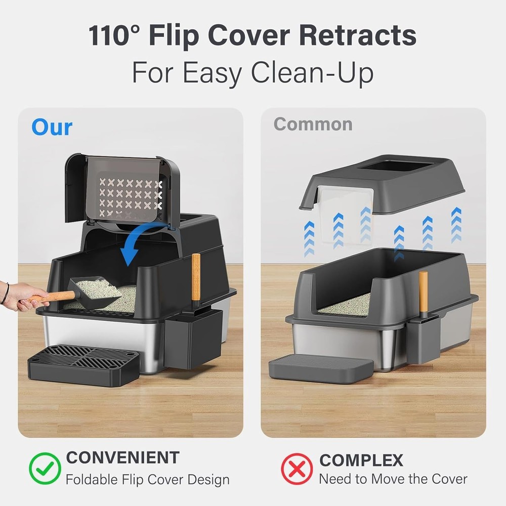 bout this item 【Preferred 304 Stainless Steel】Unlike plastic litter boxes, the high quality and sturdy stainless steel litter box lid prevents odors, is more durable and easier to clean, and can even last up to 5+ years of service life. The stainless steel litter box with the included anti-slip sticker ensures that your cat won't shift or tip over when digging 【Suitable For All Cats】The XL cat litter box with lid measures 24" * 15.8" * 15.4" and has an a large capacity of 65L for all cats weighing 1-30 lbs. The 6" deep covered litter box holds up to 38L of litter, which is enough for an adult cat to use for about 25-30 days. Say goodbye to constant litter changes and enjoy peace of mind while you're away 【Fast Cleaning】Our innovative 110° flip-top lid allows for effortless scooping without the need to completely remove the lid, saving you time and effort. When it's time for a thorough clean, the removable design enables easy access and thorough sweeping, ensuring a sanitary environment for your beloved pet. Plus, the wooden handle provides a comfortable grip for hassle-free cleaning 【Customizable and Versatile Design】Our extra large cat litter box features a versatile design that can be easily customized to suit your cat's size and preferences. Whether your furry friend prefers an enclosed or semi-enclosed cat litter box, our easy-to-assemble design supports multiple configurations. The high sided enclosure cat litter box ensures privacy and prevents litter scatter, while the semi-enclosed option promotes ventilation and simplifies cleaning