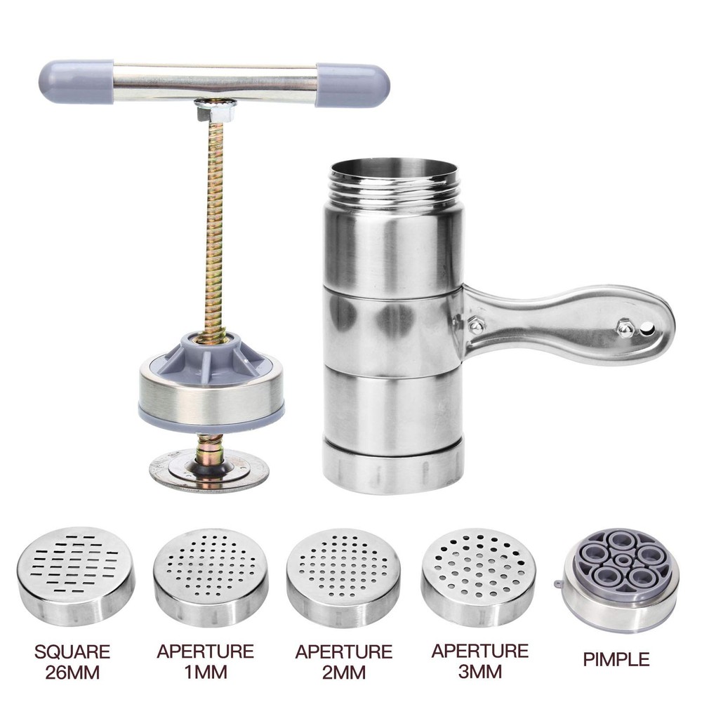 Stainless Steel Manual Noodle Pasta Maker Spaghetti Press Kitchen Press Machine Simply unscrew and change the moulds discs then you can make spaghetti fettuccine pasta noodle by yourself and it is easy to unscrew all the components for hand washing By using a simple turning motion that you can instantly change regular dough into different sizes of noodle or juicing the fruits with the handle, work smoothly and durable Helpful kitchen tool for making noodle, pasta and squeezing the fruits into juice; As creative gift for your cooking friends, mother and even a chef, cooker Control the proper mix of water and flour when you make a dough in order to avoid noodle breaking or sticking and exerting the machine's function to the best extent 100% Brand new and high quality Main function: Make dilicious noodle and extract juice Easy operation, save time Natural and harmless, tasteless and non corrosive Can be cleaned by water and keep as bright as when new Flat noodle width: 5mm; Round noodle diameter: 1mm/2mm/3mm Making noodle: 1. Knead dough with water to make it soft(Add some edible oil would be better) 2. Unscrew the cover and put the dough, vegetable or have cut fruits into the drum, then screw the handle and noodle or juice will come out 3. Put the bottom of machine close to water for easy coming out 4. After usage, disassemble it and wash with water Color: As shown in the picture Material: Mainly Stainless steel Noodle machine height: Approx. 18cm; Drum height: Approx. 14cm; Diameter: Approx. 6cm; Inner hole:Approx. 5cm Included: 1 x Noodle Press Machine 5 x Noodle Moulds operate :Twist the rotation rod after fill a soft dough inside the main cylinder of the noodle press, then the noodle will come out from the mould; Help you making thin, middle, thick paste, udon, spaghetti, fettuccine and etc A useful home kitchen noodle press maker, helping you to make different size of noodle and it can also be used for little lemon, lime, citrus pressing Package includes: 1 * Noodle maker 5 * Module ergonomic grip on the rotation rod and a stainless steel holding handle, one hand to hold the middle handle and the other hand to rotate the rod; Easily squeezing dough and use less effort Simply unscrew and change the moulds discs then you can make spaghetti fettuccine pasta noodle by yourself High Quality and Brand New Easy to operate and wash with water Perfect for home or restaurant use Natural and harmless, tasteless and non corrosive
