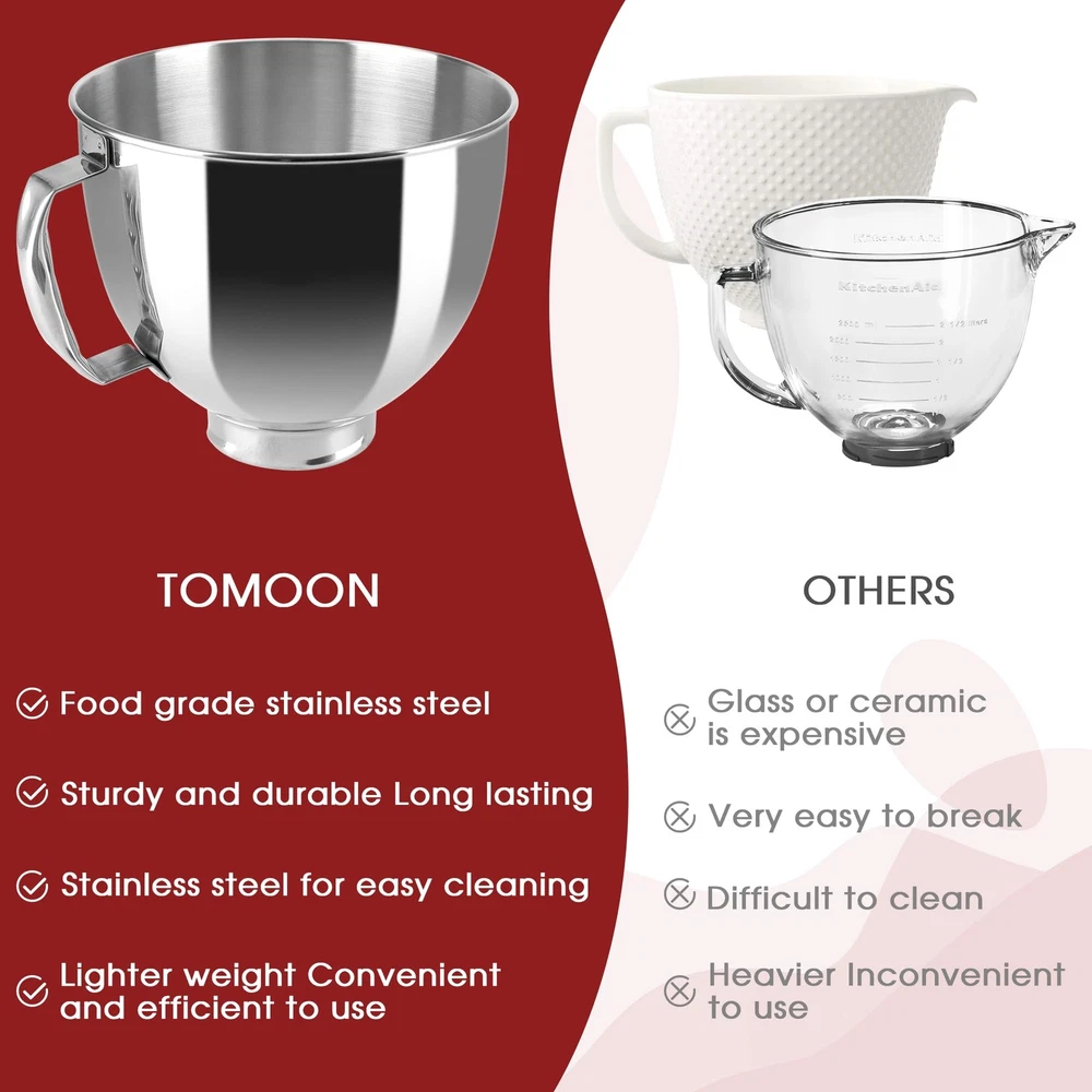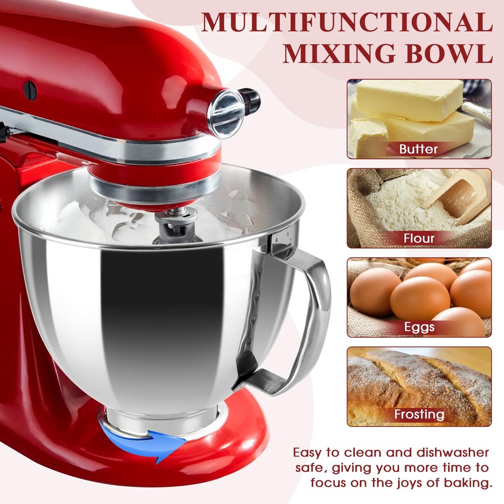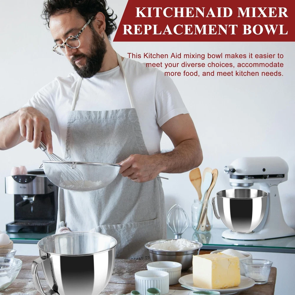 This stainless steel bowl,large bowl for kitchenaid mixer, is compatible with all 4.5 and 5 Quart KitchenAid tilt-head household Stand Mixers, includingKseries K45, K45SS, KN15E1X, KSM75, KSM85PS, KSM88PSQ and KSM series KSM90, KSM95, KSM96, KSM97, KSM100, KSM103, KSM105, KSM110 ,KSM120, KSM150, KSM150A, KSM151PS, KSM152, KSM153, KSM154, KSM155 KSM158, KSM160A, KSM175,KSM180RPMB ,KSM180, KSM180LEBK. This stainless steel stand mixer bowl for KitchenAid stand mixers,KitchenAid Mixer Accessories, is composed of premium quality 304 food-grade stainless Steel durable, scratch-resistant, and which assures endurance in a range of temperatures. Our stainless steel kitchen aid mixer bowl with handle boasts ample space to handle large quantities of dough or batter, making it the perfect solution for baking multiple loaves of bread, batches of cookies, or larger cakes with ease. Its spacious design lets you prepare up to 4-5 large loaves of bread or 3-4 cakes, guaranteeing convenience and efficiency in all your baking endeavors. Multi-Purposes--This kitchen aid mixer bowl for stand mixer can be used as original kitchenaid mixer bowl in both material and function. It's sturdy and durable. This kitchenaid mixer attachments bowl is your real kitchen friend which can aid you in mixing flours/icecream/ beating eggs and blending salads.It can be bought as a KitchenAid bowl who excels in the kitchen when it comes to baking tasks. Dishwasher Safe -- This mixer bowl can be washed in dishwasher and you can be carefree about stains left on it after using. KITCHEN AID ACCESSORIES: Compatible with 4.5QT and Artisan 5QT KitchenAid Tilt Stand Mixers with 5KSM125, 5KSM150, 5KSM175, 5KSM7580, KSM150, K45, K45SS, KSM75, KSM90, KSM95, KSM100, KSM103, KSM110, RRK150 and more. KSM110, RRK150 and more compatible (please check your mixer model) LARGE CAPACITY MIXING BOWL:Our KitchenAid bowls for stand mixer giving you plenty of room for mixing dough, batter, and more—no spills, no mess! The sturdy handle ensures a secure grip while pouring or transferring,ensuring smooth, efficient blending every time QUALITY STAINLESS STEEL:Stainless steel attachment for mixers bowls are made of high quality 304 stainless steel, food-grade, rust-proof, and won’t absorb stains or odors,does not attract odors or stains.Kitchen aid mixers accessories are suitable for a variety of kitchen baking DISHWASHER CLEAN: No scrubbing needed! This Kitchen Aid bowl for mixer is dishwasher-safe for quick cleanup—just toss it in or hand wash with warm soapy water. Spend less time cleaning and more time baking ABOUT :Unlike flimsy plastic bowls, our stainless steel KitchenAid mixing bowl is durable, scratch-resistant, and built for long-term use—perfect for home bakers and pros alike!We produce professional kitchen baking parts and accessories, if you have any dissatisfaction with our kitchen aid mixer bowl , please through , our team will be happy to help you