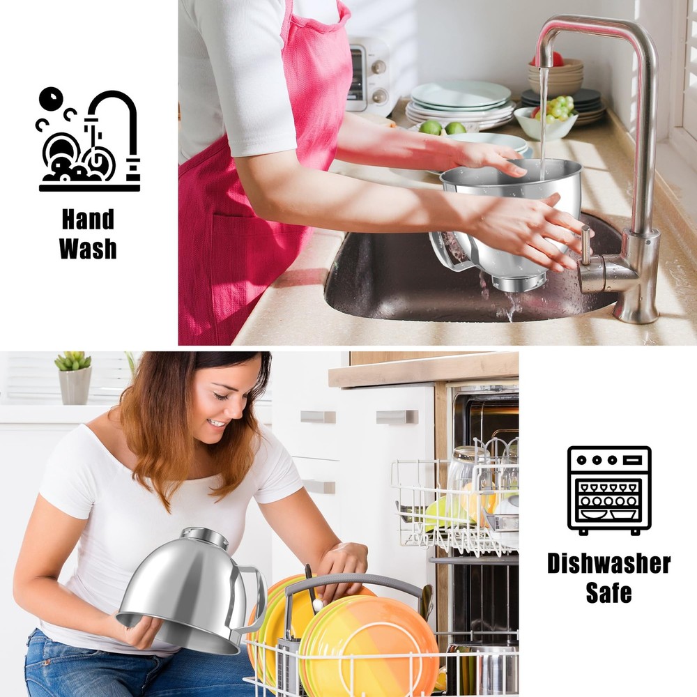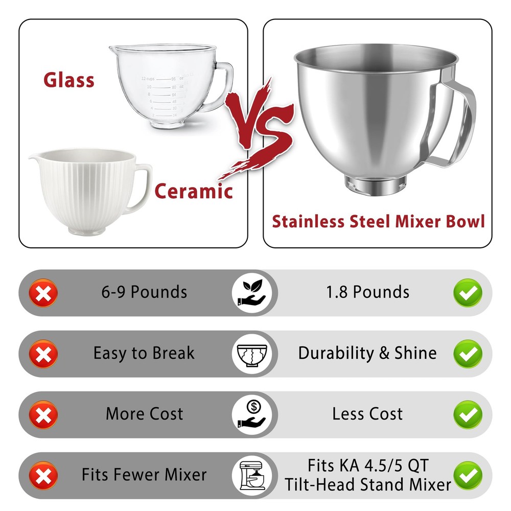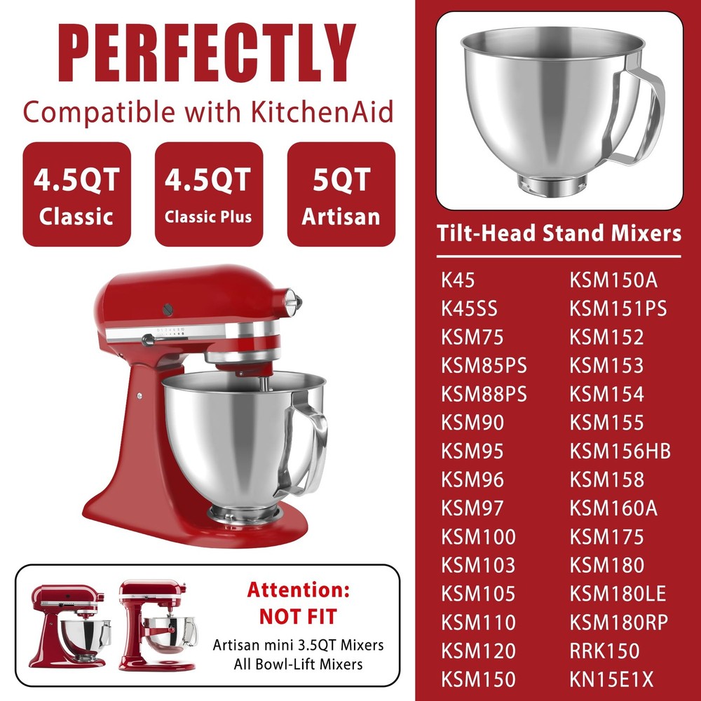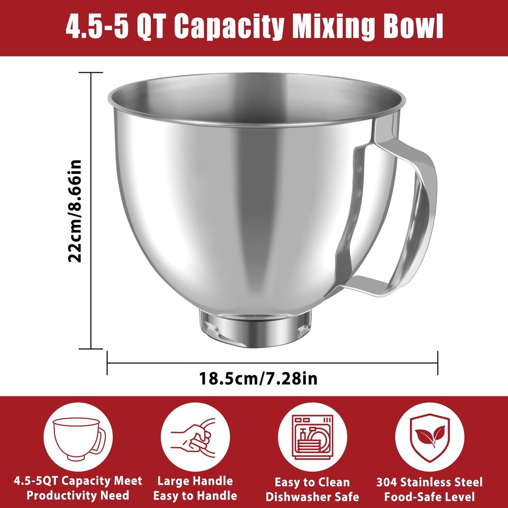 Stainless steel attachment for mixers bowls fits all 4. 5 -5 Quart KA Tilt-Head stand mixers K45SS, KSM75, KSM150, KSM152, KSM165, KSM100, KSM95 and more. (Please confirm your mixer model before purchasing a stand mixer bowl) 【Seamless Compatibility】Stainless steel attachment for mixers bowls fits all 4. 5 -5 Quart KA Tilt-Head stand mixers K45SS, KSM75, KSM150, KSM152, KSM165, KSM100, KSM95 and more. (Please confirm your mixer model before purchasing a stand mixer bowl) 【Capacity Mixing Bowl with Handle】 Mixer bowl made of High Quality premium 304 stainless steel, food-grade and nontoxic, not easy to rust and durable ,you can heat it up or freeze it in the oven or refrigerator along with the baking ingredients.(Oven temperature should not exceed 500°F) 【Easy to Bake and Easy to Clean】Effortlessly mix thick batters and dough for bread, cookies,suitable for potato, pasta, cheese frosting and cake, perfect for kitchen aid mixers bowls. This stainless steel mixing bowl for KA mixer accessories has a smooth surface and is not easy to adhere to food residue. This makes cleaning very easy, you can easily wash the mixing bowl by hand or put it in the dishwasher. 【Multi-Purposes】This mixer bowl can be used as original mixer bowl in both material and function. It's sturdy and durable. This mixer attachments bowl is your real kitchen friend which can aid you in mixing flours/ice-cream/ beating eggs and blending salads.It can be bought as a KA replacement bowl who excels in the kitchen when it comes to baking tasks. 【Ideal Gift】This mixing bowl for KA is accessible to make all kinds of delicacies, suitable for baking lovers. It's the best gift for your wife, friends, parents, or relatives on Christmas, birthdays, weddings etc. If you have any questions about our product, please feel free to contact us.