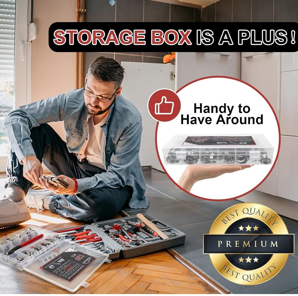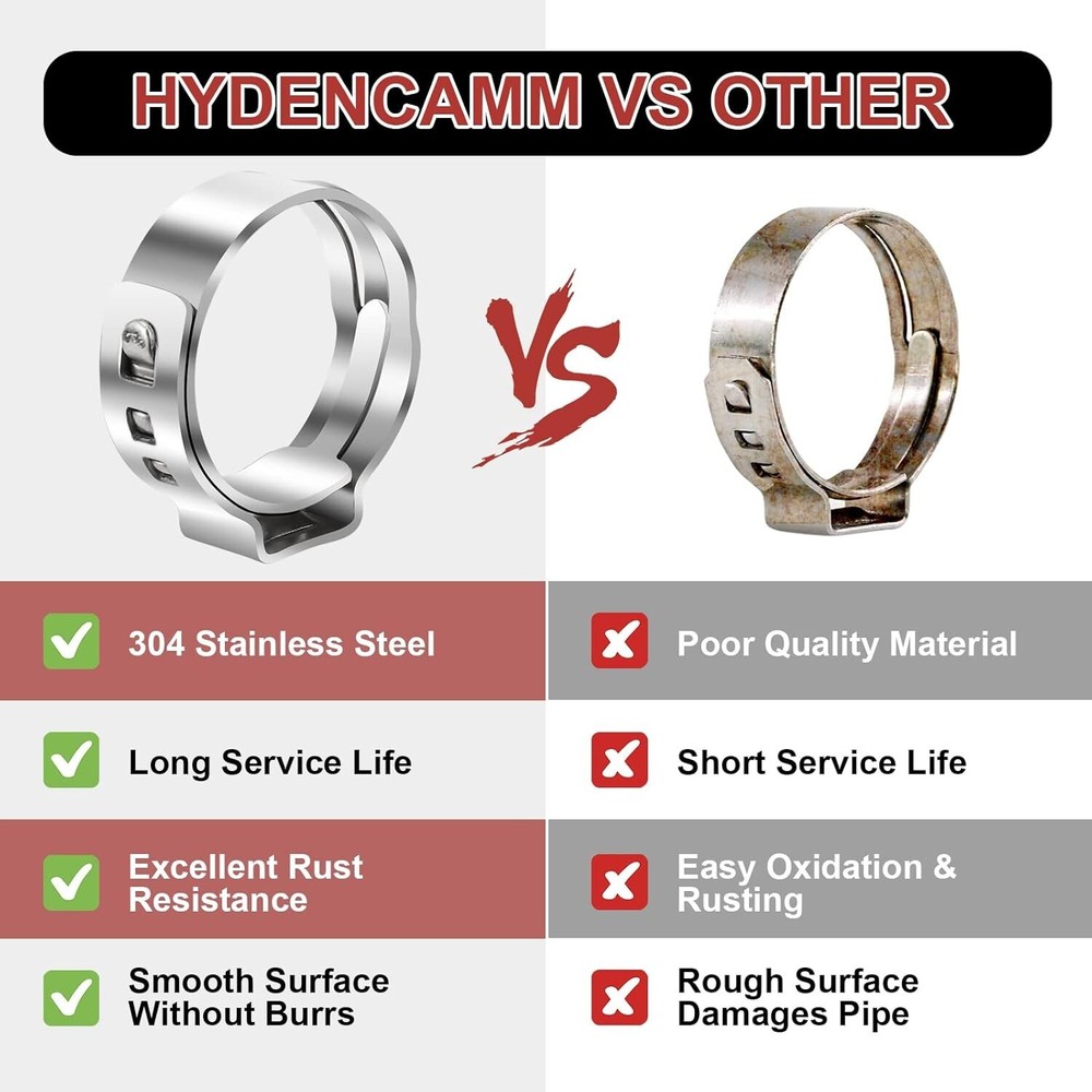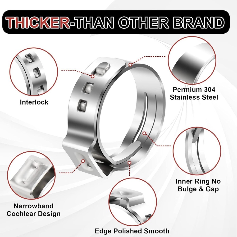 120PCS PEX Clamps Kit W/ Plier, 304 Stainless Steel Cinch Rings for PEX Fittings Size Range & Quantity: The PEX clamps kit compatible to work with all brand stainless steel clamps. 25 pcs 3/8'', 35 pcs 1/2'', 20 pcs 5/8'', 30 pcs 3/4'' and 10 pcs 1'' PEX rings to meet your needs for different applications. Upgrade Quality: Thicker and heavier than other pex crimp rings. No burrs, no misshapen parts, the fit and finish is nice and the ability to hold tight is as it should be. Very cost effective and works perfectly. A great selection of one time use clamps. Storage Case: PEX cinch clamps kit assortment come within a storage case, easy to store and carry. The size range is engraved on each PEX clamps which makes it easy to identify the right size of the tube clamp. The storage box is a plus. Heavy Duty 304 Stainless Steel: Crimp rings pinch clamps will seal the pipe 360° tightly. It has higher salt resistance, rust resistance, corrosion resistance, water resistance and oil resistance. Seals good and nice and clean looking. A must have for marine servicing. 304 stainless steel single ear hose clamp is widely used in industry, automobile, electronics and household applications. 1.Light weight, less interference. 2.Cuff force more concentrated, uniform surface compression. 3.Interlocking ring 360° seal protection. 4.Universal for all PEX pipe fitting How To Use. The correct way to use these clamps is to ensure that there is not too much slack between the clamp and the hose. The clamps should fit snug around the hose so that when the tool compresses the clamp will tighten evenly without any slack to the compression. Advantage They are stainless and so they won't rust and they don't leak. No burrs, no misshapen parts. All fit well and worked even better. Worked perfectly for me to attach some fuel lines, air lines, vacuum and garden hose. Fit correctly, and they crimped nicely. The joints would not rotate, and were watertight.