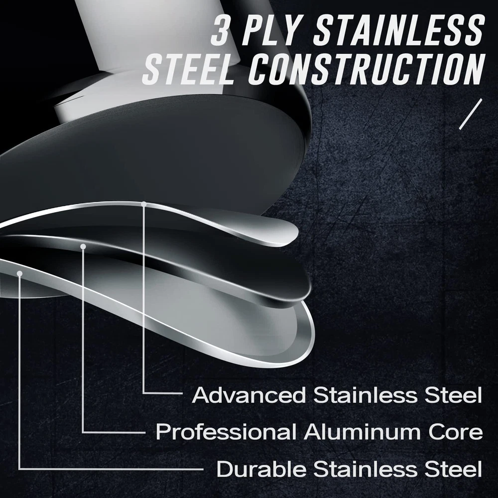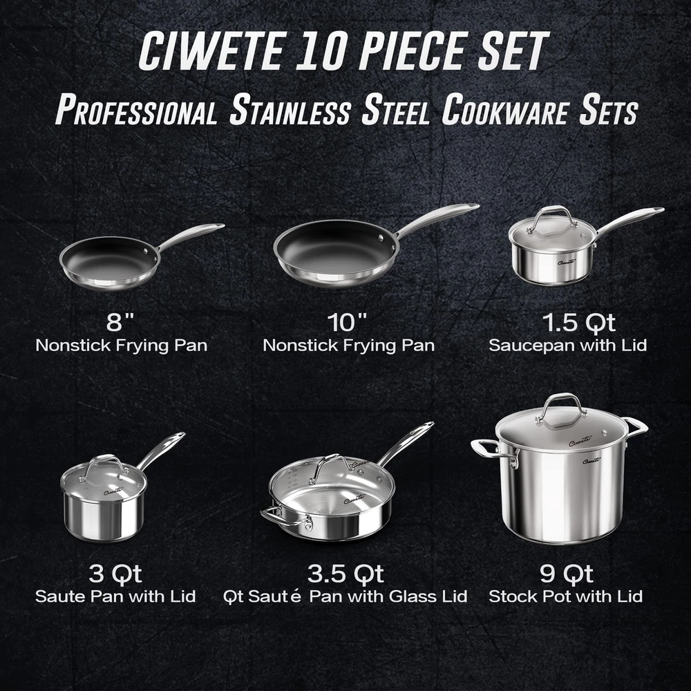 【10 PC Cookware Set】Include: 8'' & 10'' Nonstick Frying Pan, 1.5 Qt Saucepan with Lid, 3 Qt Saucepan with Lid, 3 Qt Saute Pan with Lid, 9 Qt Stock Pot with Lid. Daily stir-frying, party and dinner preparation is a must need kitchen help, is the family pots and pans set 【3 Ply Stainless Steel Construction】Professional aluminum core, inside and outside advanced stainless steel wrap design, so the steel pot is heated more evenly, compared to the thin stainless steel pot is also more sturdy. 【Precise & Practical Design】The ergonomic handle of integrated molding, the V-shaped design of the handle and the pot body, maximizes the user's feeling, improves the grip feeling and reduces the heat conduction. This is true not only of our pans, but also of the handle of the lid. 【Nonstick coating frying pans】In order to reduce the trouble of frying sticking, we introduced a new set of non-stick coating frying pan. The bottom of the pan is still Tri-ply of stainless steel design. If you are not used to it, we also provide 11PC full Tri-Ply stainless steel pots and pans set for you (Asin: B09P5XGQN3) 【Use & Care Tips】 Suitable for all stove tops(electric, gas, ceramic, glass) ; Oven safe up to 400 ℉ (lids upto 350 ℉); Dishwasher safe; PFOA, lead and cadmium free 【Sincere Service & Quality Assurance】 Lifetime Limited warranty. is committed to providing good purchase and after-sales experience, any questions please contact us anytime :)