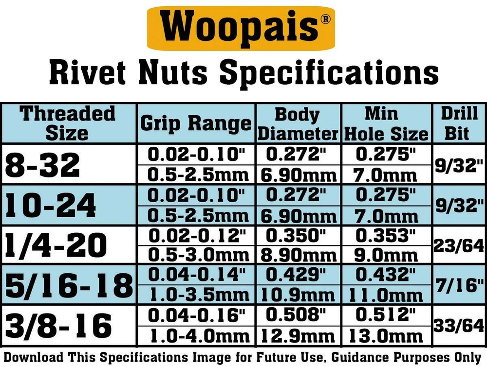 For Detailed Specification of the rivet nuts, please review the 5th image, if neccessary, please download it for future reference. Quantity: rivet nut 8-32-----------------20 rivet nut 10-24-----------------20 rivet nut 1/4-20-----------------20 rivet nut 5/16-18-----------------10 rivet nut 3/8-16-----------------7 TOTAL: 77pcs 5 Sizes Stainless Steel Rivet Nut. Same size Rivet Nuts are stored in one compartment with product labels showing the sizes ( 8-32, 10-24, 1/4-20, 5/16-18, 3/8-16) so that you can easily distinguish the size and chose the right Rivet Nuts you want. A Rivet Nut fastener is a tubular rivet with internal thread which can be installed in seconds form one side of the work. Once installed, no finishing work is required on the RIVNUT fastener. The added benefit of not only being a dependable fastener, they are ready to use with clean threads available for screw attachments. Rivet Nuts also are used when an application has little or no access to the backside as they can be installed from the front side of the work piece. Stainless Steel Rivet Nuts Threaded Insert Nutsert 77 pcs 5 Sizes #8-32 #10-24 / 1/4"-20 / 5/16"-18 / 3/8"-16 Rivnuts. 20pcs stainless steel 1/4-20 rivet nuts + 20pcs stainless steel 10-24 rivet nuts + 20pcs stainless steel 8-32 rivet nuts + 10pcs stainless steel 5/16-18 rivet nuts + 7pcs stainless steel 3/8-16 rivet nuts. Thread size: rivet nut 8-32, rivet nut 10-24, rivet nut 1/4-20, rivet nut 5/16-18,rivet nut 3/8-16. Application: rivet nuts for automotive, furniture, decoration and other electrical and industrial products. Package comes with clear plastic box for easy storage, compartments with product labels (8-32, 10-24, 1/4-20, 5/16-18, 3/8-16) for easy distinguish.