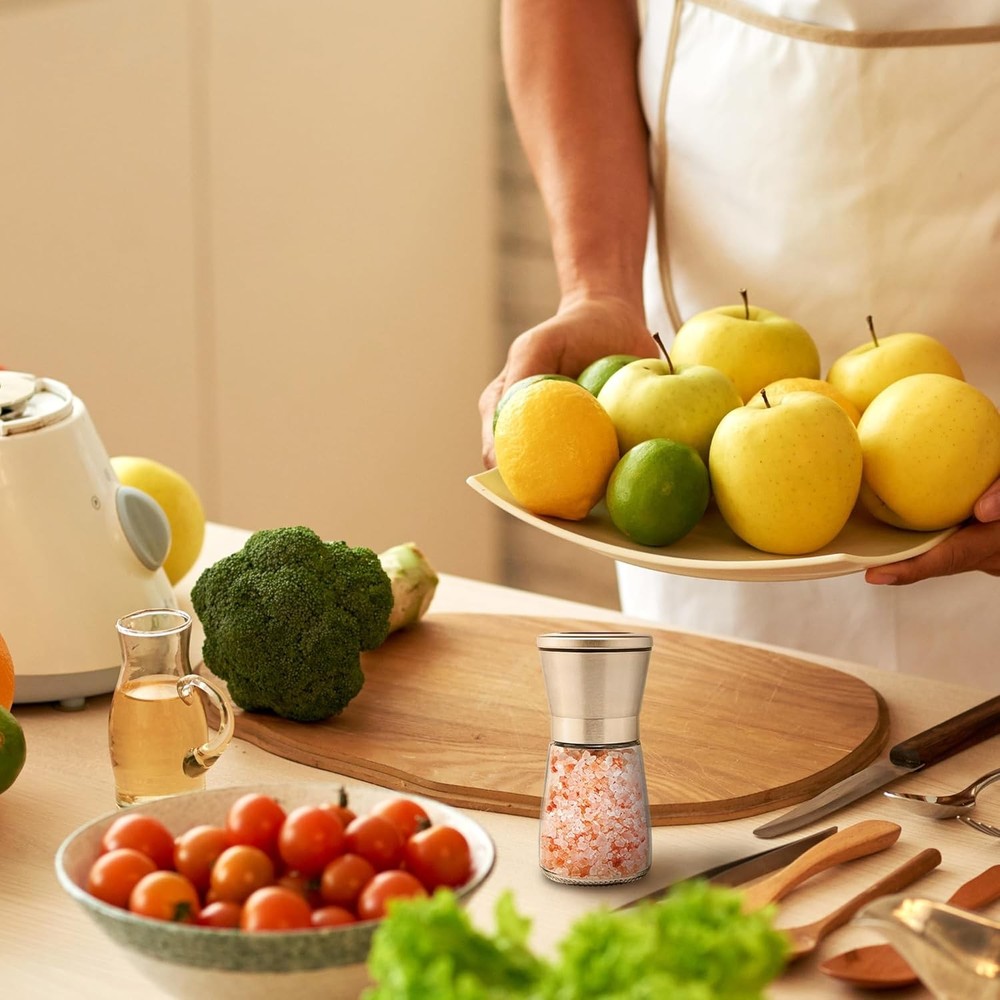 ✅ 【Premium Quality】M JINGMEI salt and pepper grinder set is crafted from BPA-free glass, featuring an anti-corrosion brushed stainless steel cap and a durable ceramic grinding core. This refillable grinder set, which includes both salt and pepper mills, is built to last and makes the perfect addition to your kitchen (Note: Salt and pepper not included). ✅ 【Elegant and Functional Design】The grinding mechanism of the sea salt grinder and pepper mill grinder is located at the top, preventing salt and pepper from spilling onto your countertop. The top cap seals tightly to keep your spices dry, ensuring your kitchen stays neat and clean. ✅ 【Comfortable Grip】The ergonomic design of the bottle provides a comfortable grip for easy grinding. Whether you're using it as a pepper mill or salt grinder, the shape of the bottle ensures a smooth, comfortable experience while you season your food. ✅ 【Adjustable Coarseness】Spice grinder manual allows you to easily adjust the grind from fine to coarse by simply turning the knob at the top. You can customize the grind to your preference for perfect seasoning, whether you're using it for salt, black pepper, or any other spice. ✅ 【Easy to Refill】Refillable salt and pepper grinder is simple to refill. To add more sea salt, black pepper, or any other spices, simply remove the stainless steel cap. A free silicone funnel is included to ensure quick, mess-free refills, making it an ideal grinder for kitchen use. ✅ 【Large Capacity】Glass grinder can hold up to 3/4 cup or 6 ounces of sea salt, black peppercorns, or your choice of spices. With this generous capacity, you won’t have to worry about frequent refills, whether you're using it as a black pepper grinder or a salt and pepper mill.