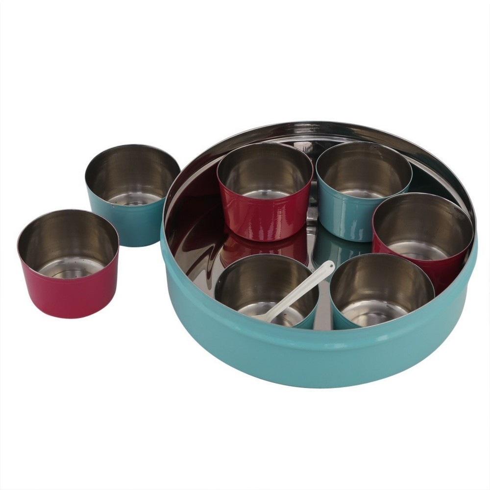 Measurement in cm : 6.5H, 20.5D, Measurement in Inch : 2.5 H, 8 Diameter. 100% Food Safe, Durable Powder Coated Stainless Steel. Care Instructions: Wash and wipe dry with a soft cloth before storing. 7 Small Containers with Spoon come in ASSORTED colors.The Air tight Acrylic lid makes visibility easy. It is commonly used to keep spices such as cumin seeds, cardamon, garam masala, turmeric powder, red chillies, coriander powder and much more! Other than spices, it can be used for your favorite herbs and ingredients that you personally like to use in your daily cooking.