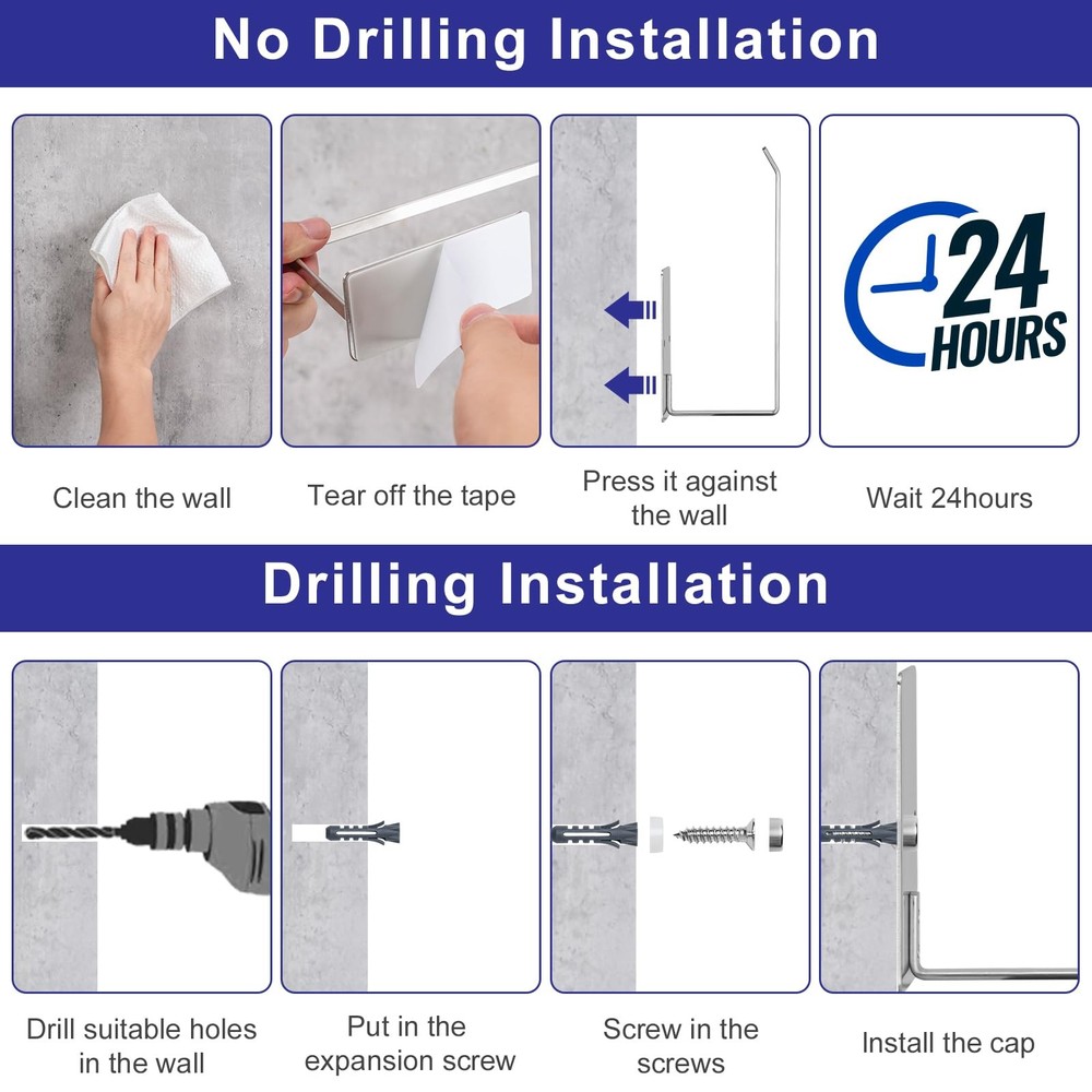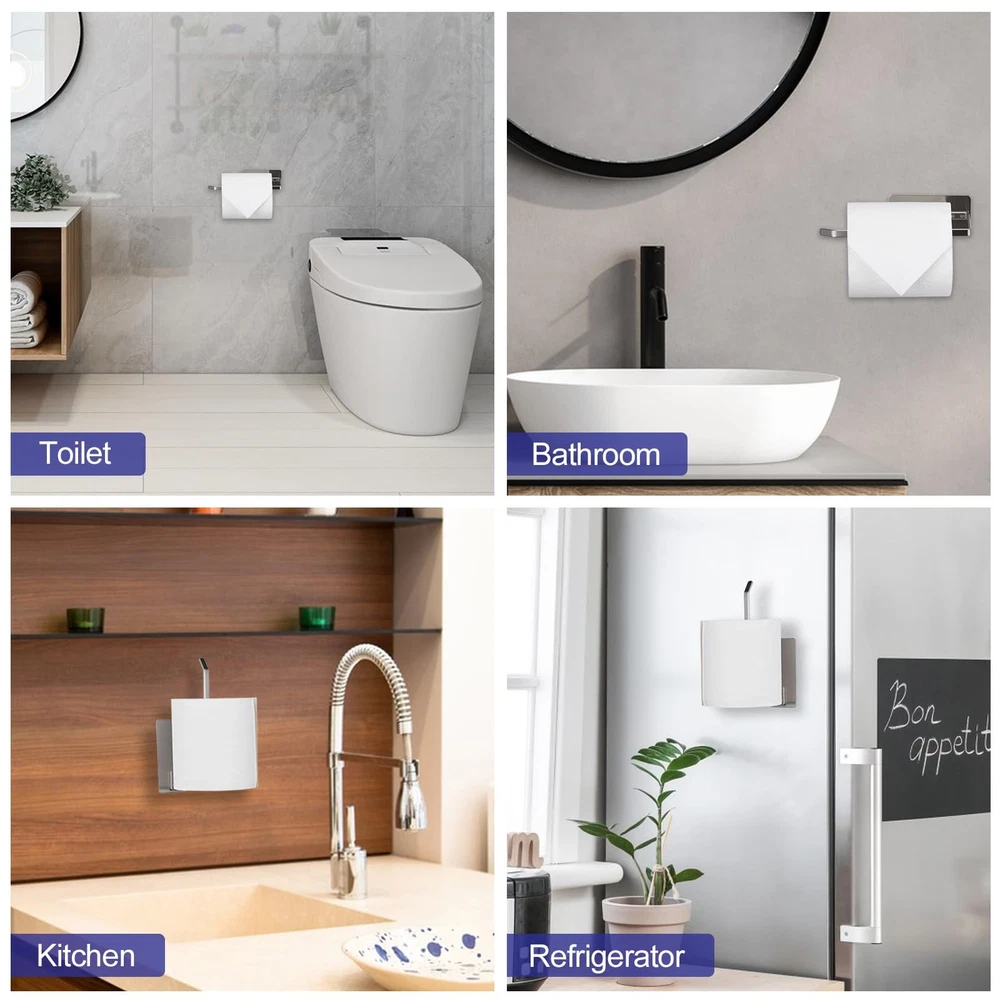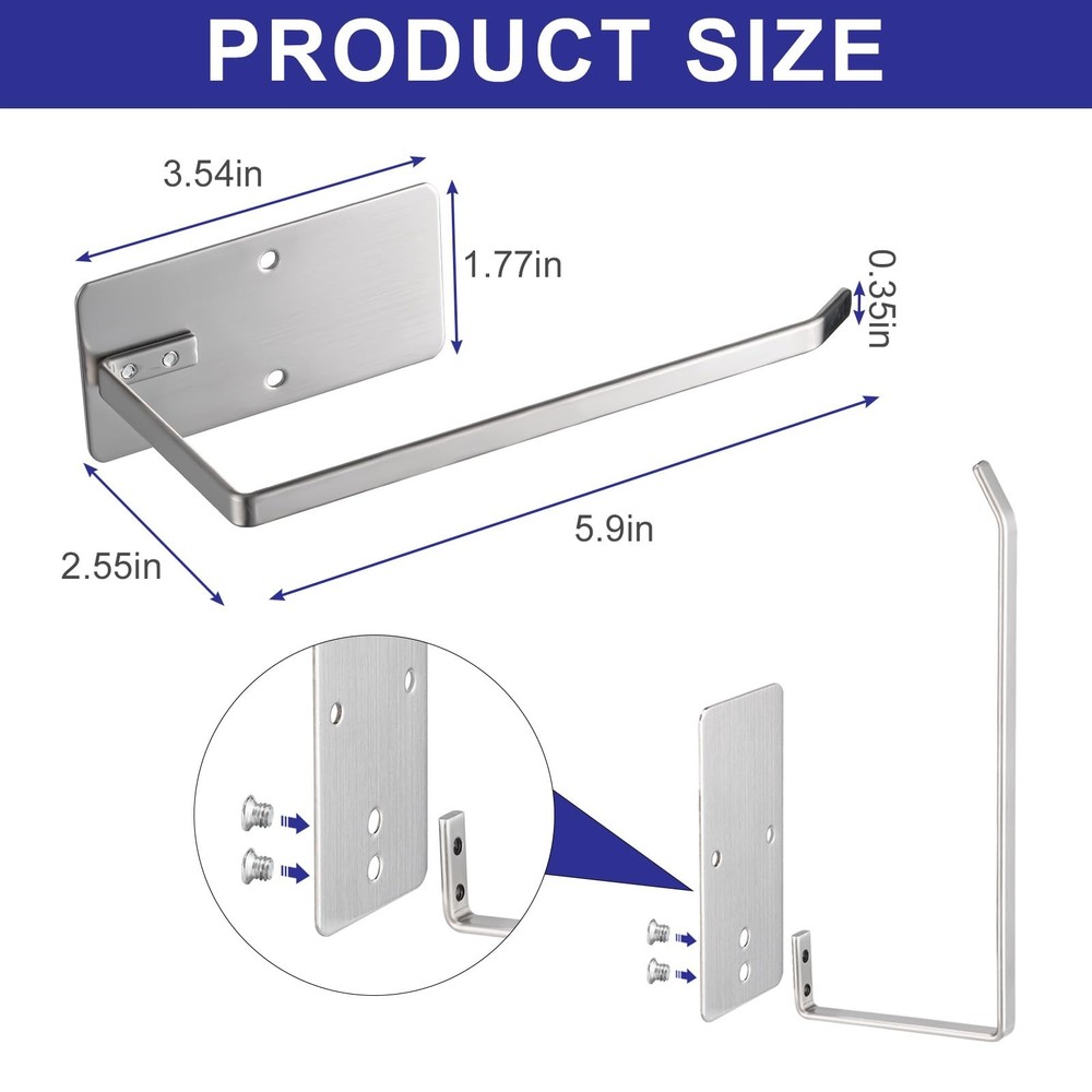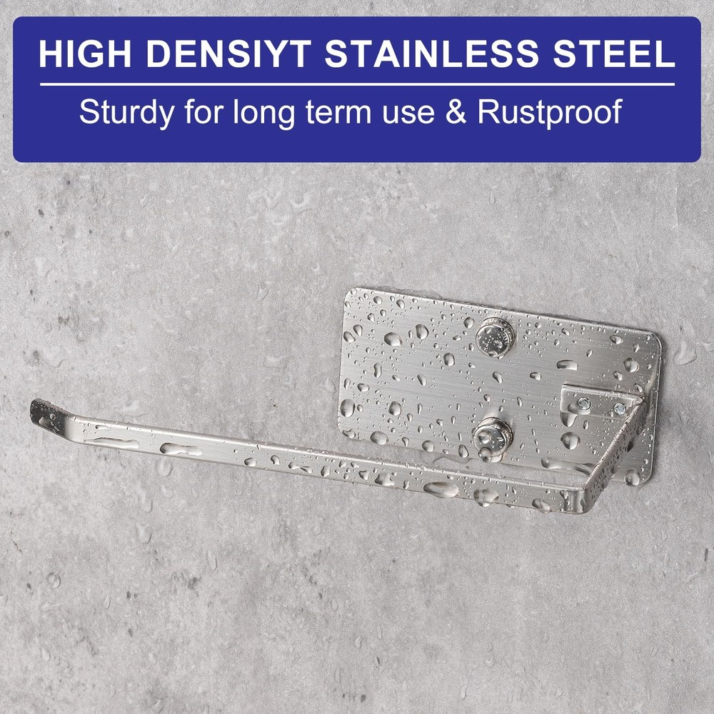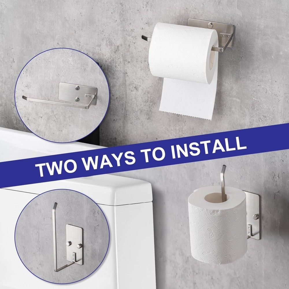 Bathroom Toilet Paper Holder 2Pack,Stainless Steel Toilet Roll Holder,Wall Mounted Self Adhesive Paper Stand for Bathroom, Kitchen, Washroom (Silver) PREMIUM MATERIAL:Made premium material stainless steel manufacture, waterproof, rustproof, anti-scratch, and durability for long-term use, even in damp bathrooms. This toilet paper holder also features a smooth coating for easy cleaning. Just wipe it with a damp cloth and let it air dry. PERFECT SIZE DESIGN: The toilet paper holder features a wall-mounted design, 5.3 inches in length to accommodate large toilet paper rolls, which won't snag or get in the way during daily use. TWO MOUNTING OPTIONS:We are equipped with adhesive tape and several screw accessories for your use. 1.After applying adhesive backing on the back peel the adhesive backing and place it vertically or horizontally on any smooth surface—no drilling needed. 2.Measure the pitch and drill the holes,Use hammer to put the expansion screws into holes,Tighten the inner screw with the screwdriver,Cover the screw cap. ADHESIVE APPLICATION TIPS: Not for use on painted, wallpapered or textured walls. Ensure surface is dry and clean before attaching, press for 30 seconds and wait 24 hours for optimum adhesion. VERSATILE USAGE: paper roll holders support horizontal and vertical mounting, giving you a wide range of options. For bathrooms, toilets, garages, RVs, and more multiple usage scenarios, adding modern elegance to your spaces. The Toilet Paper Holder is the perfect solution for keeping your toilet paper organized and easily accessible in your bathroom, kitchen, washroom, or any other area where you might need it. This wall mount toilet paper holder is made of high-quality stainless steel, ensuring its durability and resistance to rust and water damage.With its self-adhesive design, installation is quick and hassle-free.The strong adhesive ensures a secure hold, allowing you to confidently hang your toilet paper without worrying about it falling off.This toilet roll holder can accommodate standard-sized toilet paper rolls and is designed with a practical open-arm design, making it easy to replace empty rolls. You can rest assured that it will remain in pristine condition even in humid environments such as bathrooms and kitchens. The stainless steel material also makes it easy to clean, simply wipe it down with a damp cloth to keep it looking brand new. Shipping We offer FREE shipping on all orders! We ship within Three business days of payment, usually sooner. We use a selection of shipping services such as UPS, FedEx, USPS etc. We only ship to the lower 48 states, no APO/FPO addresses or PO Boxes allowed. Local pickups and combined shipping options are not provided at this time. Return You can return a product for up to 30 days from the date you purchased it. Any product you return must be in the same condition you received it and in the original packaging. Please keep the receipt. Payment We accept payment by any of the following methods: PayPal Please pay as soon as possible after winning an auction, as that will allow us to post your item to you sooner! Feedback Customer satisfaction is very important to us. If you have any problem with your order, please contact us and we will do our best to make you satisfied. Contact Us If you have any queries, please contact us via ebay. We usually respond within 24 hours on weekdays. Please visit our eBay store to check out other items for sale! Thank you for shopping at our store.