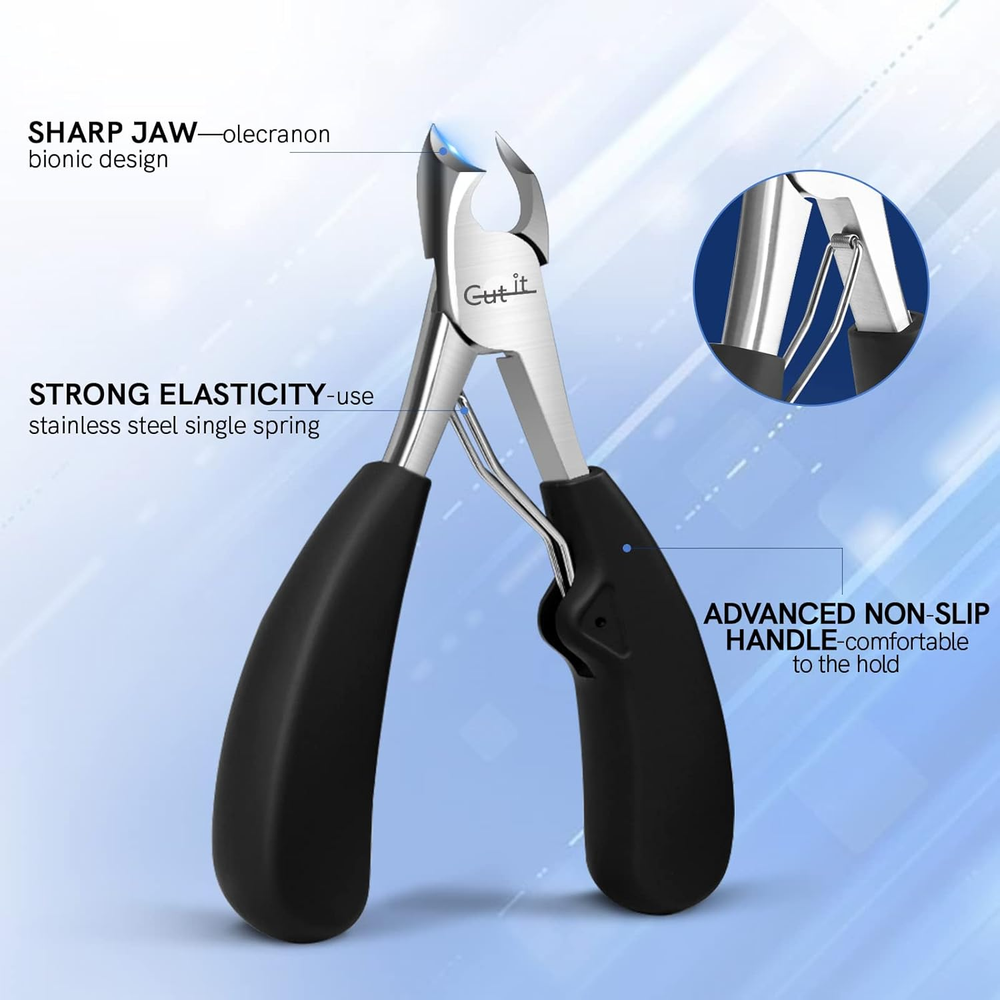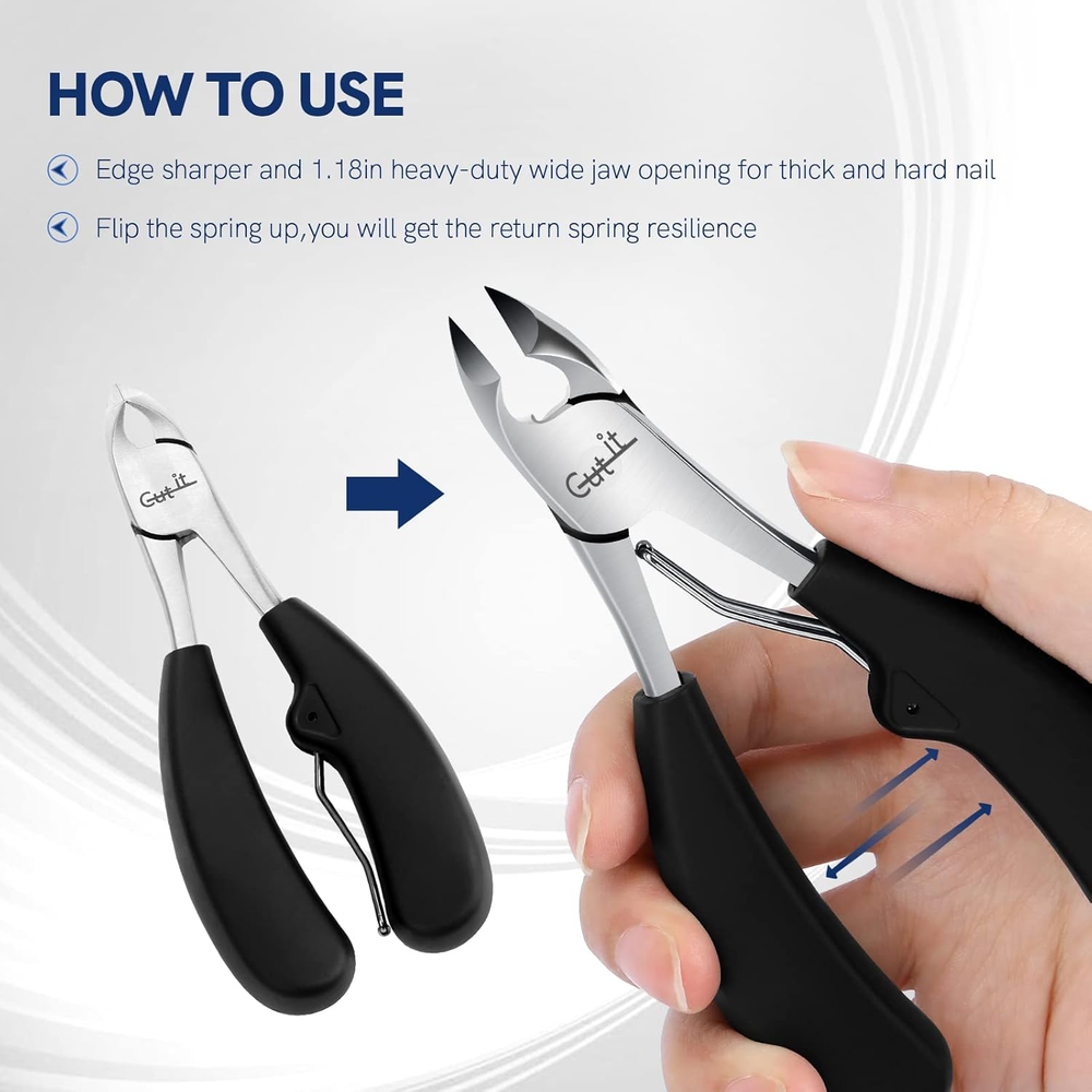SPECIFICATIONS: 4Cr13 Stainless Steel Blade + ABS handle. PROFESSIONAL TOENAIL CLIPPERS: This toenail clippers developed by professional podiatrists, using german cutting technology to keep your nails' health, It combined with the carefully designed curved blade, which gives you an amazing nail cutting experience. SHARPNESS INGROWN TOENAIL CLIPPERS: This ingrown nail cutter has a wide jaw, Which can be opened to 1.18 inches, it can effectively remove the ingrown nails when used, and it will not make you feel pain, and it is effective to help you remove the bad Nails, improve the growth environment of toenails. UPGRADED HANDLE: This professional pedicure tool's handle is made of professional non-slip ABS. When you use it to build your nails, you will find that it is more portable, easy to control and safe, which allows you to go deep into the bad toenail to the greatest extent, Comfortable, firm grip & easy cutting. HEAVY DUTY PEDICURE NIPPER: The high-quality product maintains sharpness and strength over time, allowing for perfect nail trimming with each use, 4Cr13 stainless steel, Washable and rust-free, sturdy and durable. TRUSTED FOOT CARE KIT: Don't forget we offered another cuticle pusher tool in addation, Which gives you a full satisfaction pedicure experience of all time. Package Contains: 1 * Toenail Clipper; 1 * Cuticle Pusher. Perfect present choice to yourself, and relatives on occasions such as Christmas, birthdays, Thanksgiving, Easter, Mother's Day, and Father's Day. Product Description Upgrade Toe Nail Clipper Trimmer W/Cuticle Pusher Crisp clips - Very easy to use Wider cutter opening compared to regular nails clippers makes use on thick toe nails much easier and less painful. Thicker handles gives better grip for those thick toe nails. Multifunctional Large Nail Clipper for Seniors Dual-ended cuticle pusher More suitable for solving various toenail problems