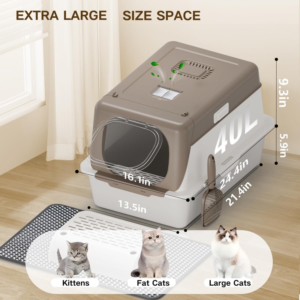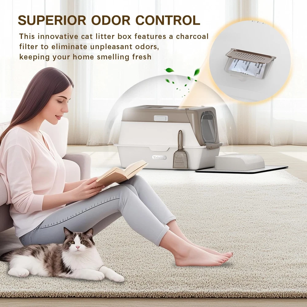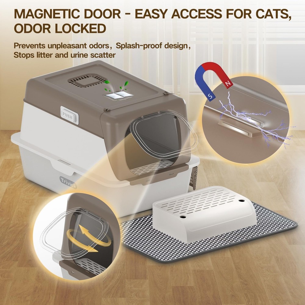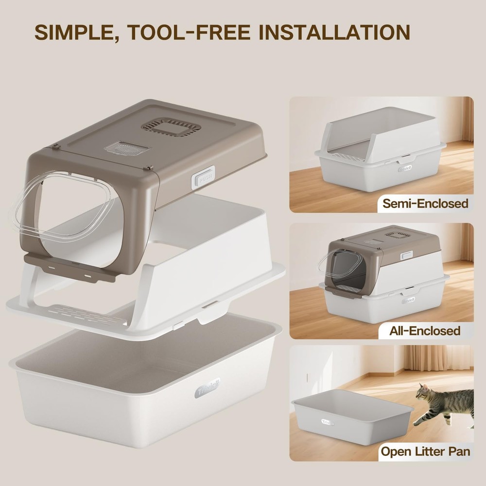 Cat Litter Box with Lid,Front Entry Top Exit Kitty Litter Box,Extra Large Enclosed Metal Litter Box with Litter Scoop & Litter Mat,stainless steel cat litter box, covered litter box for cats, large cat litter box with lid, enclosed cat litter box for odor control, splash-proof litter pan, magnetic door cat box, easy to clean litter box, odor free litter box, litter box with activated charcoal filter, modern cat litter box, anti-stick litter box, litter box for large cats, no smell litter box, high wall litter box, cat potty box, metal cat litter tray, semi enclosed cat box, full enclosed litter box, durable litter pan for cats, cat litter box for apartments, luxury litter box for cats, heavy-duty cat litter box, litter box, cat litter box with ventilation Premium Stainless Steel Litter Pan – Scratch Resistant & Hygienic Unlike traditional plastic trays, this cat litter box features a high-quality stainless steel bottom with a durable powder-coated finish. It’s scratch-resistant, non-stick, and easy to clean—no more lingering odors or trapped litter clumps. Designed to stay cleaner for longer, offering both durability and hygiene for your feline friend. Magnetic Flap Door – Effortless Entry, Superior Odor Control Equipped with a magnetic front door, this litter box allows your cat to enter and exit freely while locking odors inside. The strong seal helps trap smells and prevents litter tracking, making it ideal for indoor use. Keeps your home fresh and clean with every use. Splash-Proof Design – No More Messes Around the Box Thoughtfully designed with raised walls and a smart splash guard system that blocks both scattered litter and high-aiming urine. Perfect for cats that dig or spray. Say goodbye to litter trails and messy cleanup—this kitty litter box keeps your floor spotless. Large Capacity – Suitable for Multi-Cat Homes With a 40-liter internal volume, this litter box offers ample space for one or more cats. Whether you have a kitten or a full-grown feline, the roomy design ensures comfort and convenience. Ideal for busy households or multi-cat families. Dual Mode – Semi-Enclosed or Fully-Enclosed Flexibility Customize your cat’s privacy by using the litter box as either a semi-open or fully enclosed system. The upper lid features ventilation holes to improve airflow and reduce moisture buildup. Comes with a charcoal filter to neutralize odors and purify the surrounding air. Easy to Assemble & Clean – Includes All Accessories This large cats litter box comes with everything you need, including a charcoal filter, litter mat, Litter Trap Step and all necessary fasteners. Simple installation takes just minutes, and the smooth stainless steel base resists sticking and residue. Less time cleaning, more time playing with your pet.