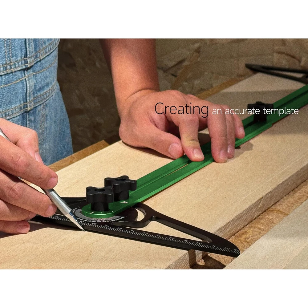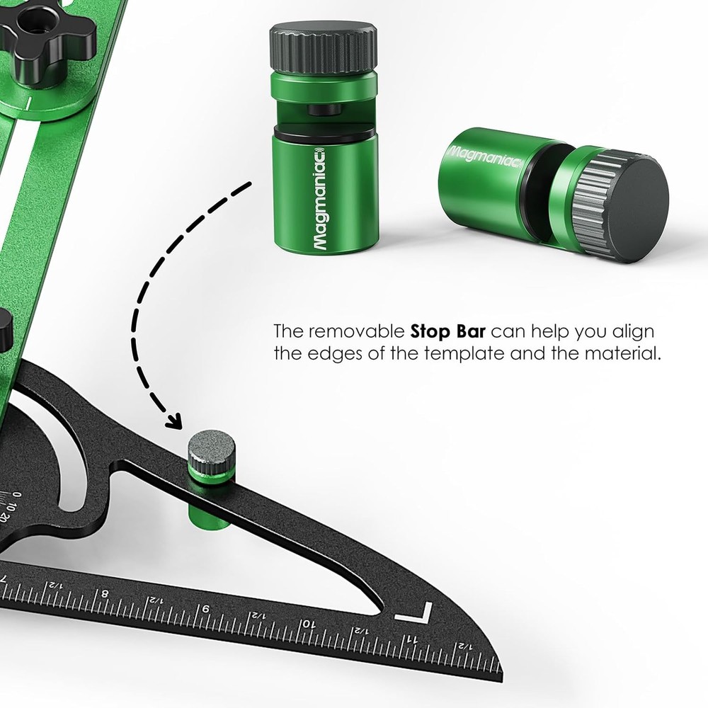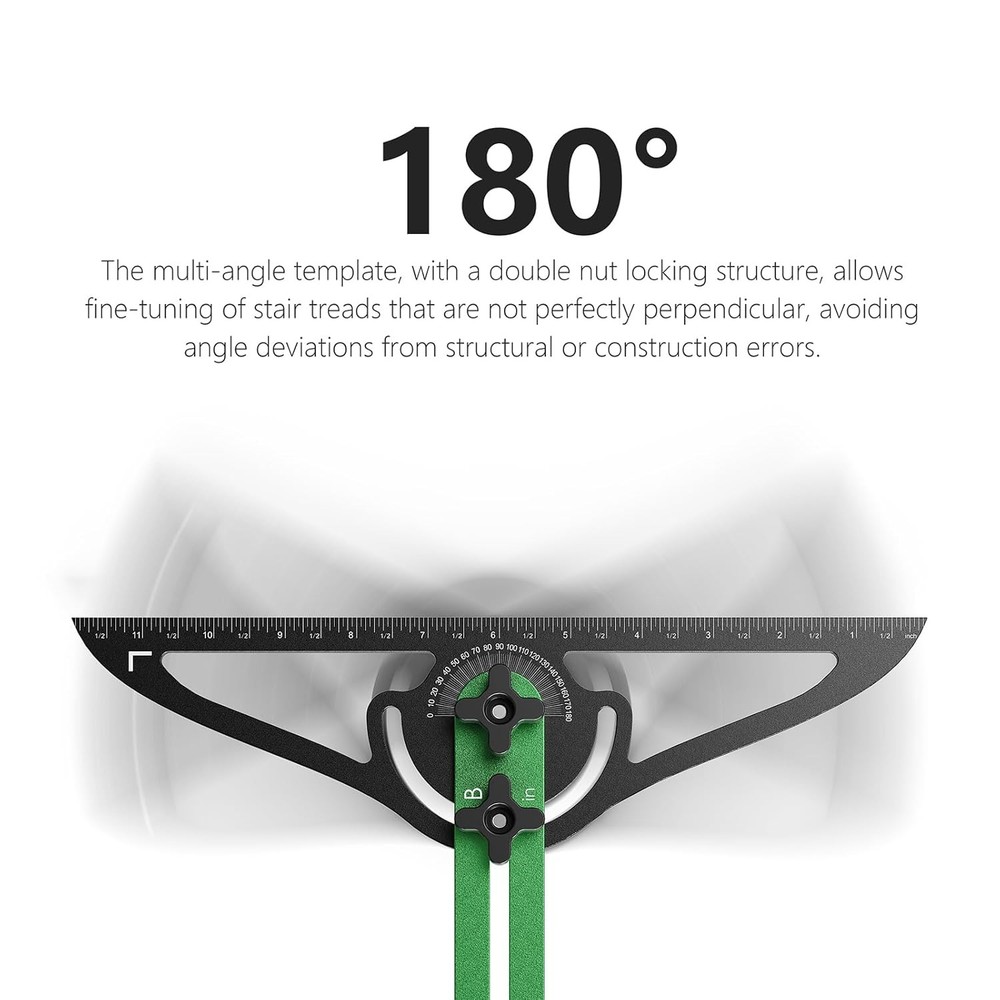 Stair Tread Template Tool– Dual Nut 60.1 INCHES, Green-Black Product Details Package Dimensions : 17.56 x 4.09 x 2.24 inches; 2.56 Pounds Item model number : STB-G Manufacturer : Magmaniac Country of Origin : China Material: Magmaniac Brand: Magmaniac Color: Green-Black Shape: Tread Template Item Form: Rod ✔ [Enhanced Locking Mechanism]*– Our upgraded rotatable scribe now locks even more securely without the need for rubber gaskets. Thanks to the double screw nuts between the ruler and template, this feature ensures the stairs tool stays firmly in place throughout your work, providing better stability and completely replacing the need for gaskets. ✔ [Simple Stop Mechanism] Quickly set the stair tread depth by placing the stops on both sides and tightening the knobs. When you’re done, just hang them on the stair tread tool jig or stick them to any metal surface. ✔ [Modular Design for Flexibility] – This stair tread scribe tool comes with three extension parts: 16 inches (A), 12 inches (B), and 8 inches (C). You can mix and match them based on your project’s needs, with a measurement range stretching from 16.2inches all the way up to 60.1inches. It’s a truly customizable tool for any task. ✔ [Perfect for Multiple Woodworking Projects] – Whether you're installing wooden floors, crafting stair treads, or measuring for closets and windowsills, this stair jig has you covered. Its wide range of applications makes it essential for both hobbyist woodworkers and professionals. ✔ [Built to Last with Premium Materials] – Constructed from 4mm thick aerospace-grade aluminum alloy, this step template tool is tough enough for any job. The CNC anodized finish offers excellent durability, while the electroplated markings are sharp and accurate, making it a reliable choice for measuring stair treads, risers, shelves, and more.
