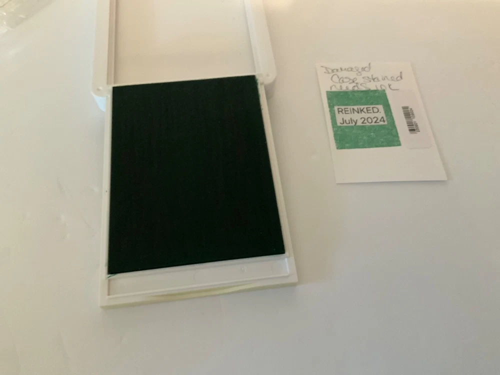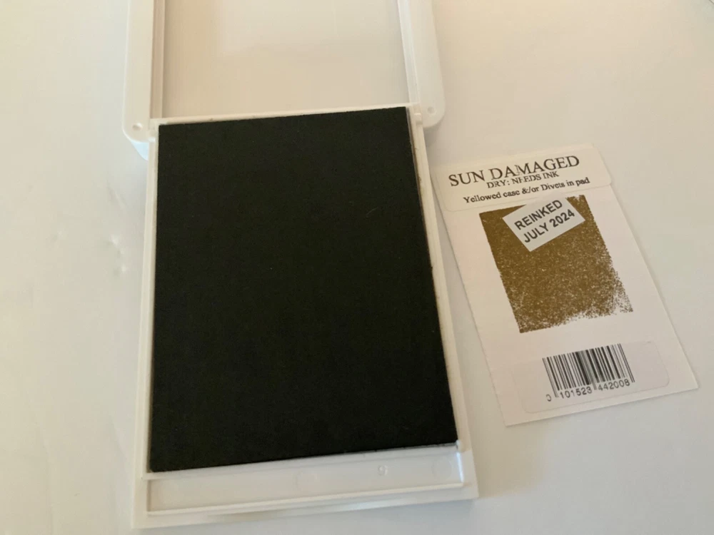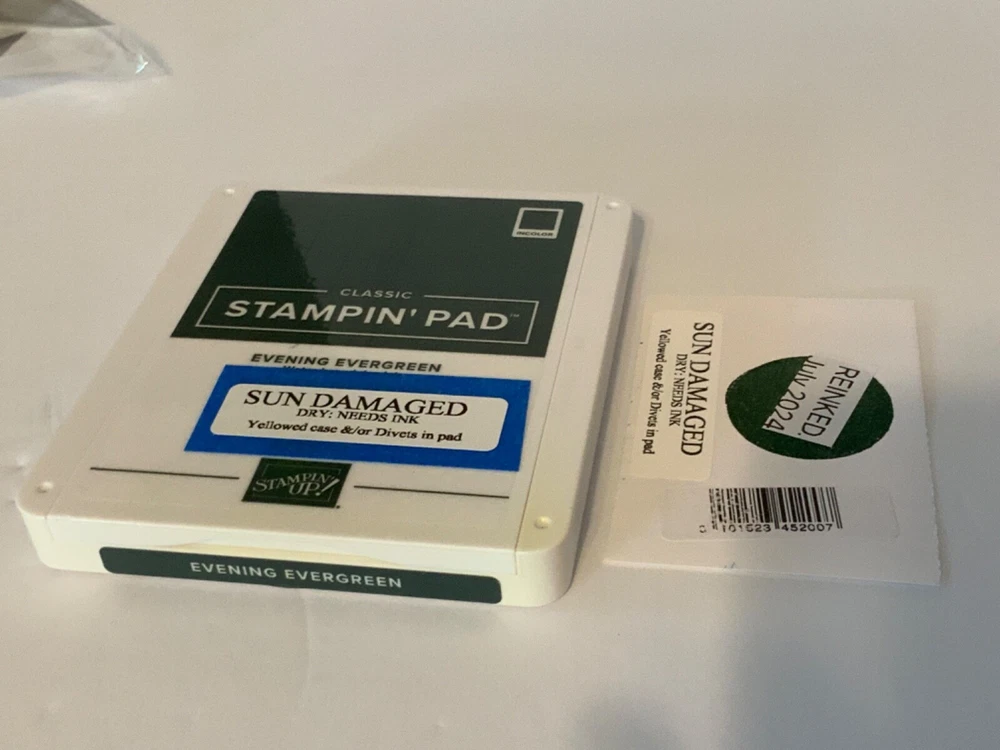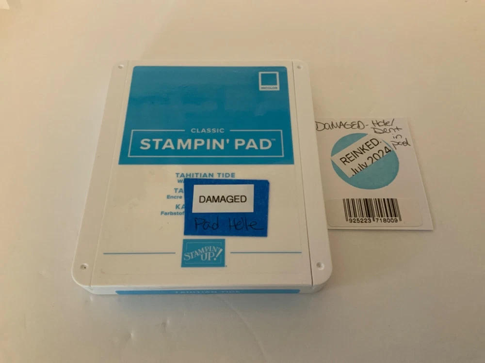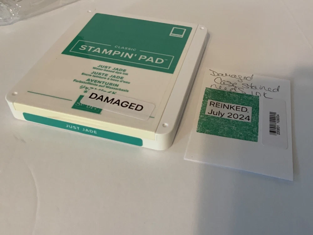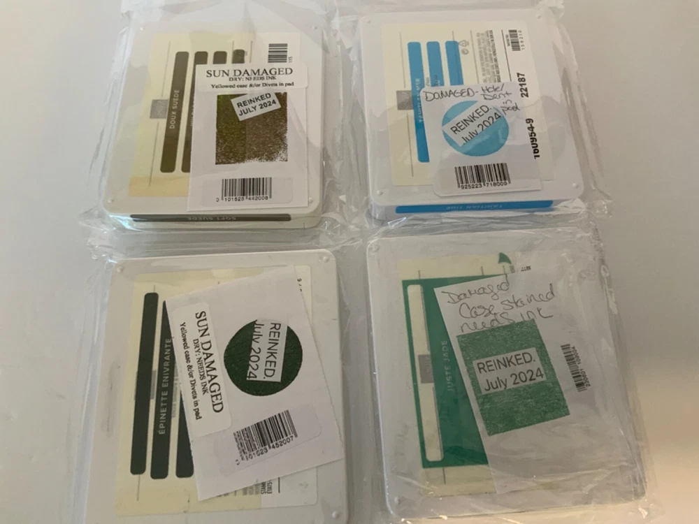 AS IS. These pads are DAMAGED in some way. Each pad has a card with the color stamp that states what is wrong with that pad. Please see photos. Just Jade: Yellowed case Tahitian Tide: Hole in pad Evening Evergreen. Yellowed case Soft Suede: Yellowed Case I have just put fresh ink on each pad. Sets are sold AS IS, I will not break up sets into different colors. I do have separate listings with single colors if you are looking for a particular color. These are pads that did not make the quality cut for my regular listings.