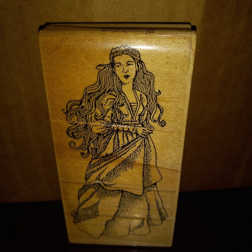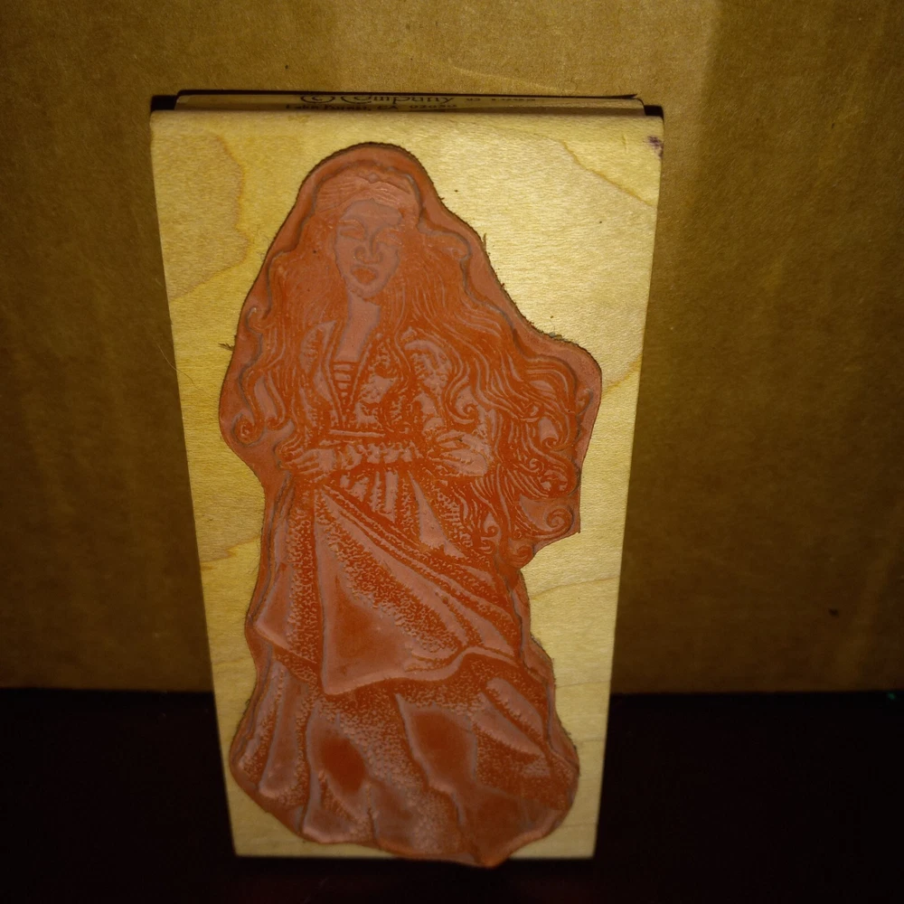 Stampington Company Sarina Lady Rubber Stamp 1993 Meaures Approx: 5" Stampinton Compay Year: 1993 Used Condition May Have Writing On Wood, Sticker Residue or Dings