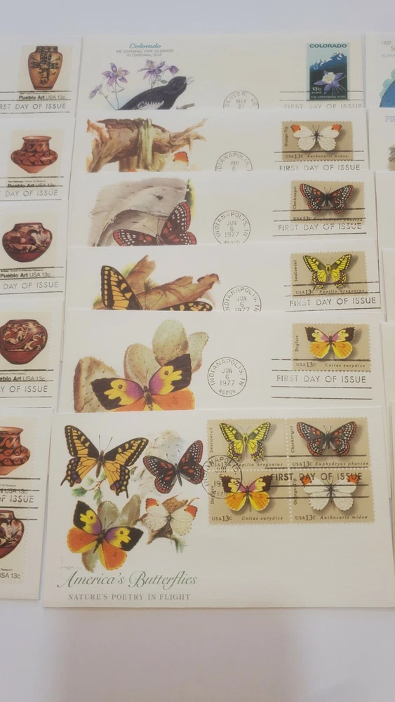 Please visit our store category "Stamps" to purcase many mint lots of fdc stamps. We offer a huge assortment from a massive collection that spanned over 90 years of FDC. fleetwood mint fdc lot Pottery pueblo art Butterflies Energy conservation Lindberg Edison listings are weighed and measured to charge the least amount in shipping as possible given usps rates. combined shipping is available upon request. message us for a combined shipping invoice after purchasing, but before paying for order and we will adjust shipping charge accordingly. we are in the process of liquidating a huge stamp collection for the lowest prices researched through ebay history. thanks so much for your interest!