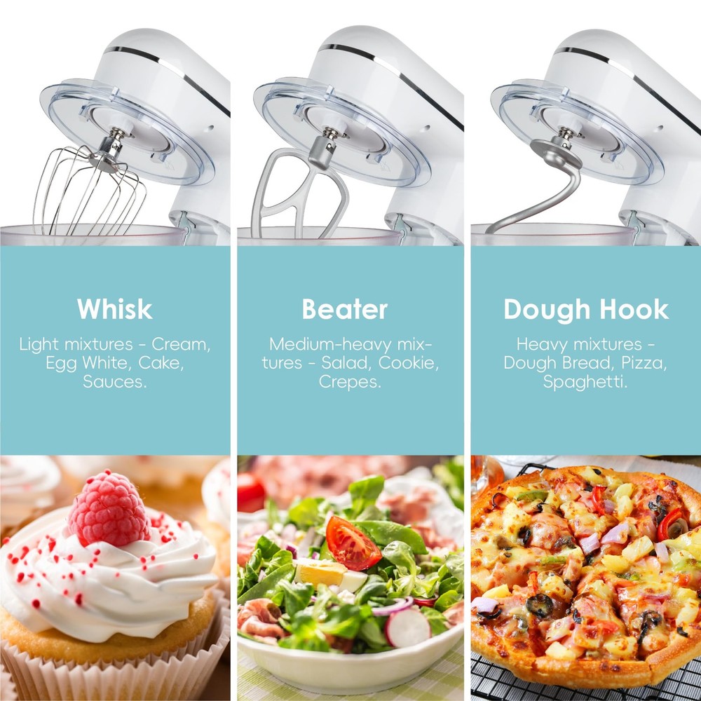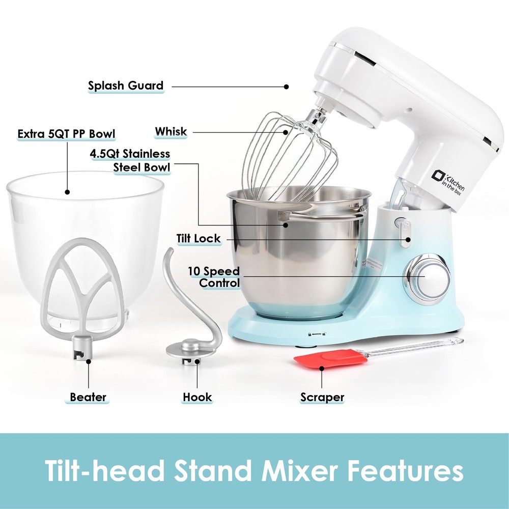 4.5QT+5QT Two Mixing Bowls- Our Stand mixer equipped with 4.5Qt stainless steel bowl and 5QT extra food safe plastic mixing bowls, perfect for a variety of mixing and baking needs. Special Nesting design for nest two bowls together and offer space-efficient storage. 10 Speeds and Tilt Head Design - This Kitchen mixer has 10 different speed options,suitable for mixing bread dough, thick batters, meringues, and whipping cake cream, plus lower speeds for stirring and finessing your most delicate concoctions,could suit perfectly to different ingredients. Tilt-head design mixer allows access to install or uninstall bowls and accessories easily. Upgraded Accessories and Dishwasher Safe- Aluminium dough hook and flat beater with protection layer,stainless steel whisk are all easy to attach,more sturdy and durable. All of the attachments for the food mixer are dishwasher-safe for quick and easy cleaning. Elegant Designed And More Color Options - The electric mixer with modern design look, not only work well but also look well. Nested bowls design for space-saving Perfectly suitable for various of your household baking need. And multiple colors to choose,meet a variety of aesthetic needs for your kitchen. Excellent Gift and Support - The electric stand mixer is also an ideal gift for your family and friends. We have confidence in the quality of our products, if you have any questions when received or during your using, please feel free to contact us via Amazon. We provide 24/7 online after-sales service for you.
