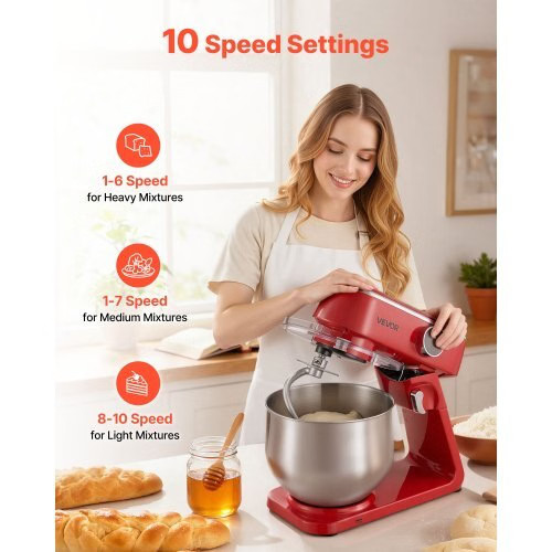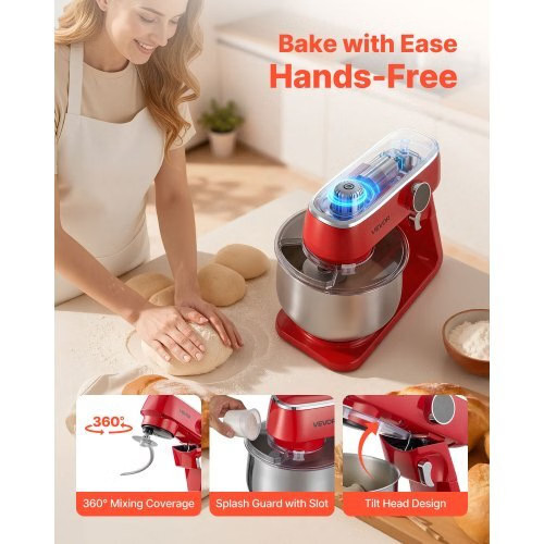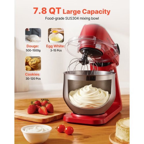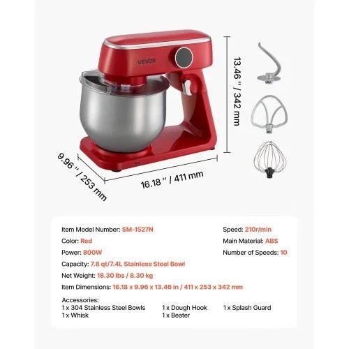 VEVOR Stand Mixer, 7.8 QT Electric Kitchen Mixer, 800W Dough-Mixer,10 Speeds Tilt-head Food-Mixer with Stainless Steel Bowl, DoughHook, Whisk, Beater, for Baking, Mixing, Whipping & Kneading,Red Splash Guard with Slot Tilt-Head Design Anti-slip Feet Tilt-Head Design for Effortless Use Easy to Clean Thoughtful Design Speed: 210r/min,Capacity: 7.8 qt/7.4L Stainless Steel Bowl,Color:Red,Item Model Number: SM-1527N,Product Dimensions: 16.18 x 9.96 x13.46 in / 411 x 253 x 342 mm,Number of Speeds: 10,Net Weight:18.30 lbs / 8.30 kg,Power: 800W,Main Material: ABS
