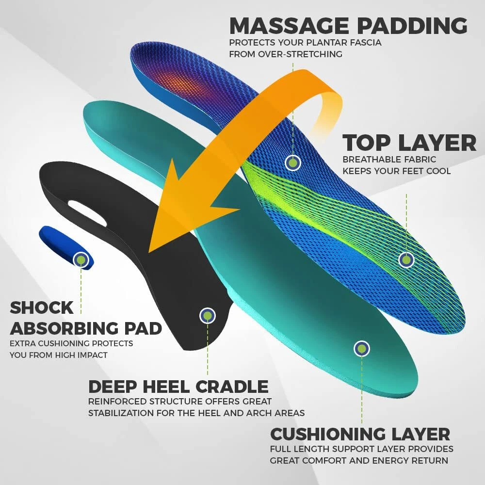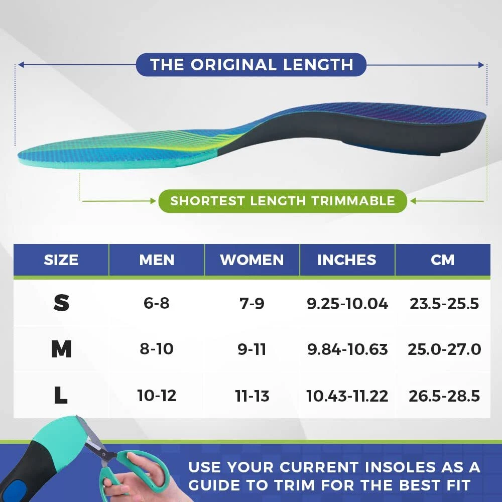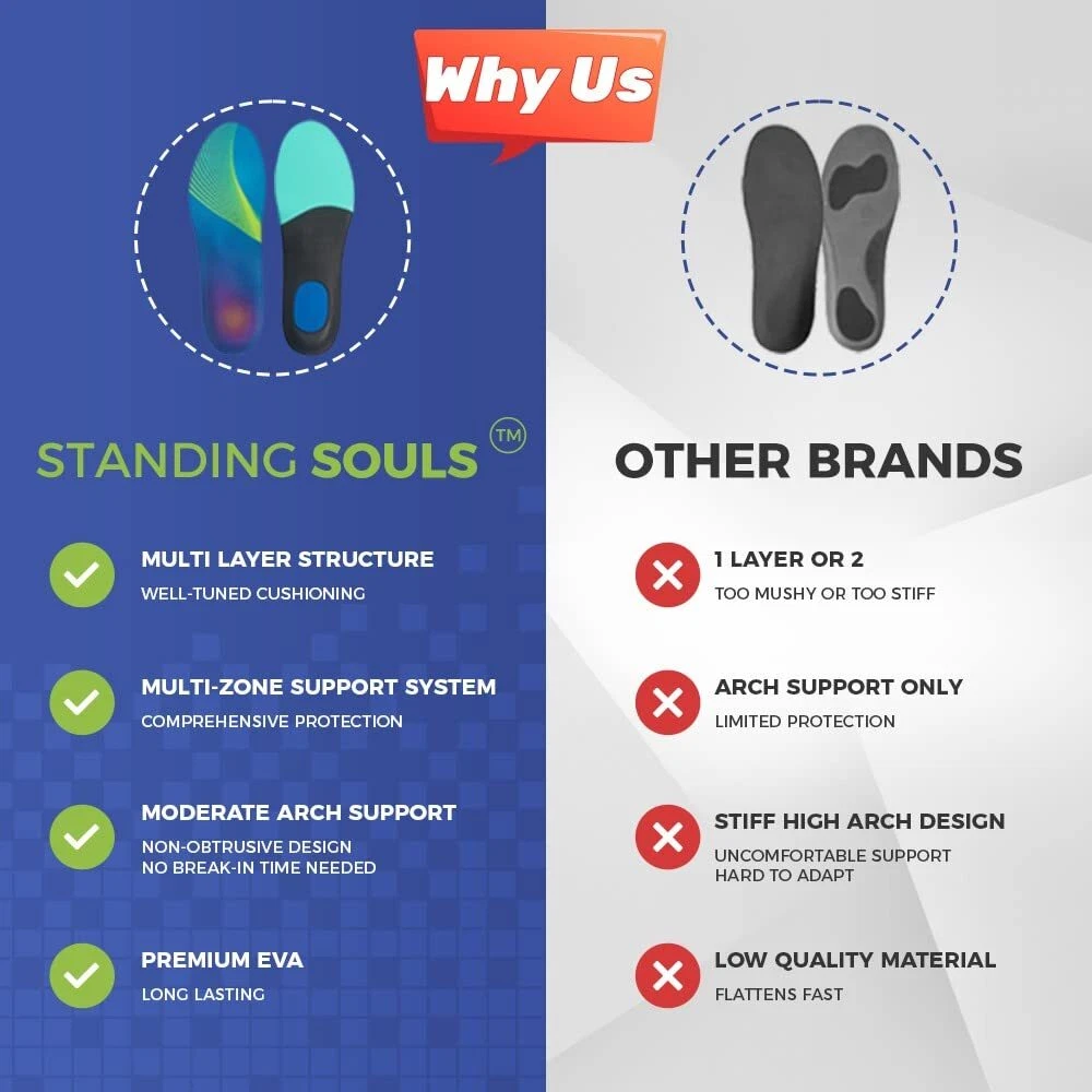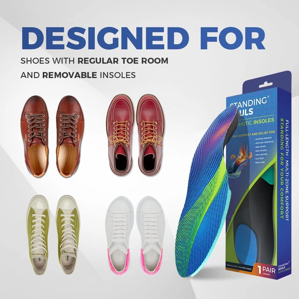 Standing Souls All-Purpose Comfort Insoles, Shock Absorption Sports Shoe Inserts with Arch Support for Men and Women, Work Boots Insoles for Standing All Day, Trim to Fit Inserts Standing Souls Athletic Orthotic insoles are designed to fit any arch type. Our insoles offer well-tuned cushioning as opposed to the super mushy/stiff ones in the market. The moderate arch support provides the right amount of protection and pain relief for Plantar Fasciitis, Flat Feet, Heel Spurs and more. It is also the perfect alternative to your stock insoles for better comfort and odour control. LASTING COMFORT & BREATHABLE - Standing Souls anti fatigue work insoles provide maximum foot comfort and will keep your legs and feet full of energy all day. Our shoe insoles design ensures air circulation and keeps it breathable. The moisture-absorbing fabric of the top layer lets your feet feel cool and dry all day long. ARCH SUPPORT & DEEP HEEL CRADLE- Motion control and body alignment are made possible by the deep heel cup and shape of the arch shell, which provide reinforced support and stabilization to the arch and heel areas. This guarantees that the stress is distributed equally across all joints and muscles, relieving fatigue and pain and avoiding injuries. CUSHIONING SHOCK ABSORPTION- Standing Souls moderate arch support insoles have a full-length customized soft cushioning layer, which is enhanced by shock-absorbing cushioning pads. Leg weariness is decreased by these features, which also distribute the load, relieve stress in high-pressure zones, and redirect energy back to the foot and leg. Additional shock absorbing padding adds extra protection for your heels from repetitive shocks. TRIM To FIT - We offer 3 different sizes: S, M and L. For example, size M fits US Men's 8-10 / Women's 9-11. You can also refer to our detailed Size Guide for the exact length info. We recommend using your current insoles a guide to trim our shoe inserts for the best fit. DESIGNED FOR EVERYDAY USAGE - The low-profile design are ideal for daily use and provides moderate control and support. With our arch support insoles, you can participate in any sport - these inserts fit most types of footwear: from work boots to sneakers, dress shoes and specialized shoes such as cleats, golf shoes, snowboarding boots and etc. Taste an improved quality of life with Standing Souls shoe inserts! Shipping from the USA All of our products are shipped from the USA, ensuring quick delivery to your destination. Payment We offer the following payment methods: PayPal, credit card, bank transfer, and eBay's secure payment system. Free Shipping & Free Returns Shipping within the USA is FREE. Additionally, any return is absolutely free for you. Risk-Free Purchase You have the option to return an item within 30 days without any justification. We cover the return shipping costs! Fast Shipping We ship immediately upon receipt of payment. Generally, the package is delivered within 2-3 days in the USA. If it takes longer, we will contact you. Quality and Costs Made in Europe, USA, China No customs fees or additional charges Total satisfaction guarantee Invoice with declared VAT available upon request in .pdf format Feedback Your feedback is very important to us. After you pay for your purchase, you will automatically receive positive feedback from us.