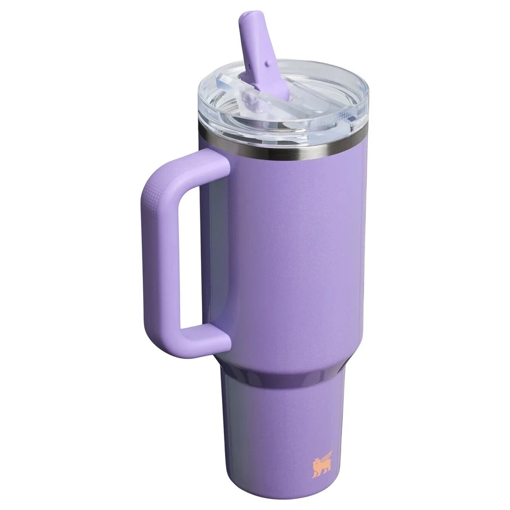 PRESALE The Stanley 40 oz. Quencher H2.0 Frequency Collection in Periwinkle Shimmer is a stainless steel tumbler designed for both hot and cold beverages. It features a solid color design with a drink-through lid, keeping drinks cold for up to 11 hours and hot for up to 7 hours. This limited edition tumbler is equipped with a handle, lid, and straw, making it suitable for various activities and suitable for both teens, boys, girls, and adults. Its 40 oz capacity and insulated material ensure that your beverages stay at the desired temperature for a long time.