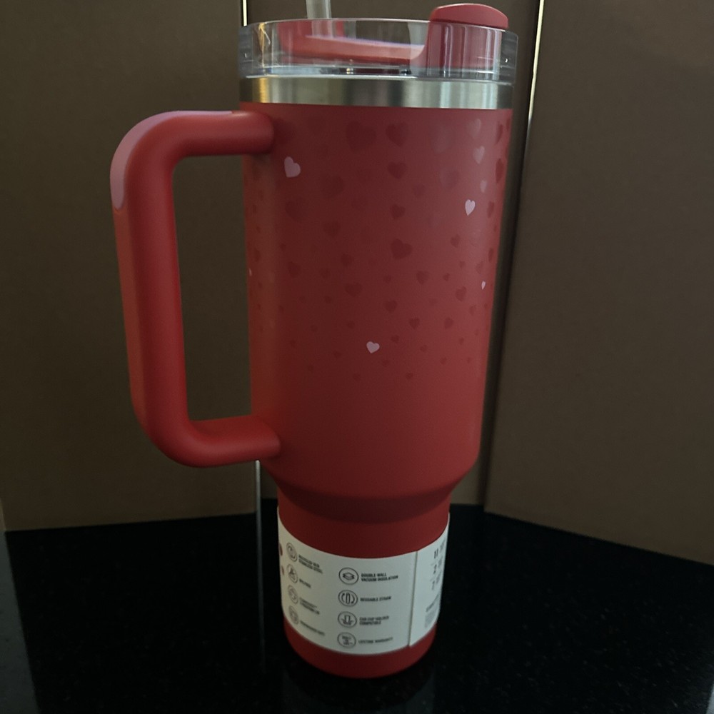 The Stanley Target Exclusive Red Valentine's Day Heart Tumbler is a 40oz stainless steel tumbler featuring a red color with ruby hearts pattern. It is designed for both hot and cold beverages and comes with a lid and straw. The tumbler is insulated to keep drinks at the desired temperature and is part of the limited edition Stanley collection. Perfect for those who appreciate love and hearts themes in their drinkware.