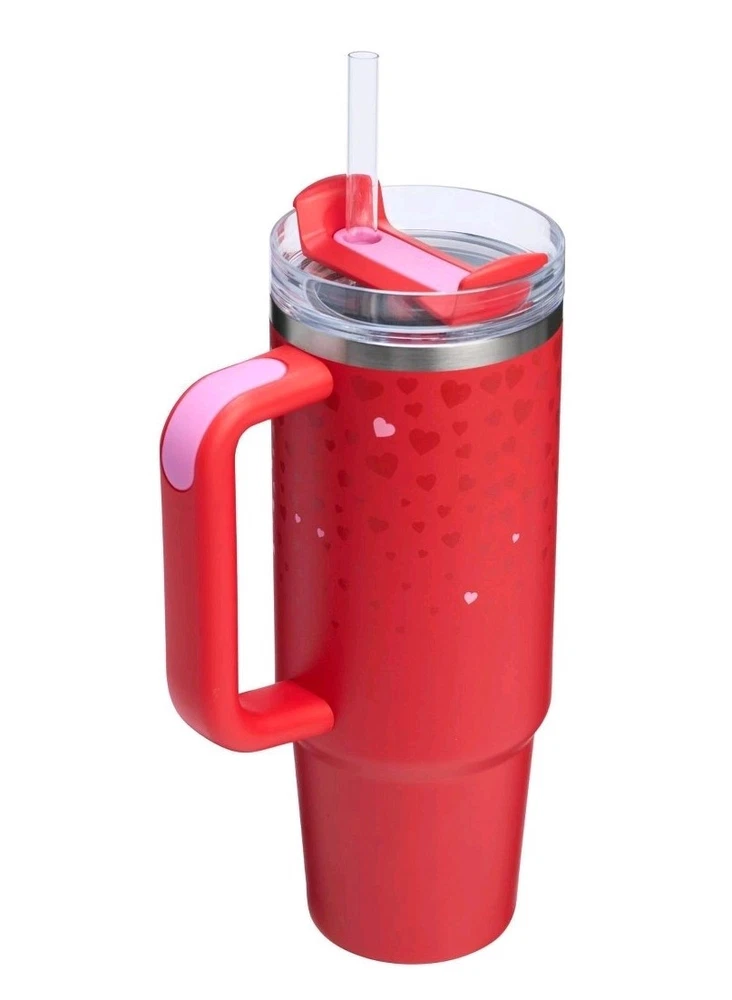 Stanley's Target Exclusive Valentines Day 2025 Ruby Hearts 30 Oz Tumbler is a stylish and functional drinkware set that includes a cup, lid, and straw. Made of recycled 18/8 stainless steel in a heart-shaped design, this tumbler features a ruby red color perfect for Valentine's Day. It is dishwasher safe, insulated, and comes with a lifetime warranty, making it a perfect gift for boys, girls, and adults who enjoy the Flowstate Quencher experience.