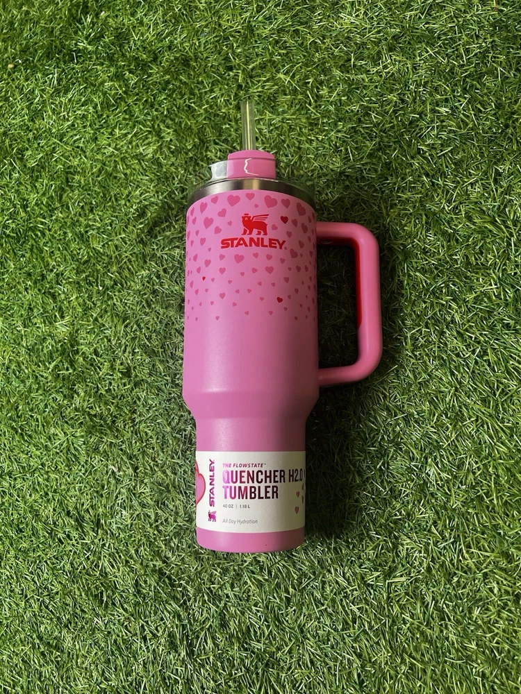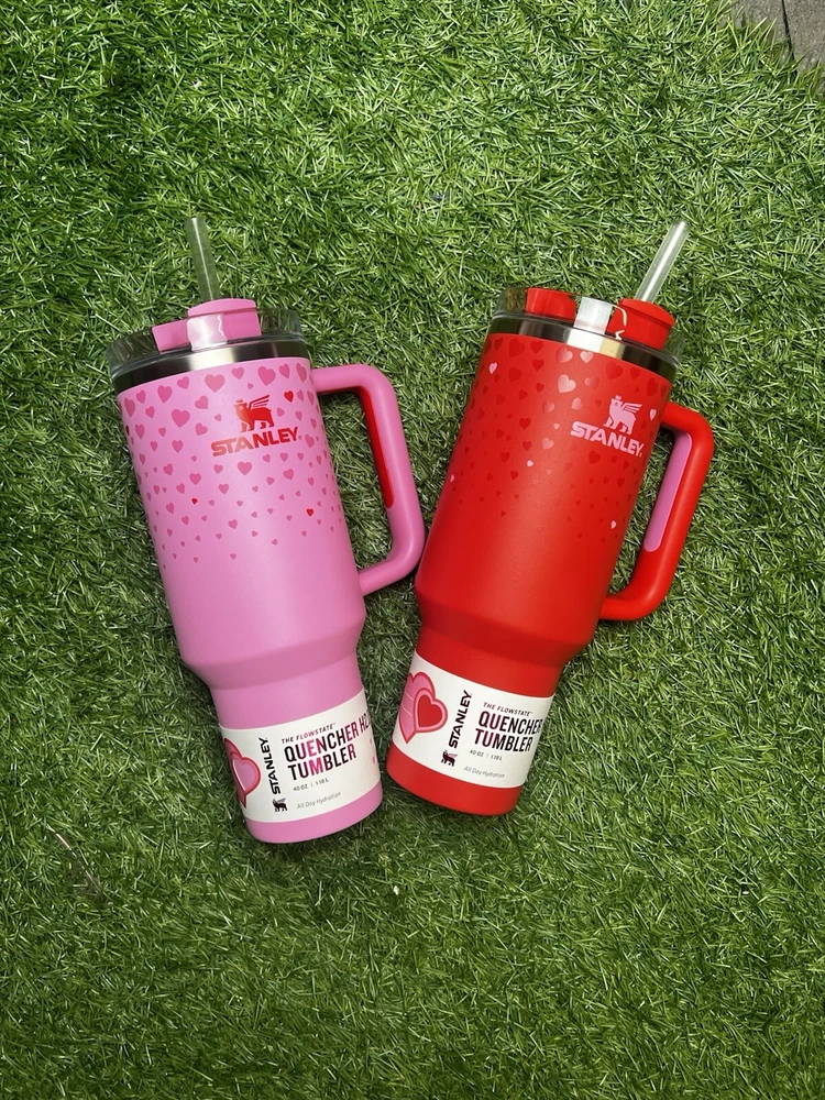 The Stanley x Target Exclusive Valentine's 40 Oz Tumbler in the Sweet Hearts design is a heart-shaped tumbler perfect for celebrating love on Valentine's Day. Made of pink stainless steel, this tumbler features a love and hearts theme, complete with hearts pattern and a handle for easy carrying. The tumbler set includes a straw, making it convenient for enjoying your favorite beverages in style. Perfect for adding a touch of romance to your drinks while on the go or at home.